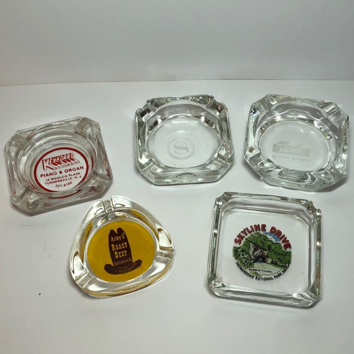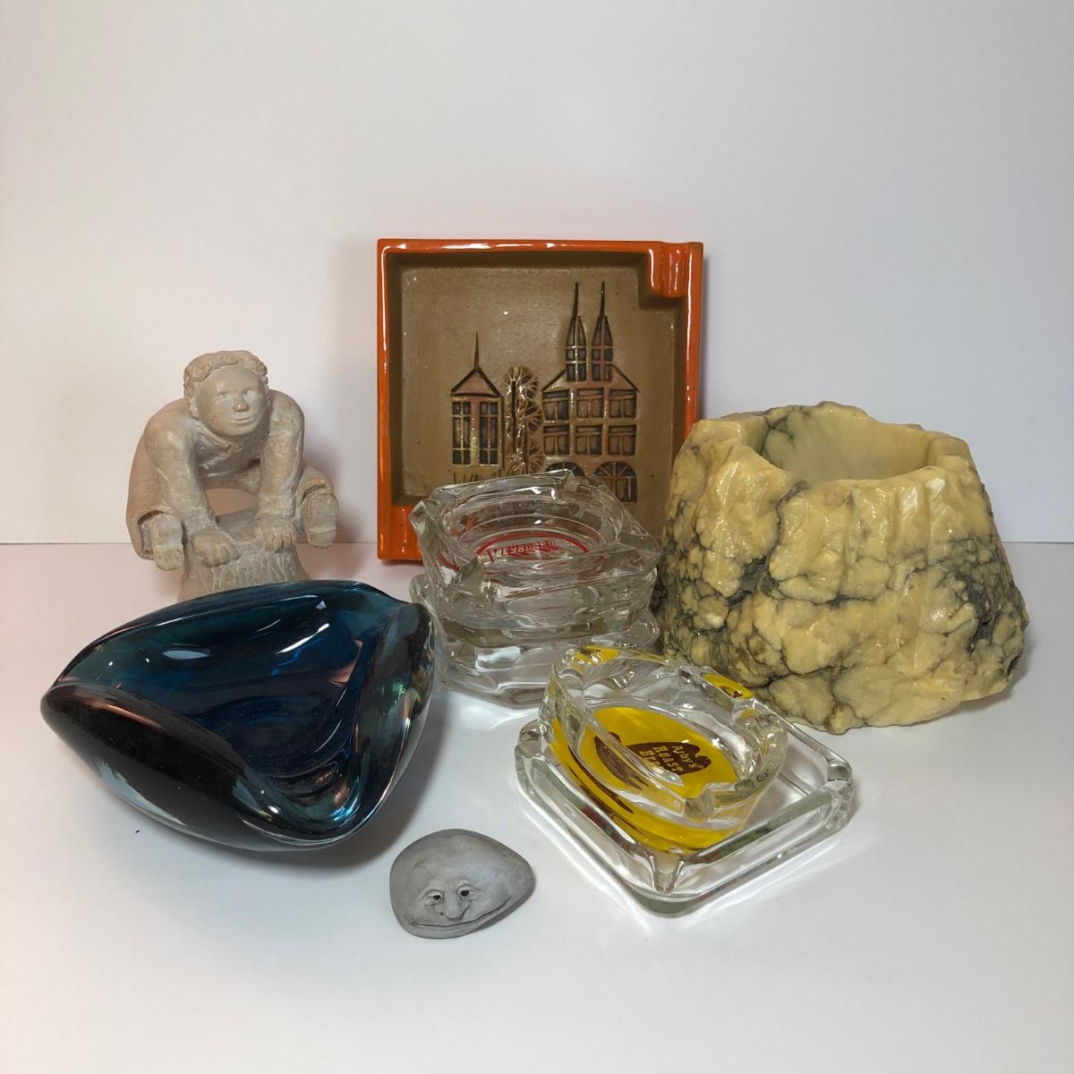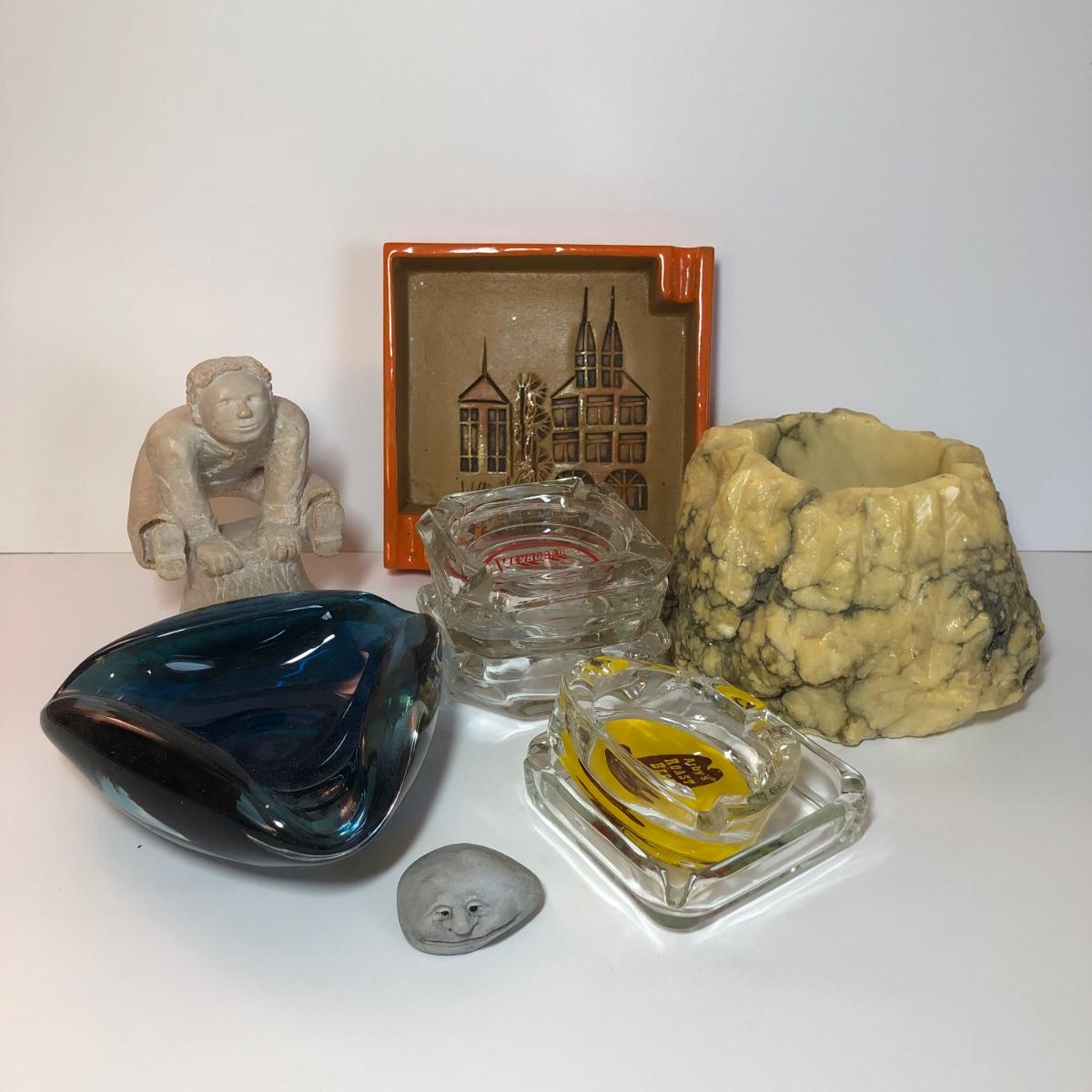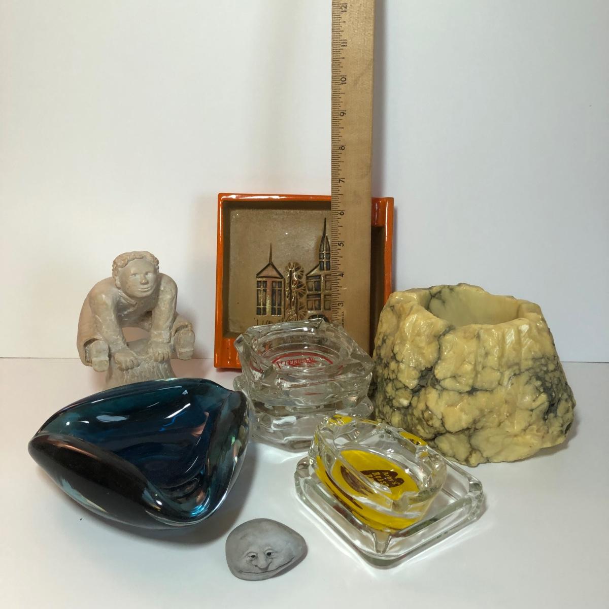 Includes a large alabaster ash tray, a triangular blue glass ash tray, an orange Italian ash tray and ash trays from various businesses. Also includes a small sculpture and rock with a face.