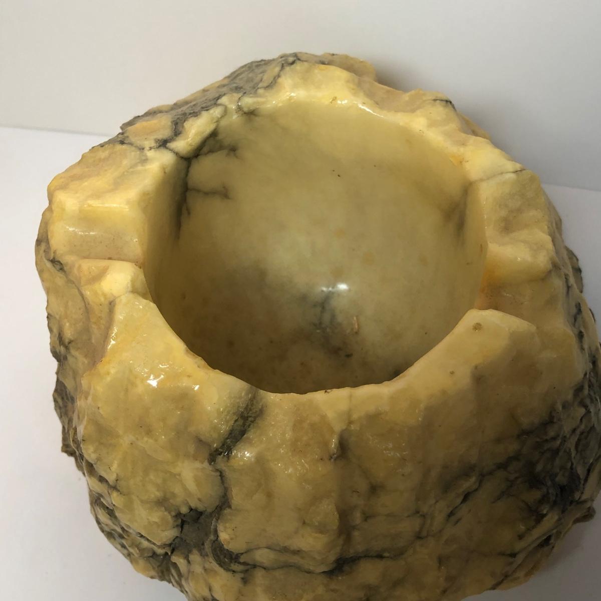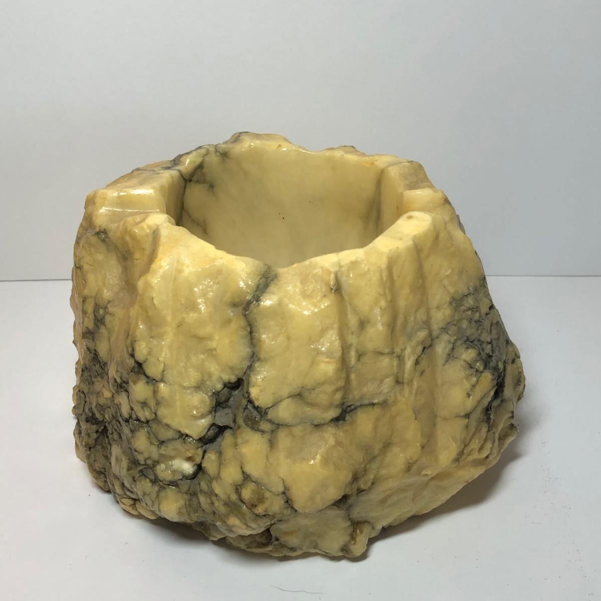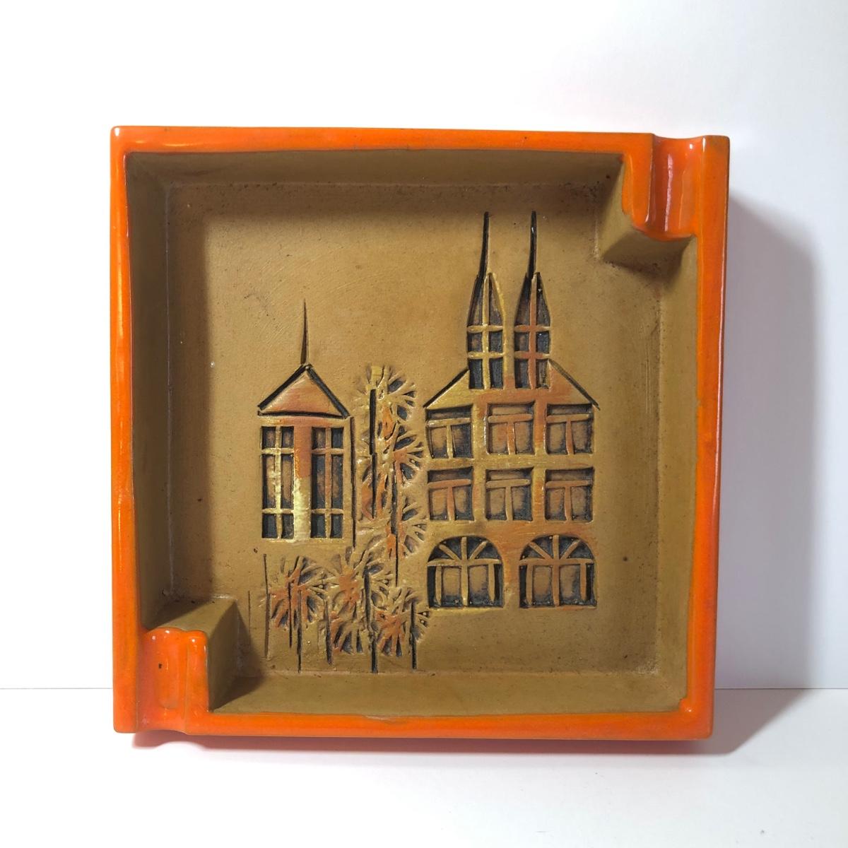 Includes a large alabaster ash tray, a triangular blue glass ash tray, an orange Italian ash tray and ash trays from various businesses. Also includes a small sculpture and rock with a face.