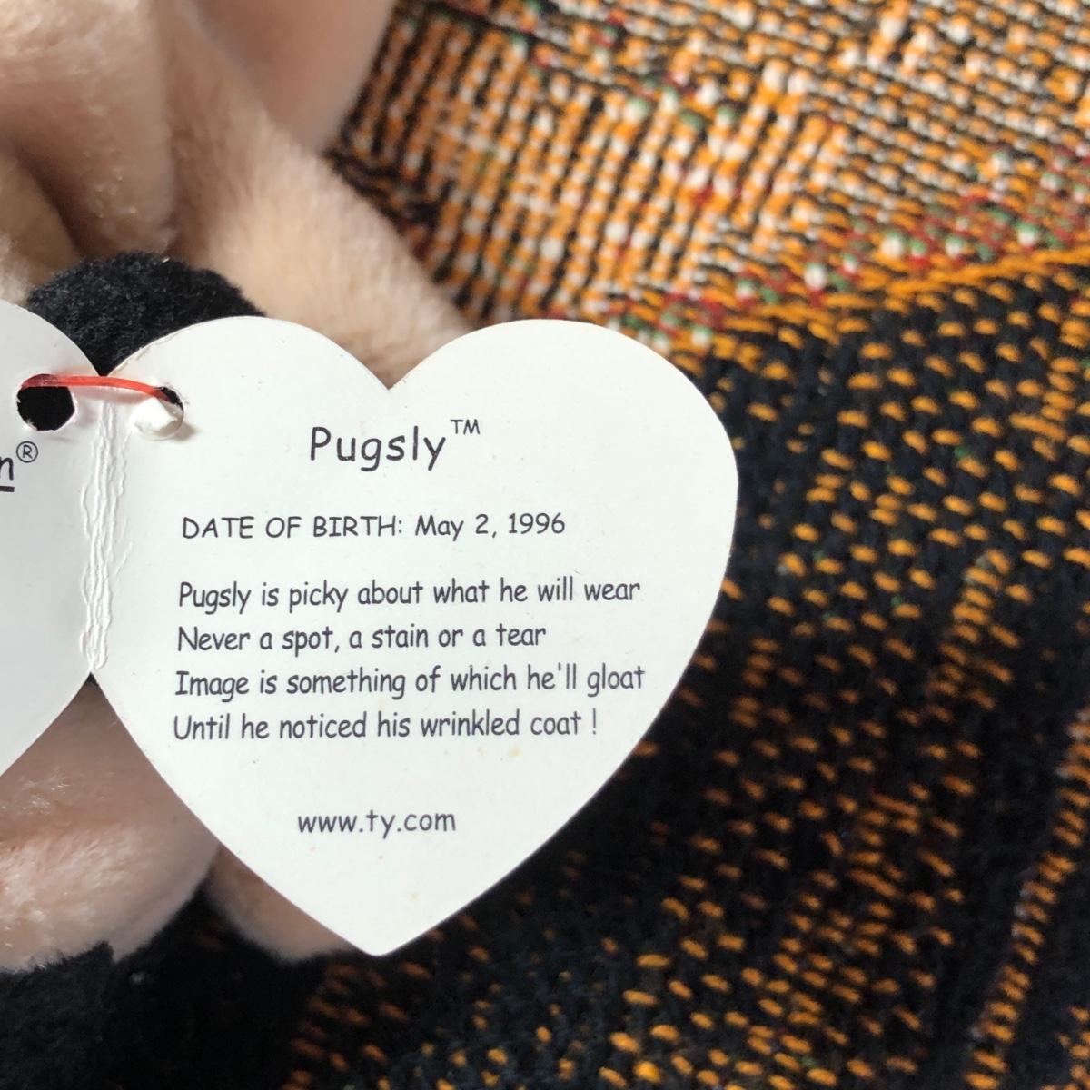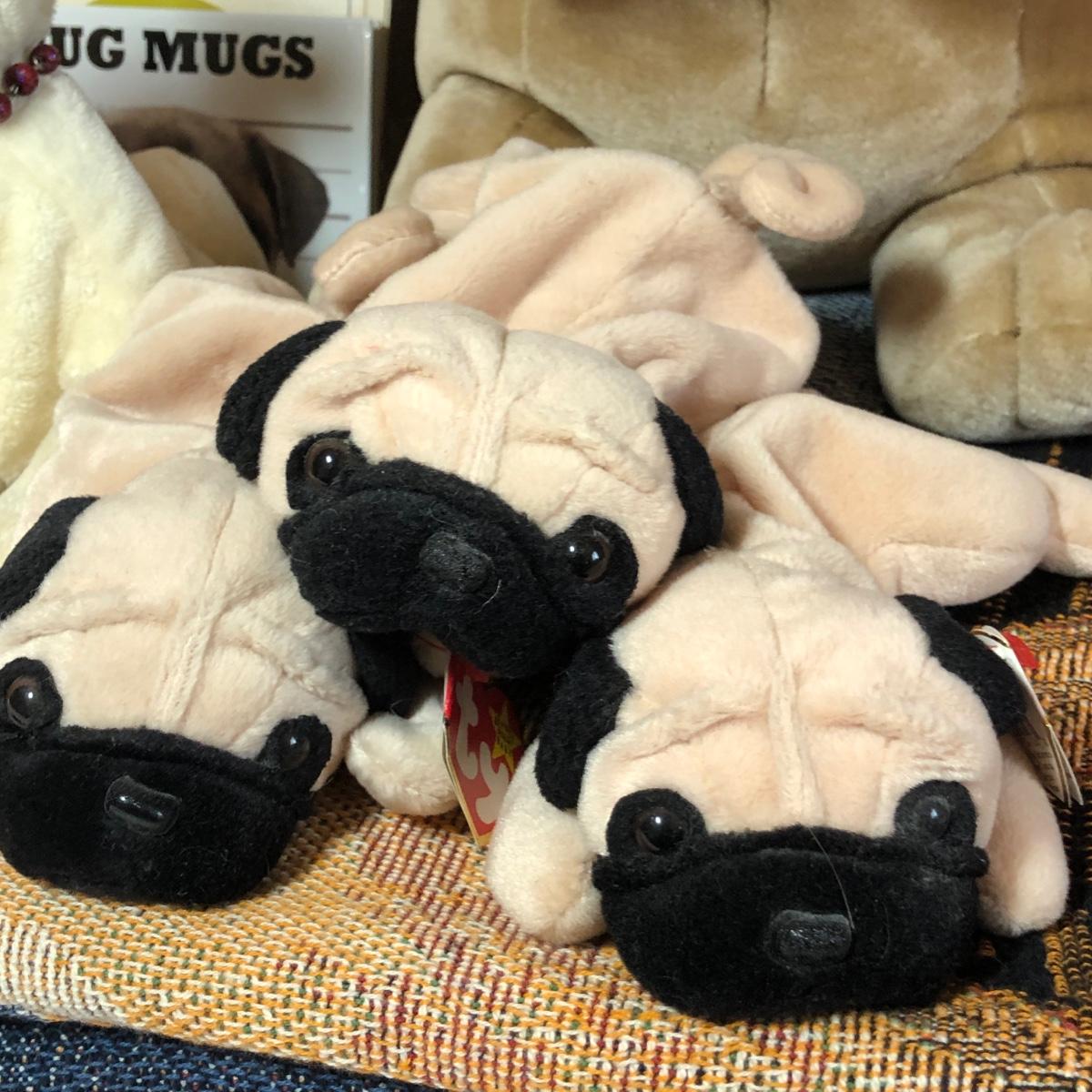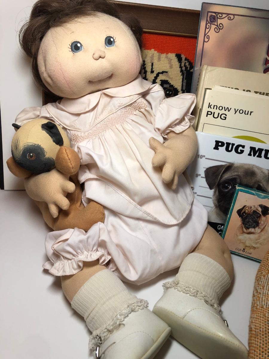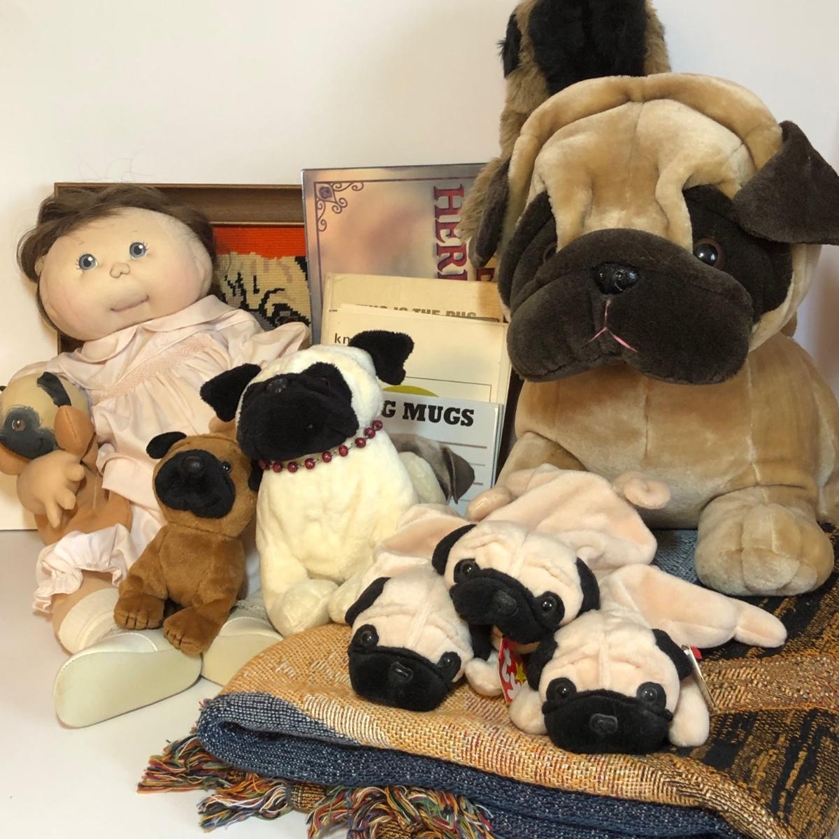 Includes pug stuffed animals featuring Ty Beanie Baby Pugsly, a puppet, a throw blanket in good condition with no noticeable stains, a deck of cards, some pug themed books, a cloth doll holding a pug, a framed pug needlepoint, and a sign with a pug on it that says "I live here."