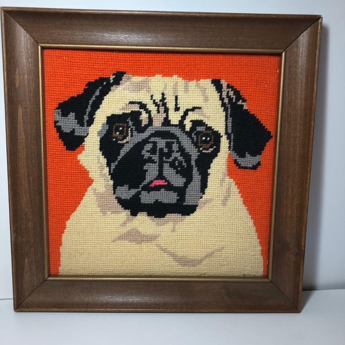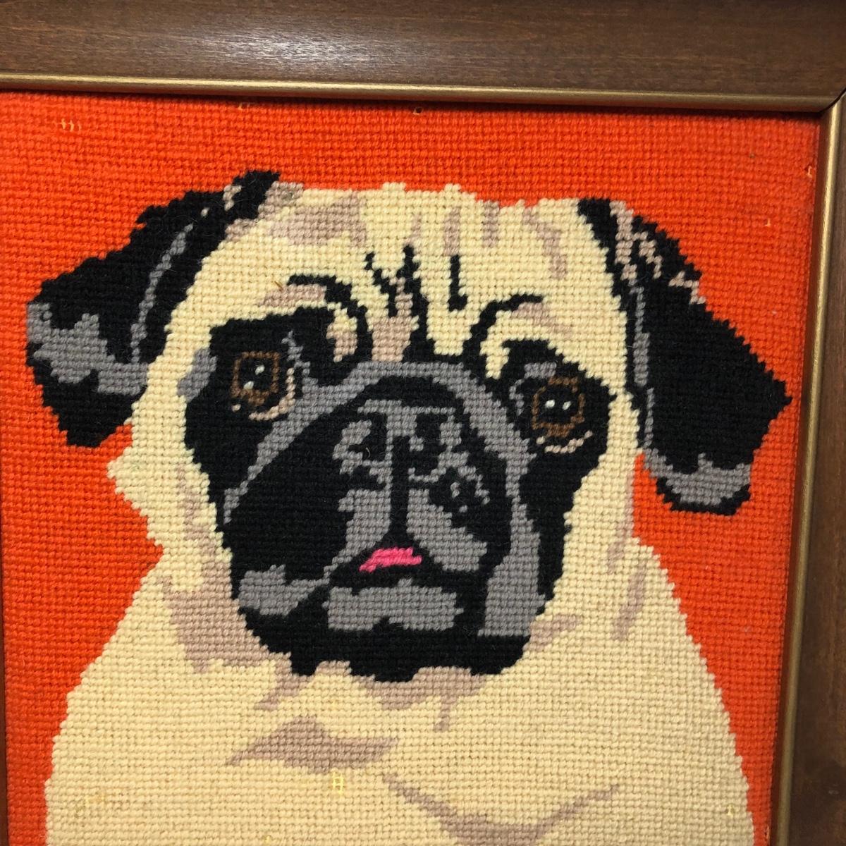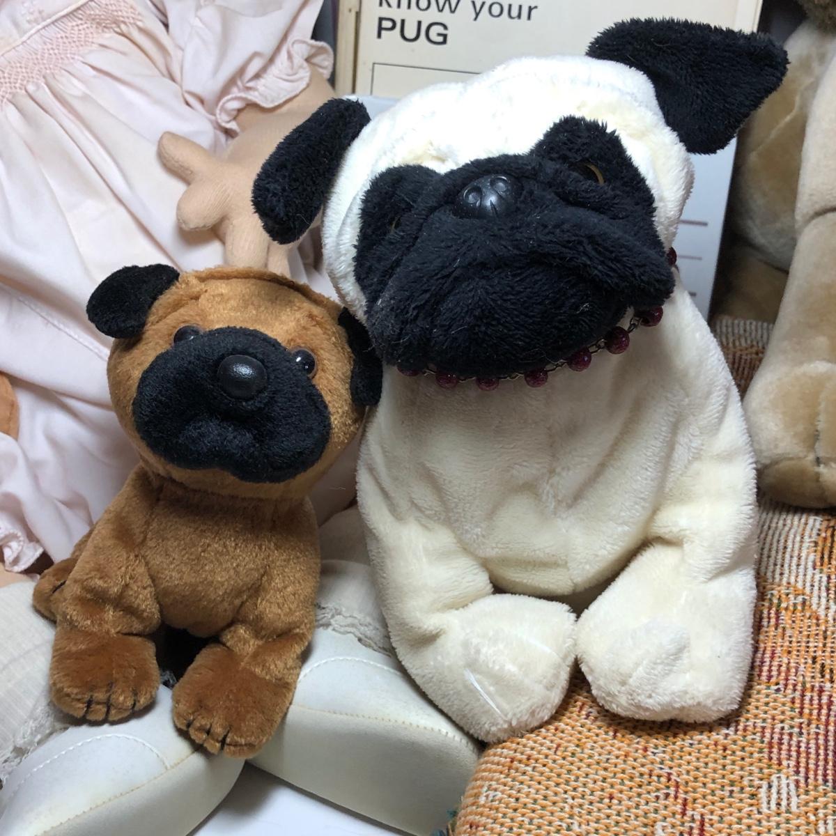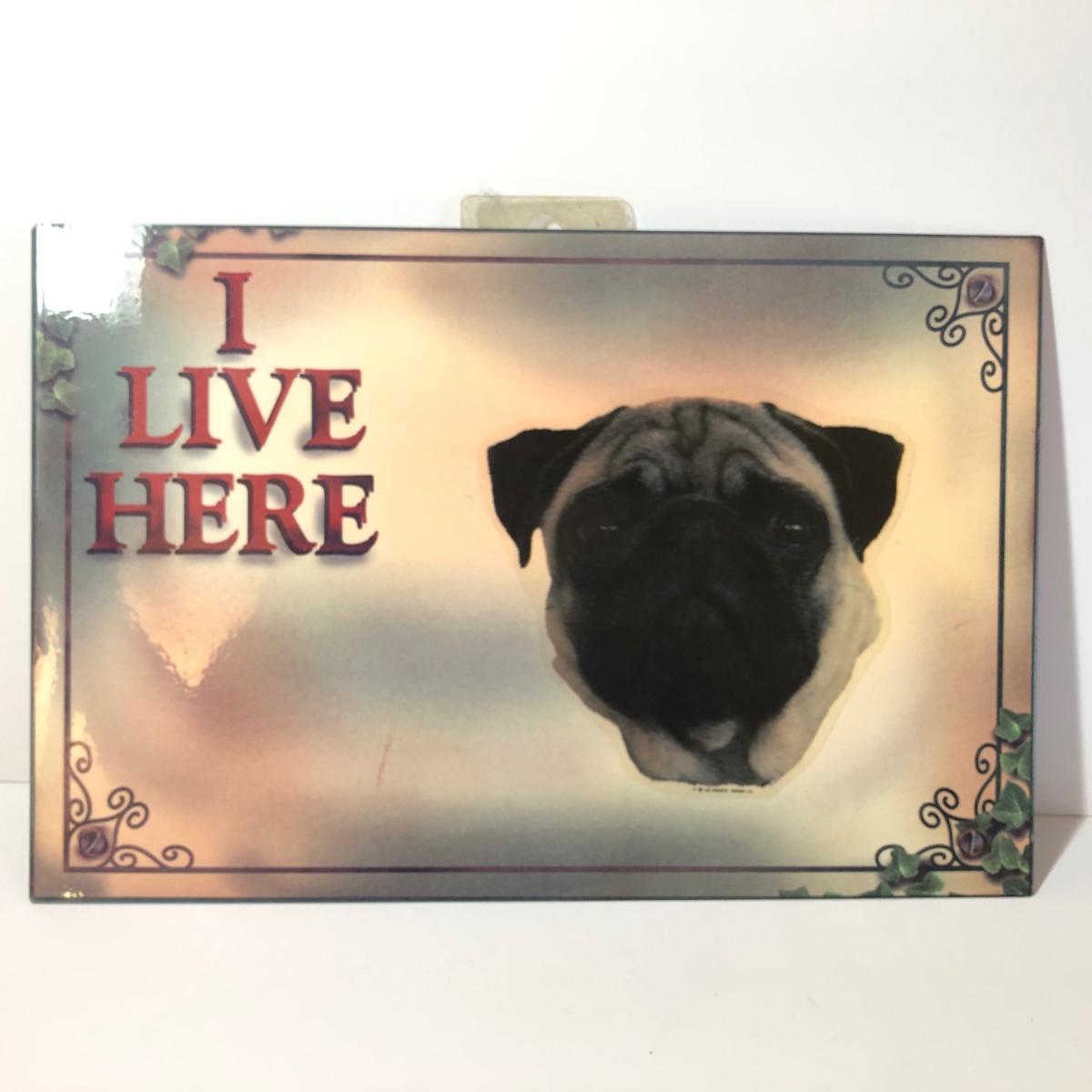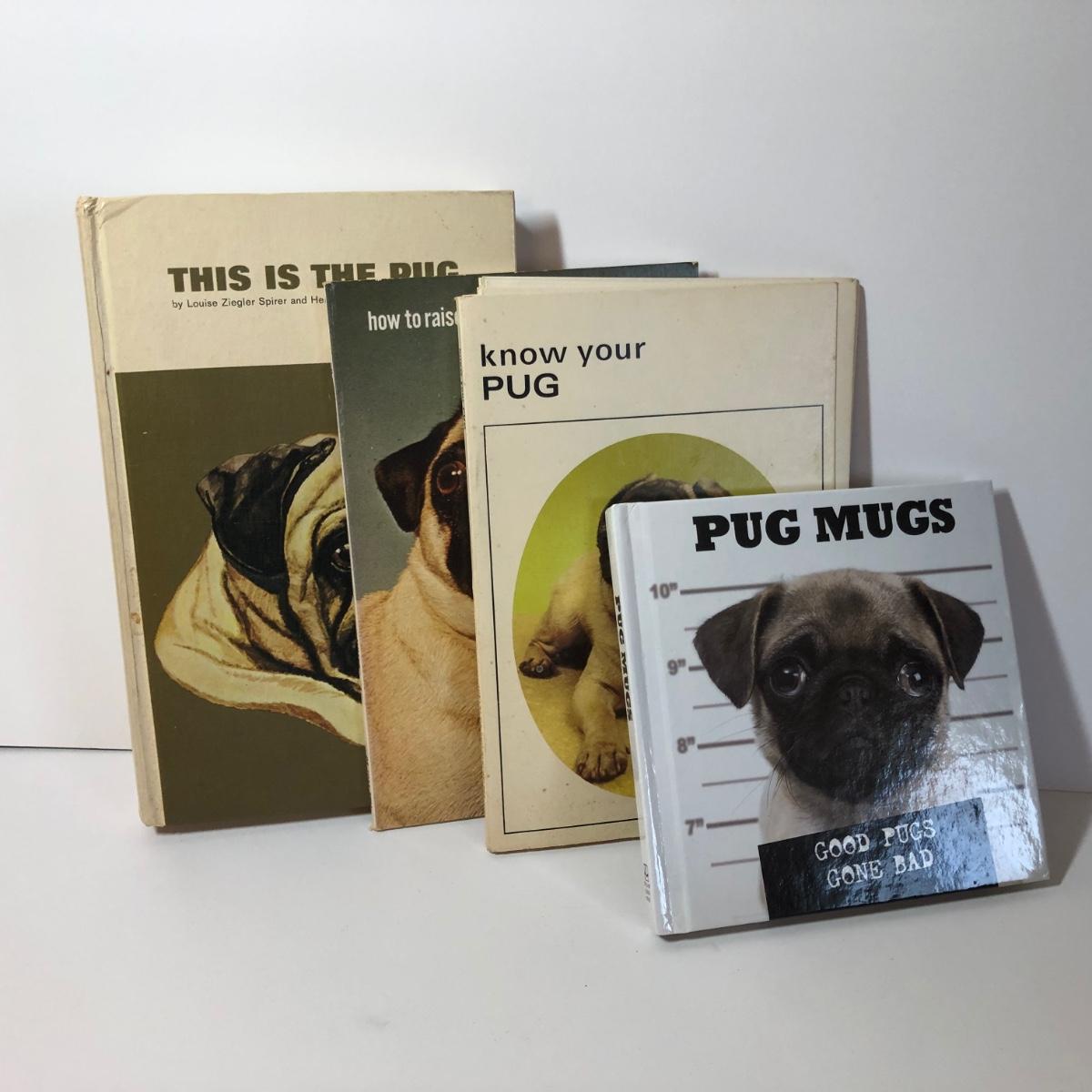 Includes pug stuffed animals featuring Ty Beanie Baby Pugsly, a puppet, a throw blanket in good condition with no noticeable stains, a deck of cards, some pug themed books, a cloth doll holding a pug, a framed pug needlepoint, and a sign with a pug on it that says "I live here."
