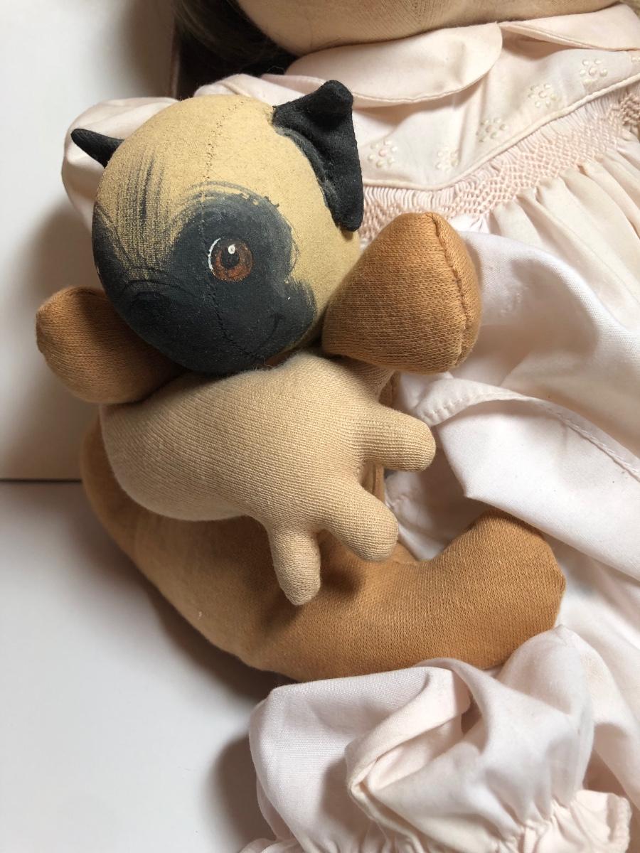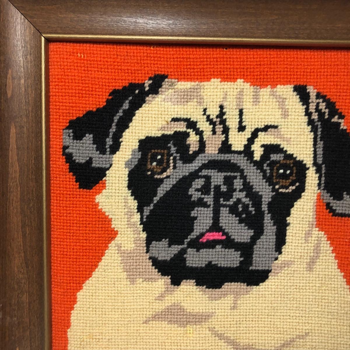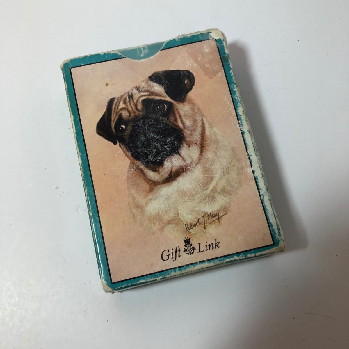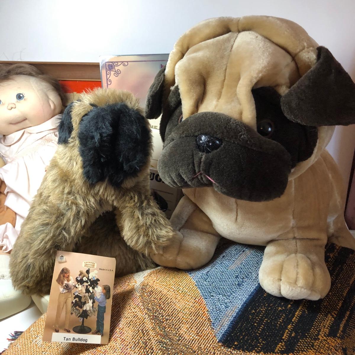 Includes pug stuffed animals featuring Ty Beanie Baby Pugsly, a puppet, a throw blanket in good condition with no noticeable stains, a deck of cards, some pug themed books, a cloth doll holding a pug, a framed pug needlepoint, and a sign with a pug on it that says "I live here."