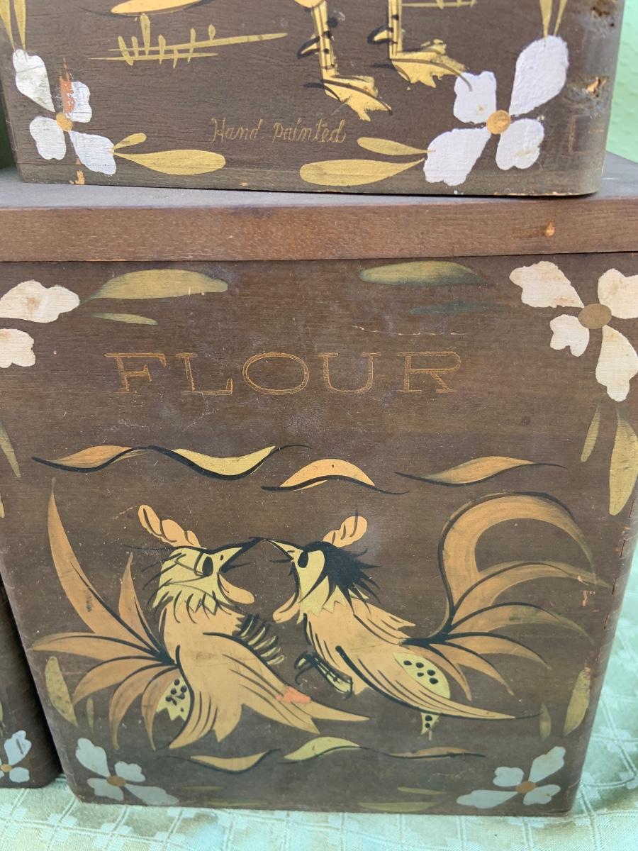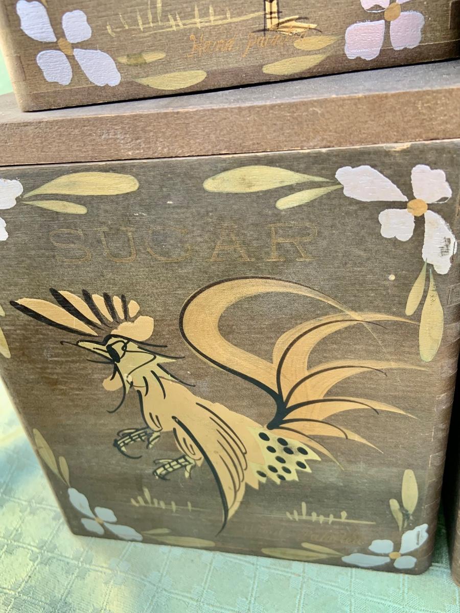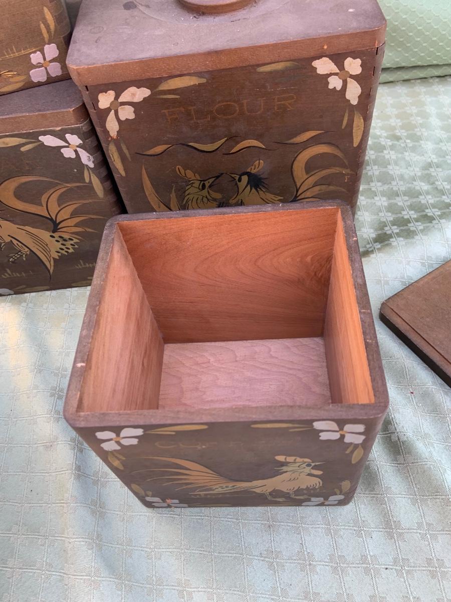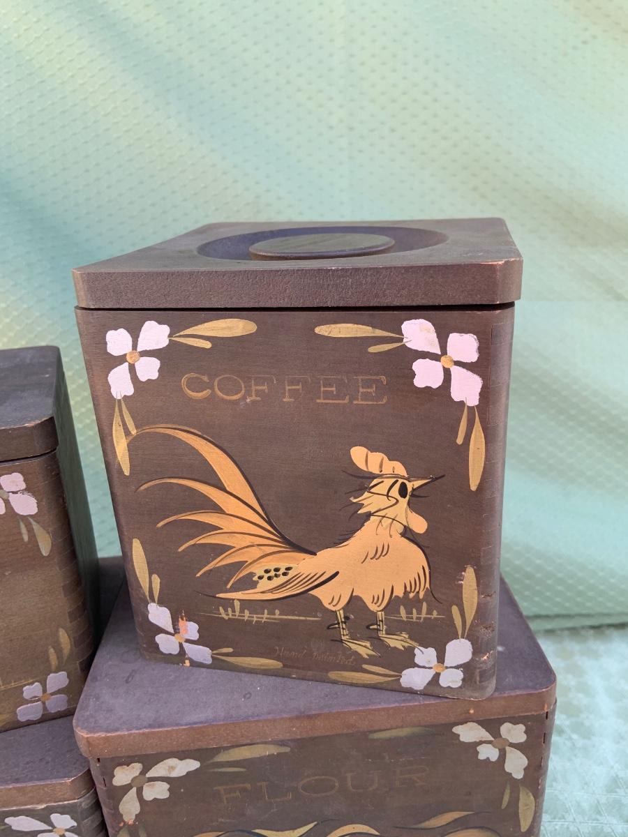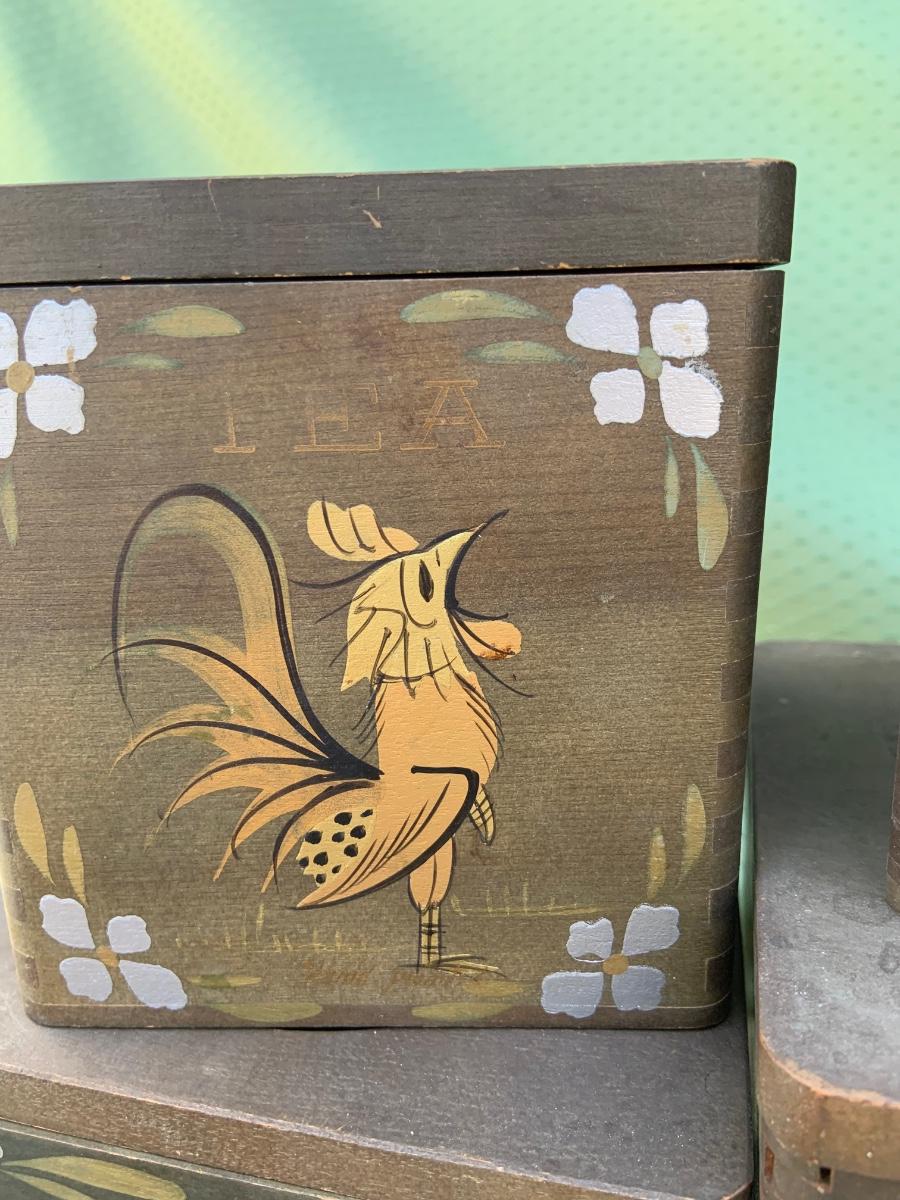 LOT:218:  Four Piece Tilso Wooden Rooster Canister Set Made in Japan; 2 Benson & Hedges Copper Canisters; a Match Book Holder and Vintage Tin