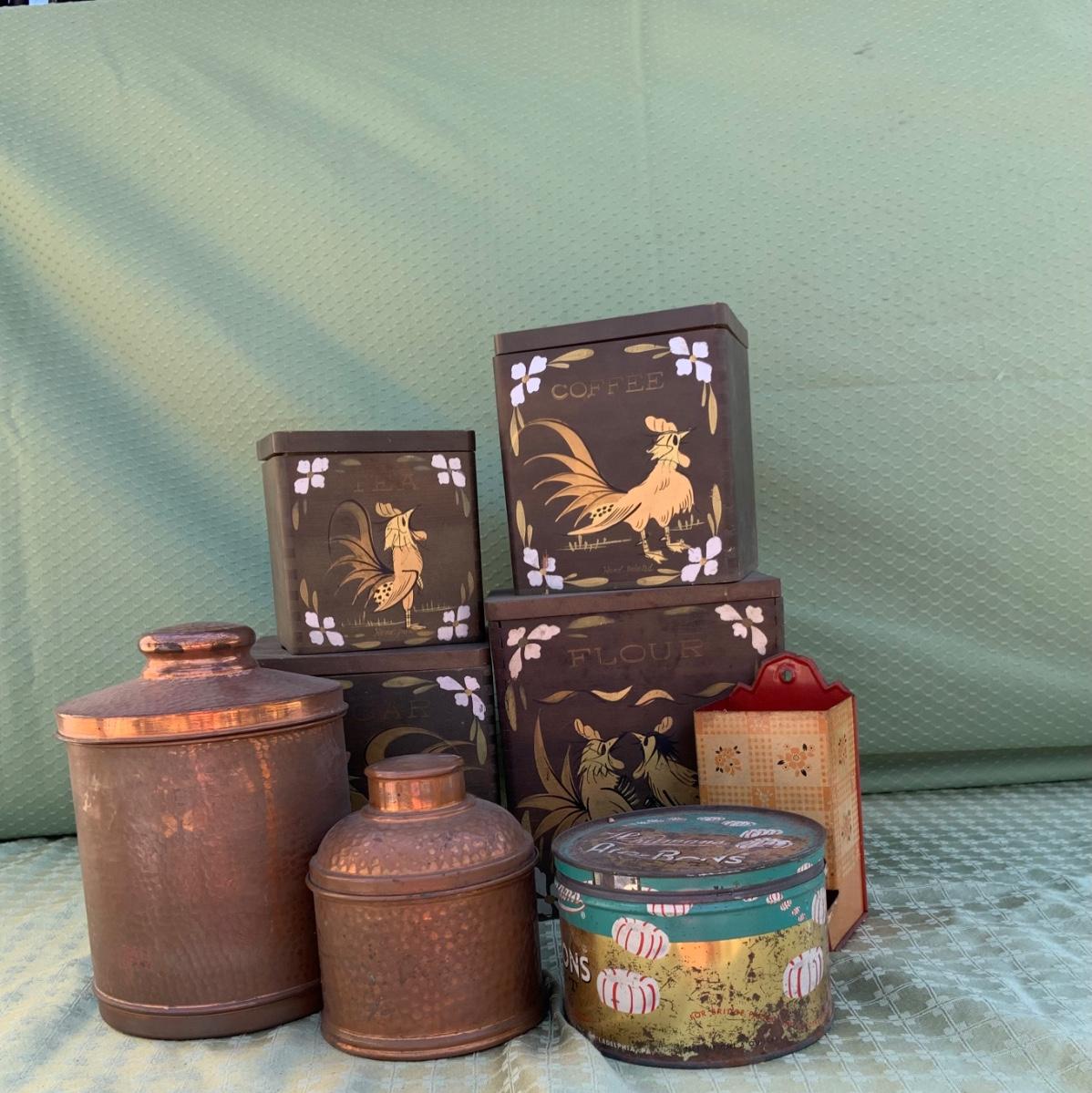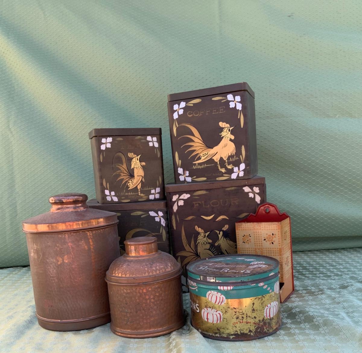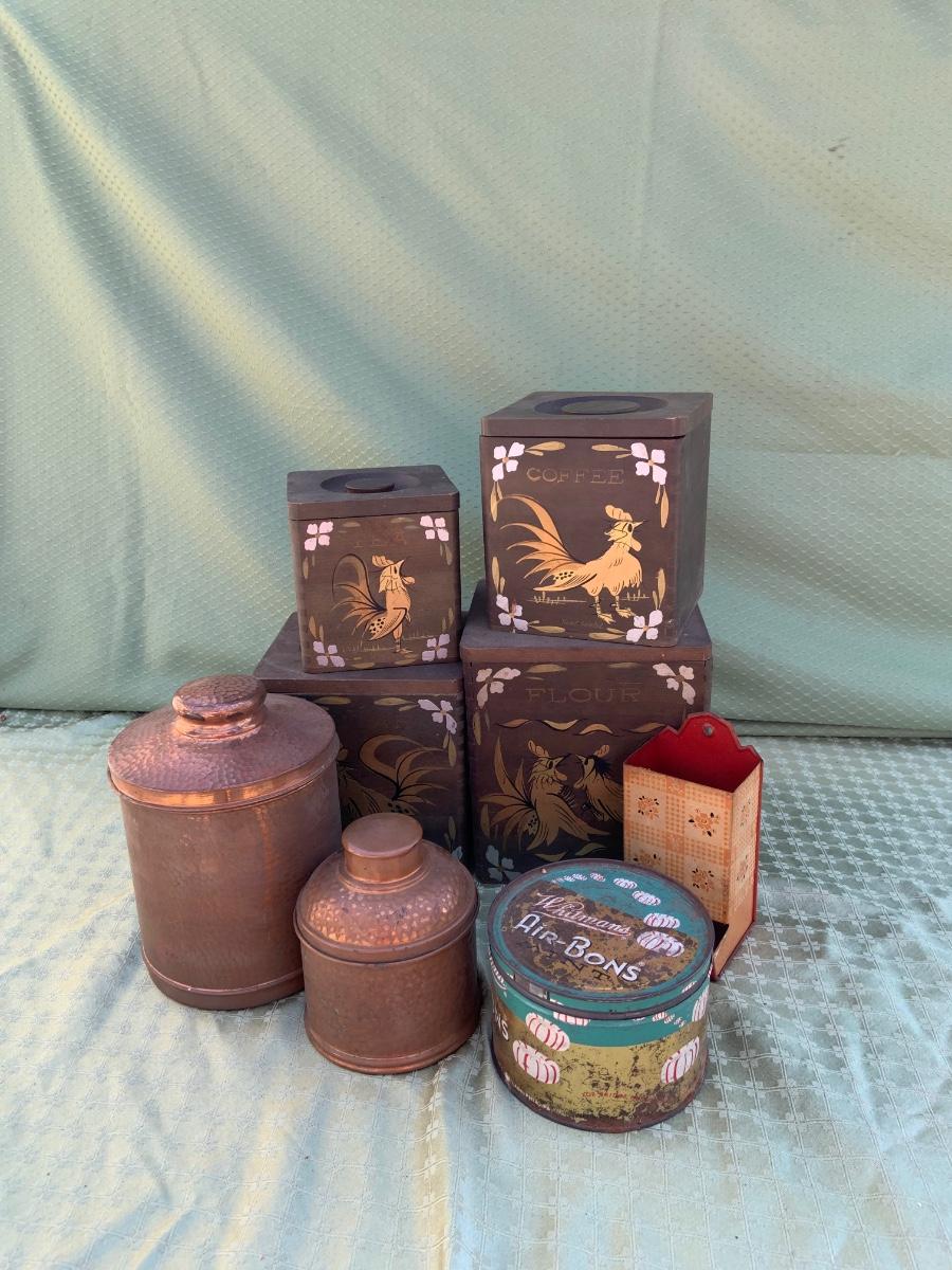 LOT:218: Four Piece Tilso Wooden Rooster Canister Set Made in Japan; 2 Benson & Hedges Copper Canisters; a Match Book Holder and Vintage Tin