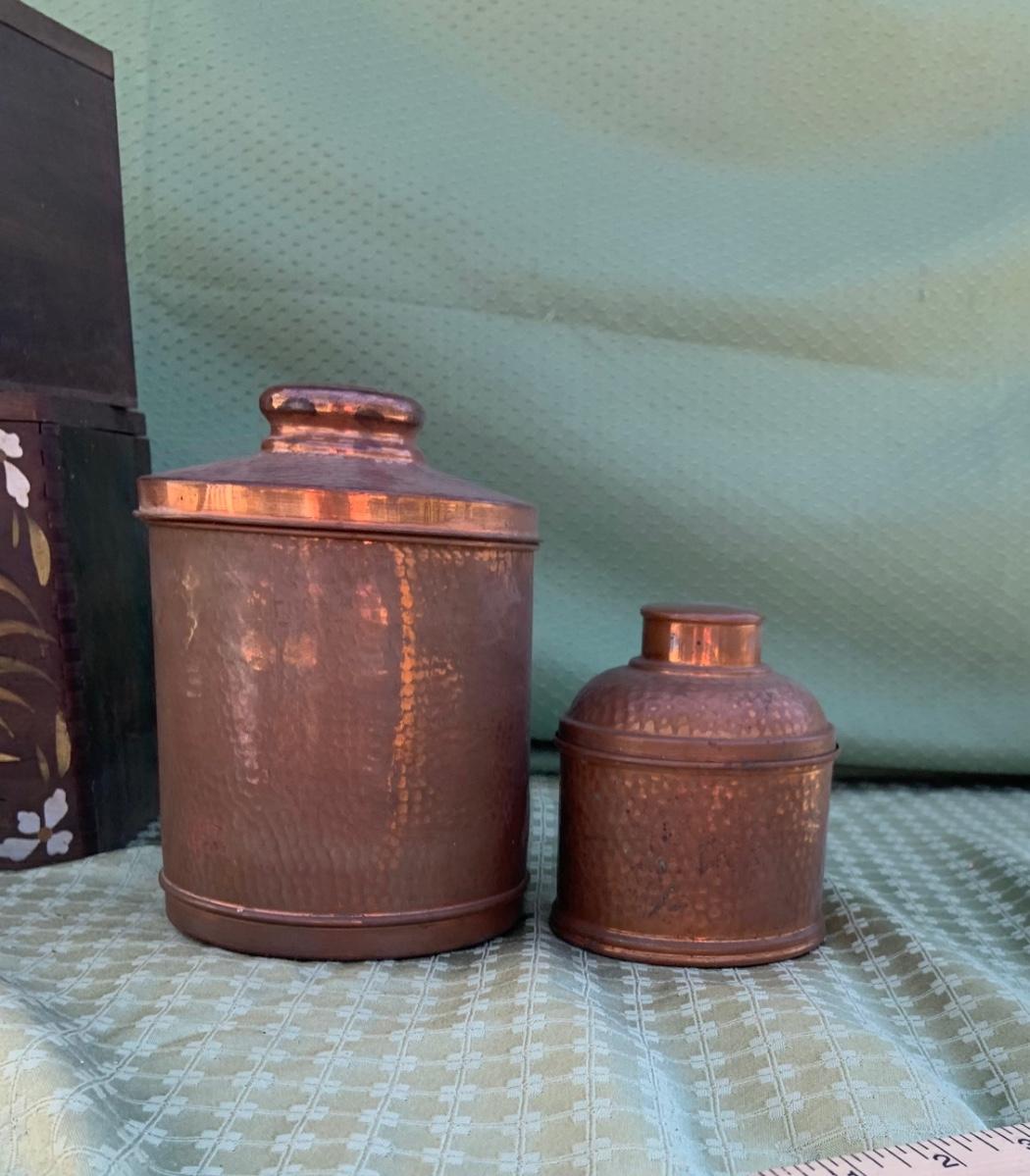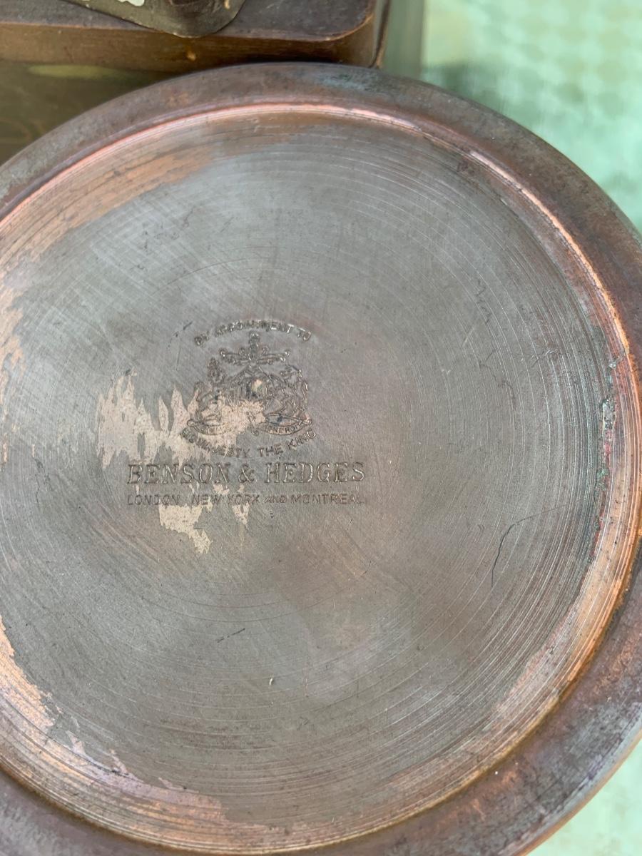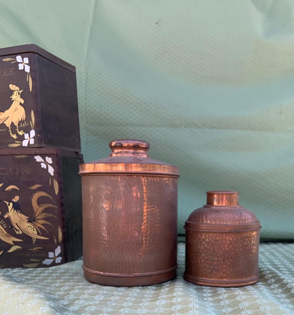 LOT:218: Four Piece Tilso Wooden Rooster Canister Set Made in Japan; 2 Benson & Hedges Copper Canisters; a Match Book Holder and Vintage Tin