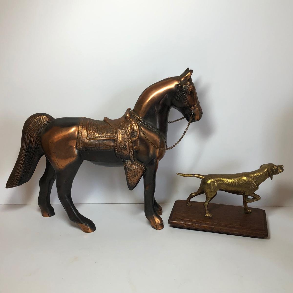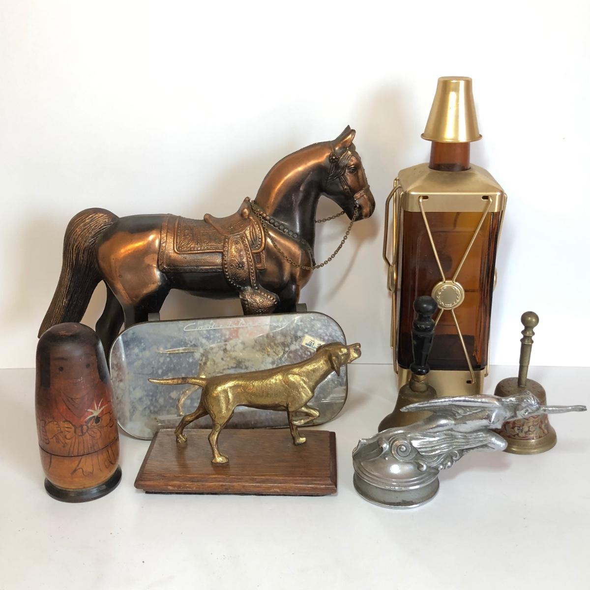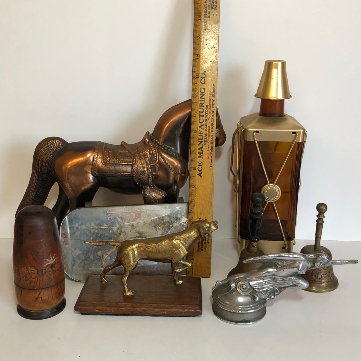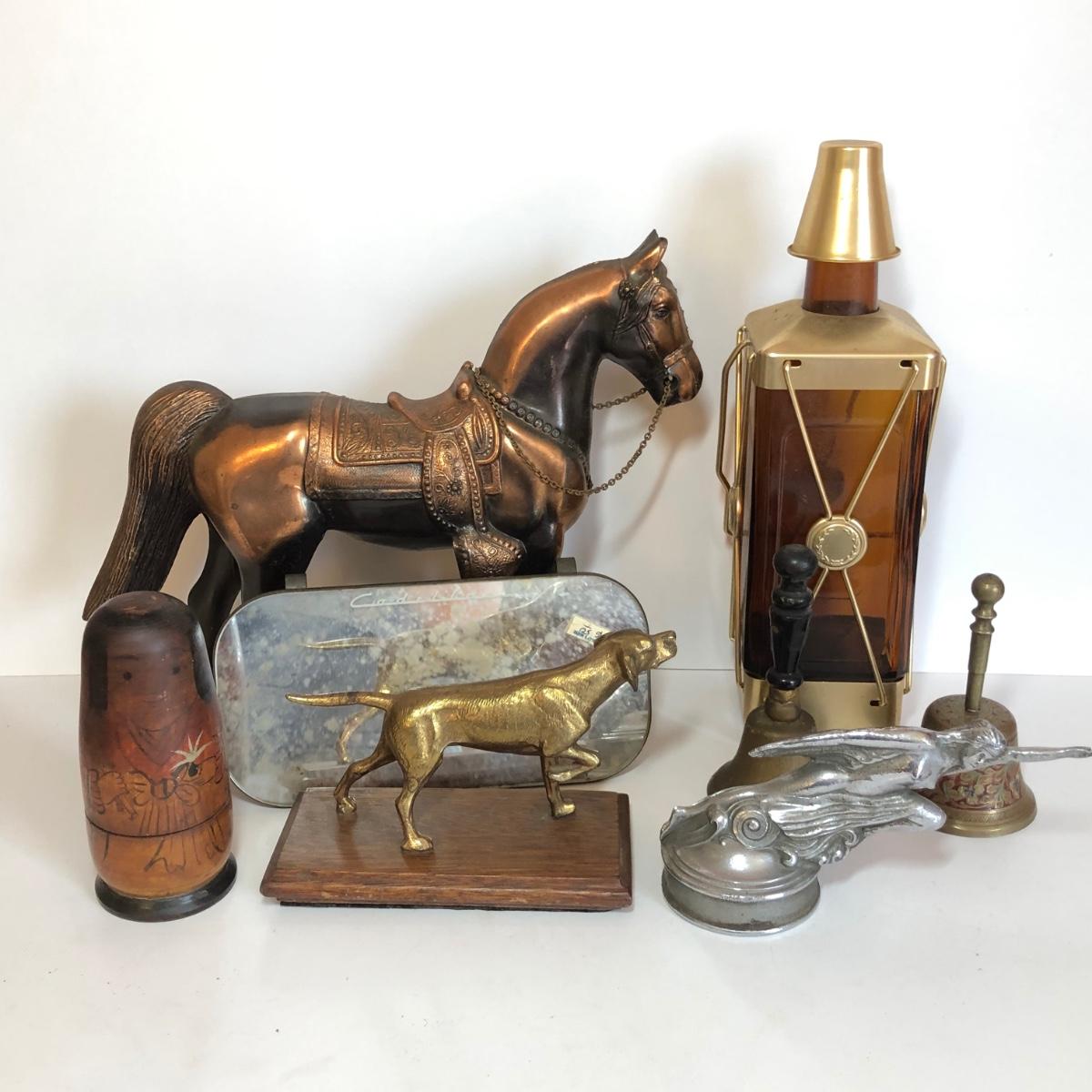 LOT 243M: Copper Horse; Cadallic Mirror, Vintage Car Hood Ornament, Wood Nesting Doll; Brass Decanter Music Box, Dog Statue and Bells