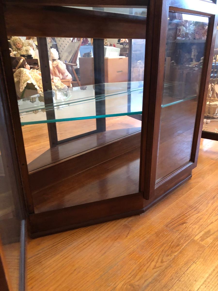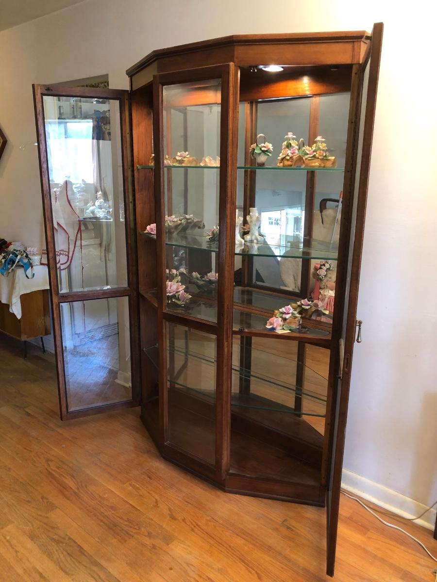 LOT 244M: Lighted Wood Mirrored Curio Cabinet with  Opening Side Doors and Glass Shelves.