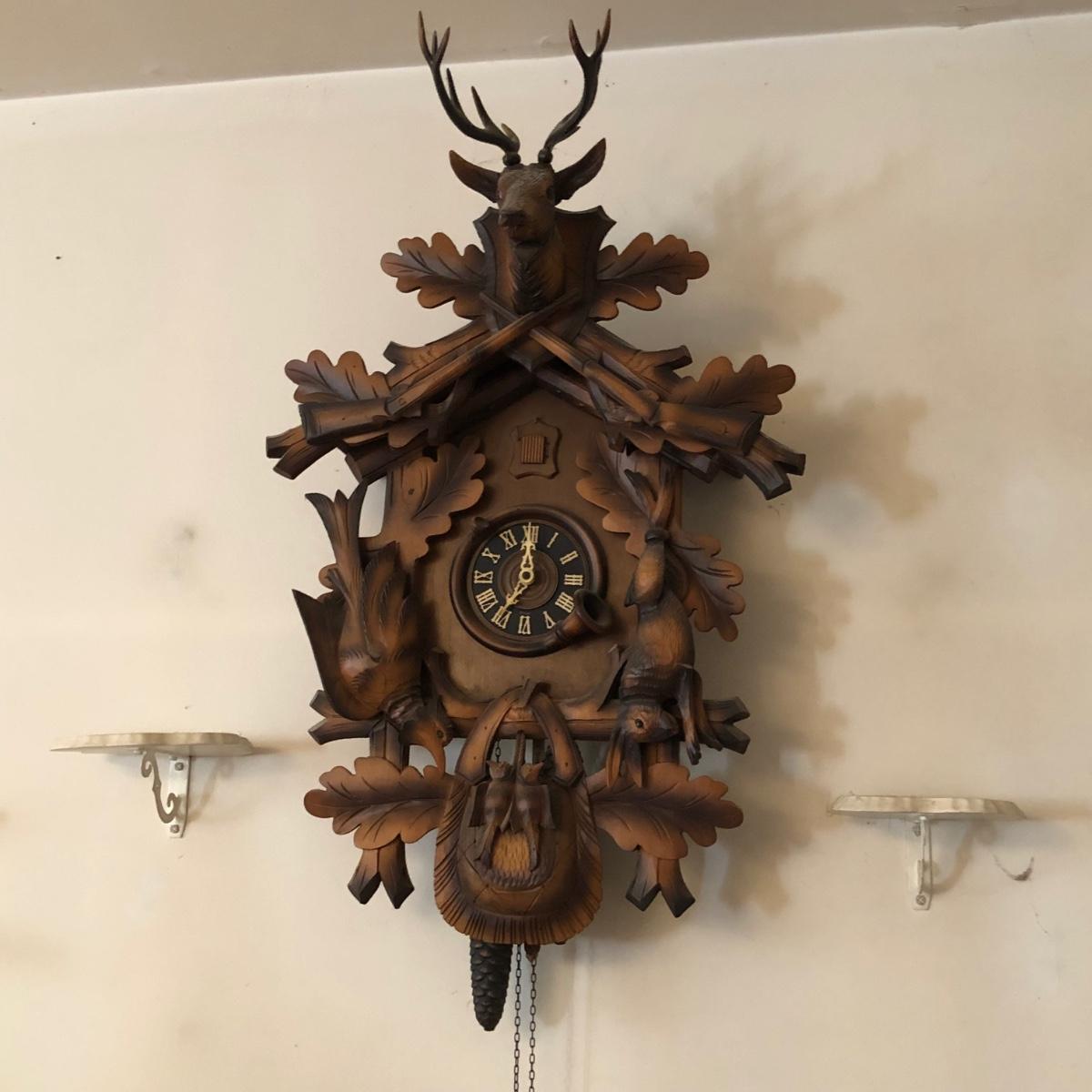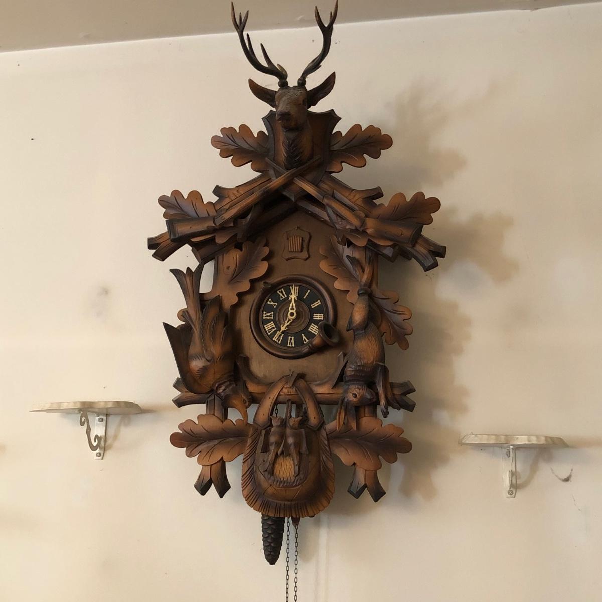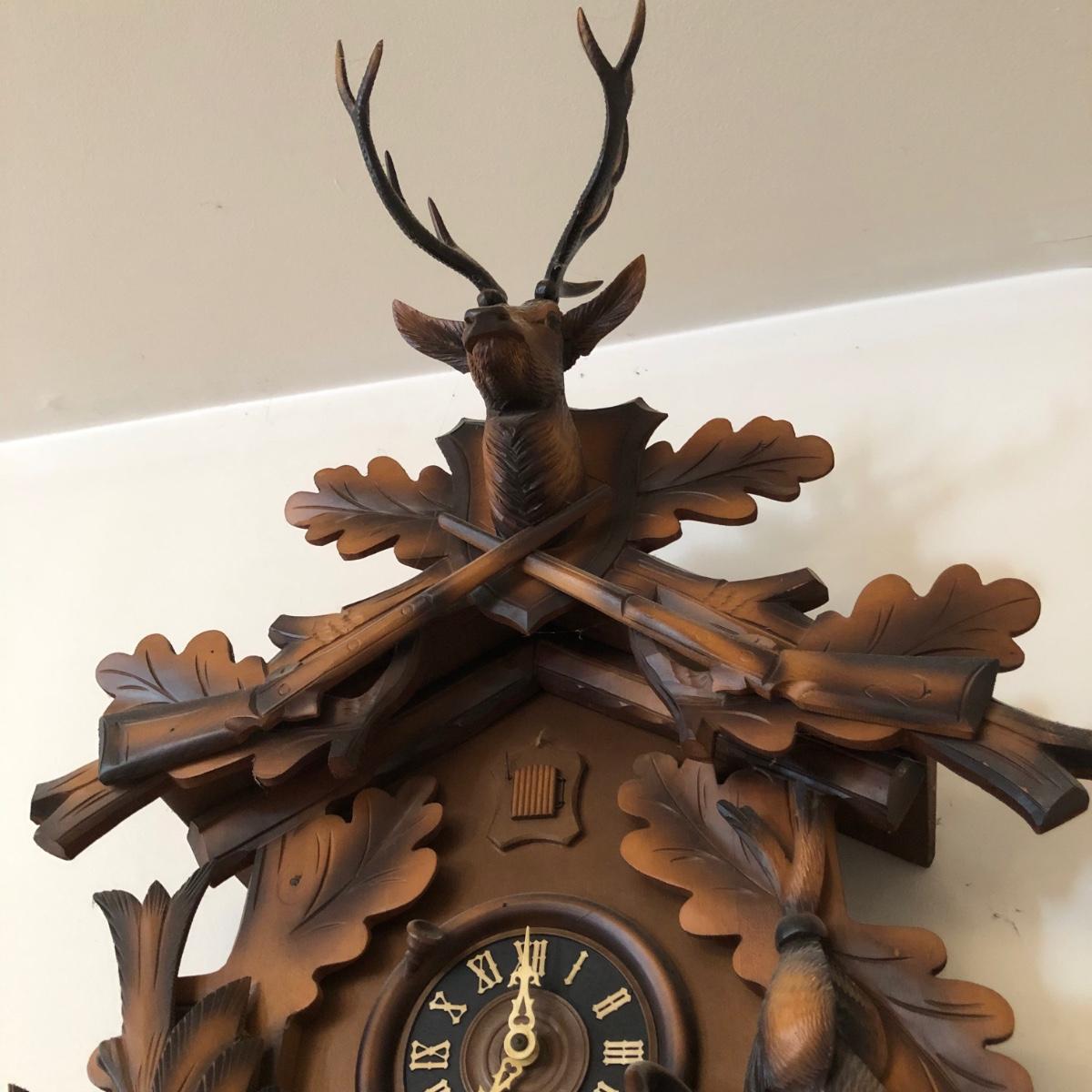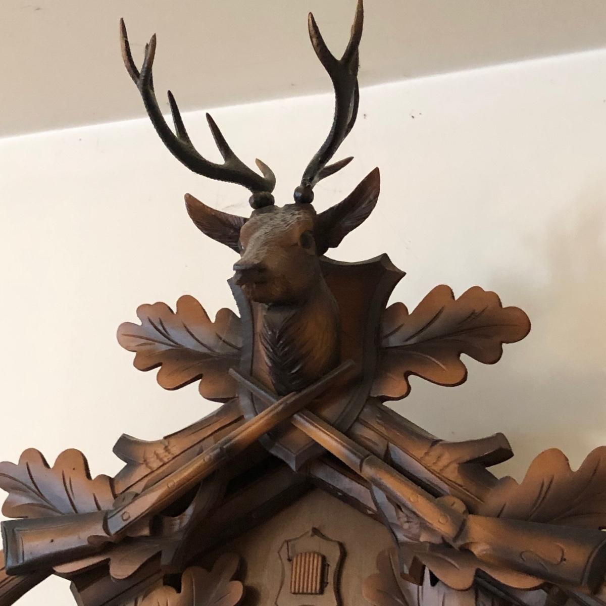 LOT 245M: Black Forest Wood Hunting Cuckcoo Clock with Carved Buck Head ,Birds, Rabbits, Guns and More.