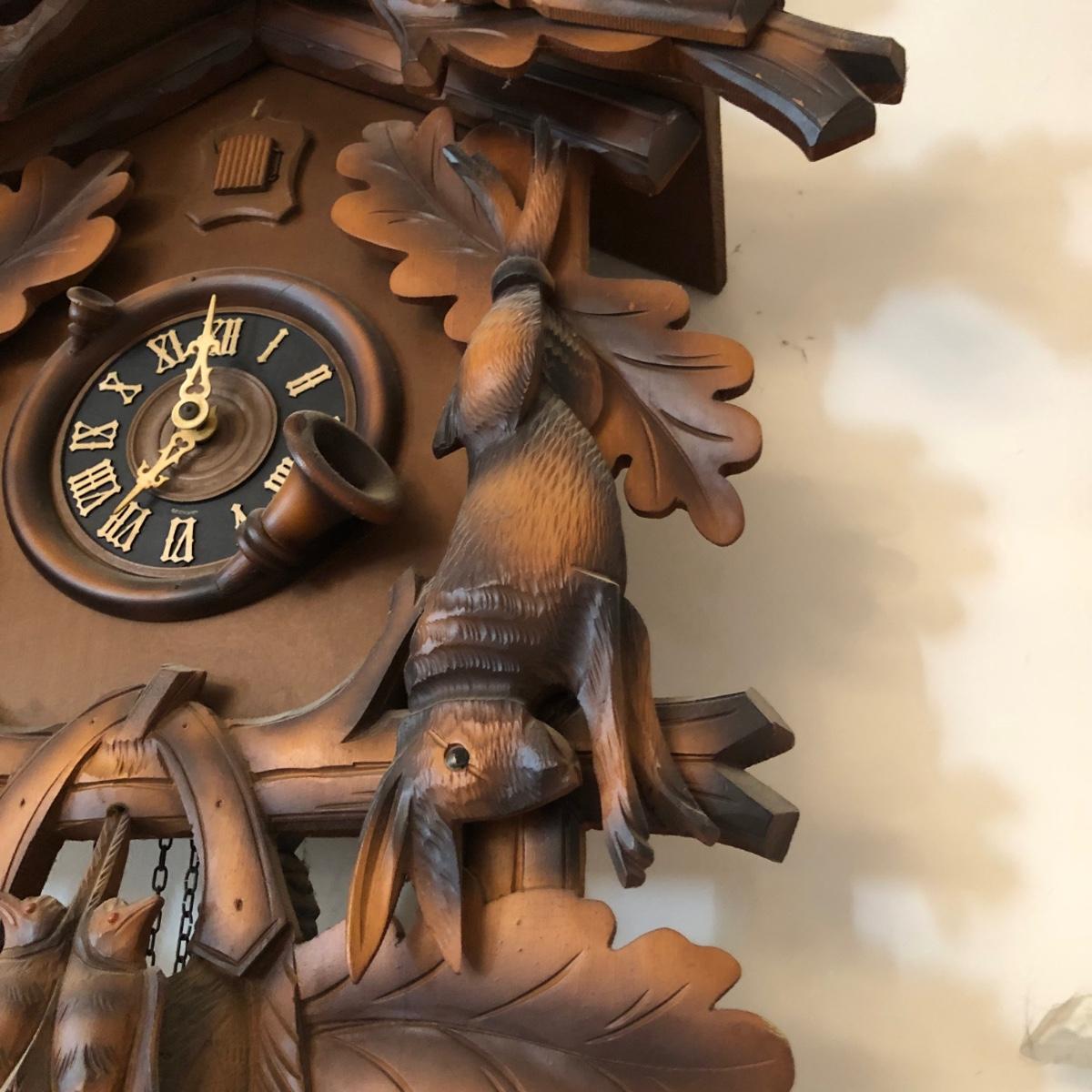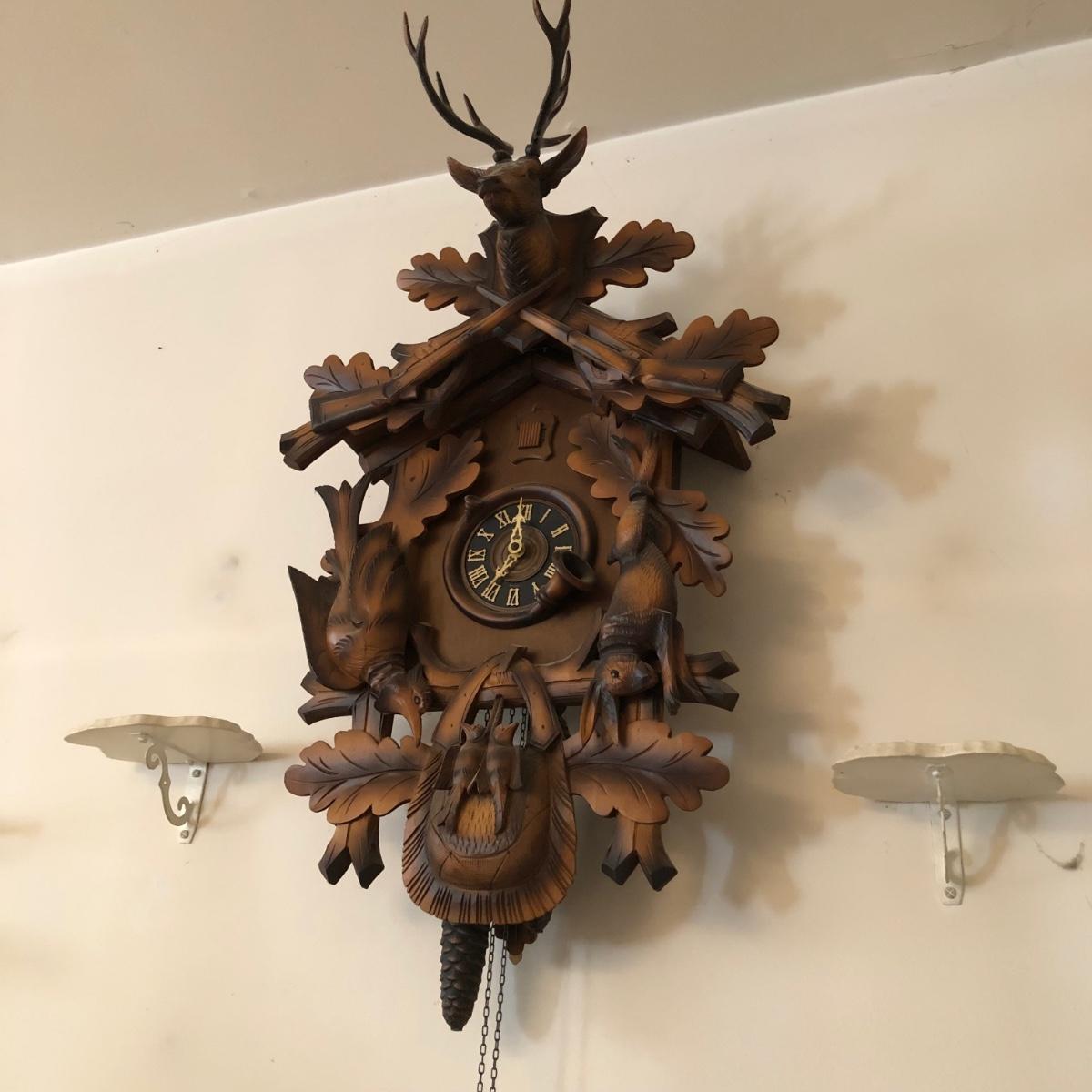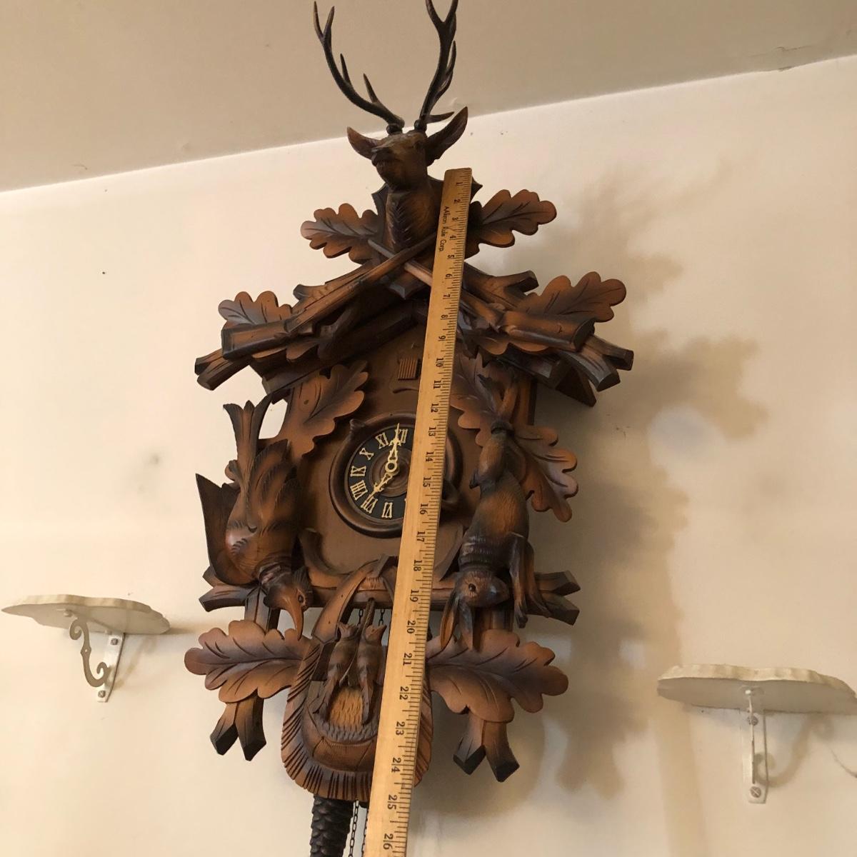 LOT 245M: Black Forest Wood Hunting Cuckcoo Clock with Carved Buck Head ,Birds, Rabbits, Guns and More.