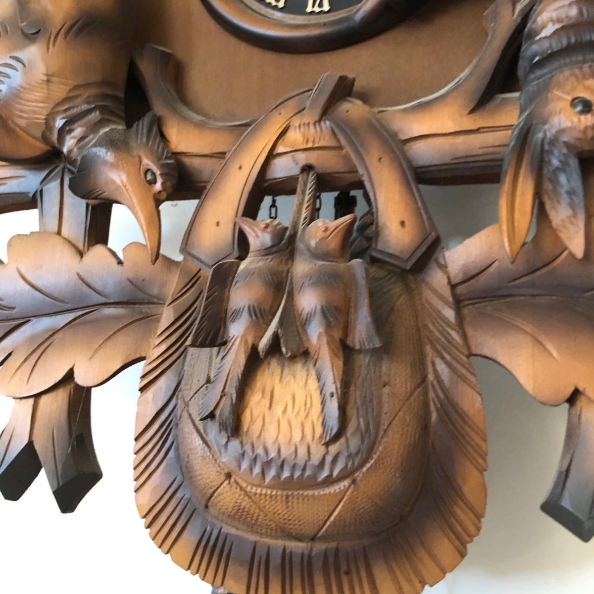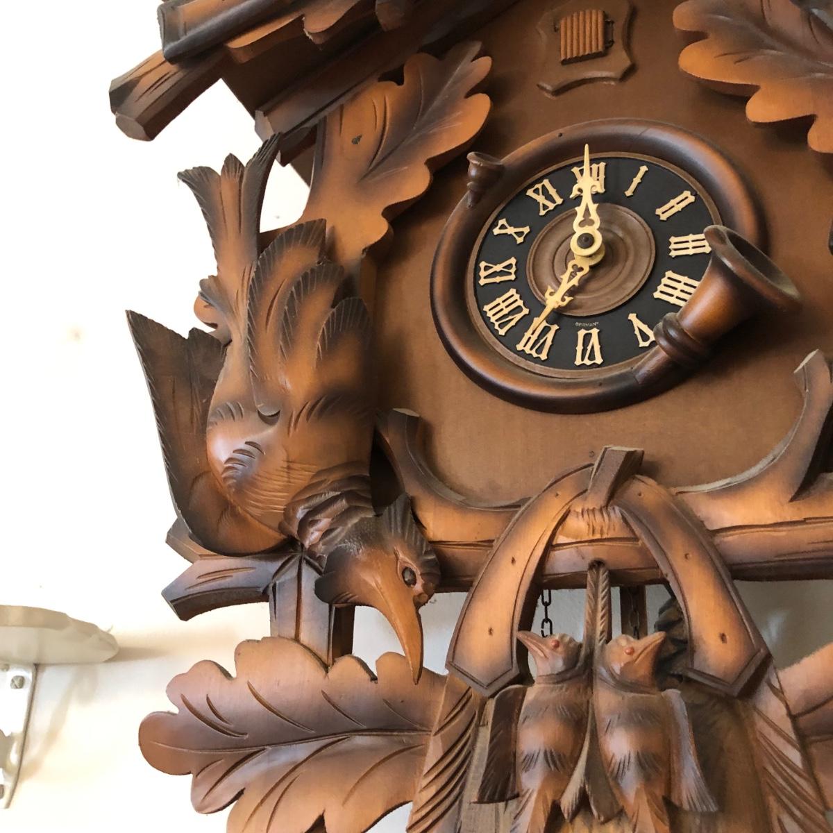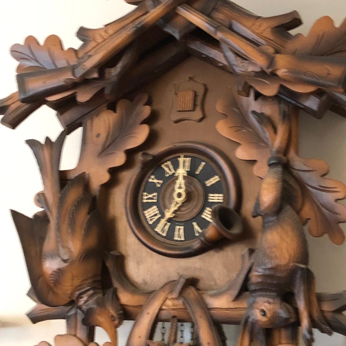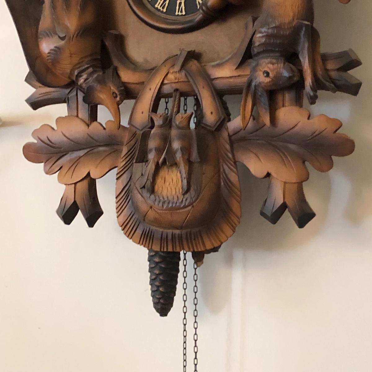 LOT 245M: Black Forest Wood Hunting Cuckcoo Clock with Carved Buck Head ,Birds, Rabbits, Guns and More.