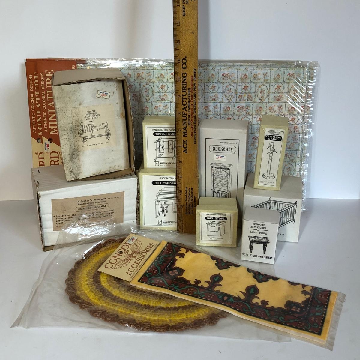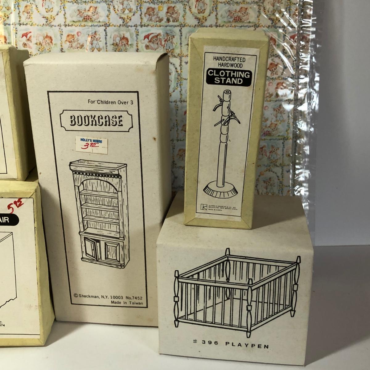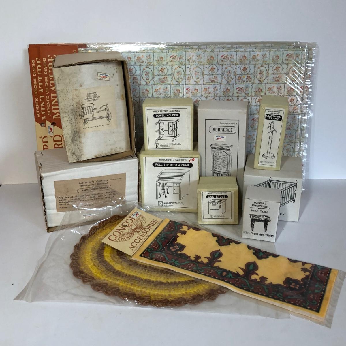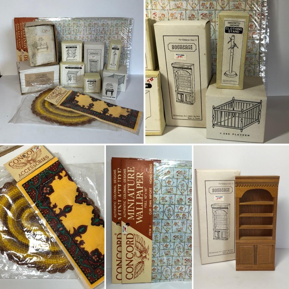 LOT 253M: New Old Stock Doll Furniture with Rugs, Wall Paper and Handcrafted Hardwood Pieces