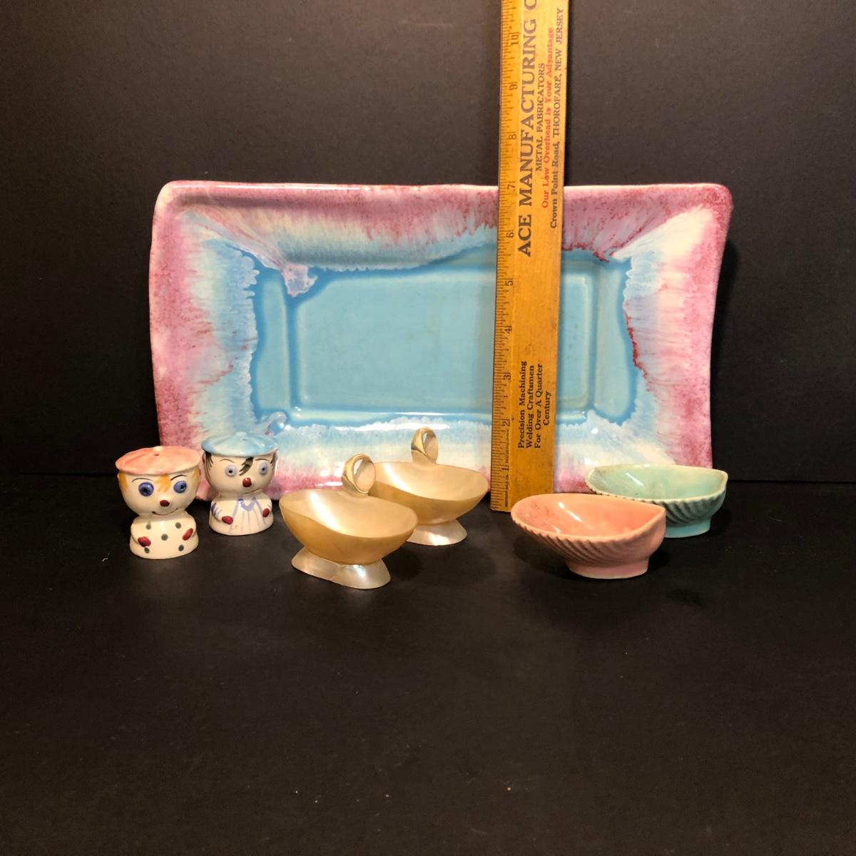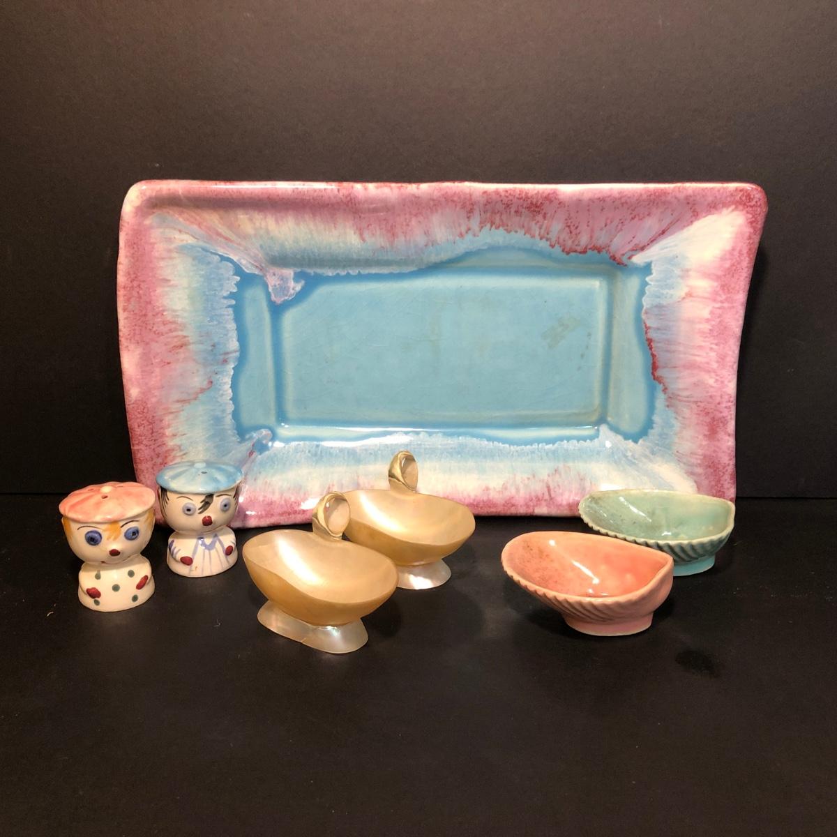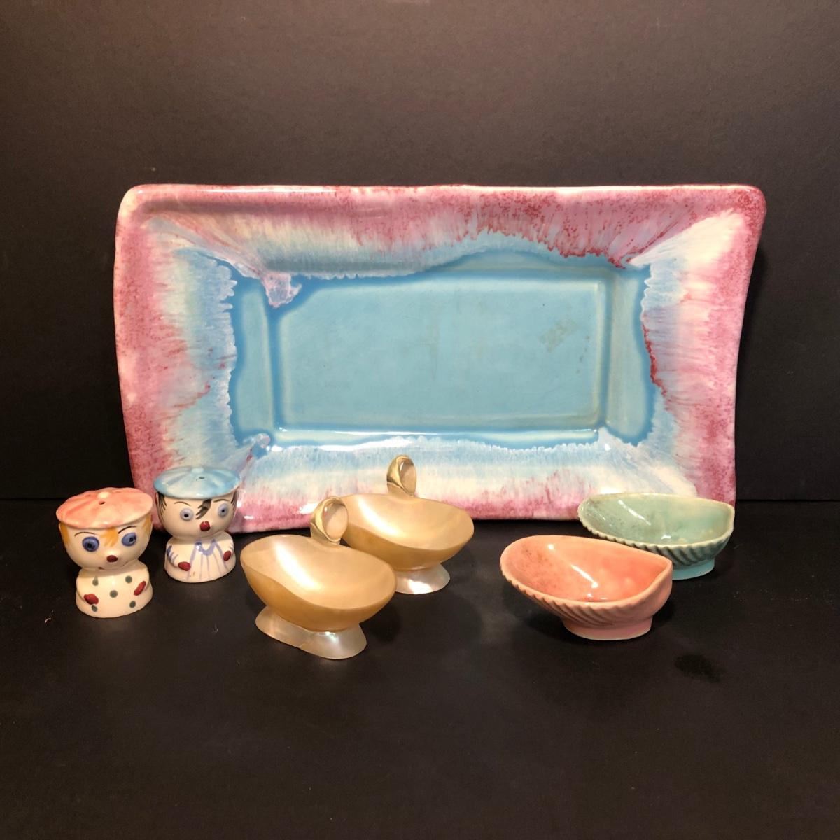 LOT 258M Pastel Roseviile Tray/Platter No1211: Vintage Unmarked Clown Salt and Pepper Shakers: and Small Shell Shaped Dishes
