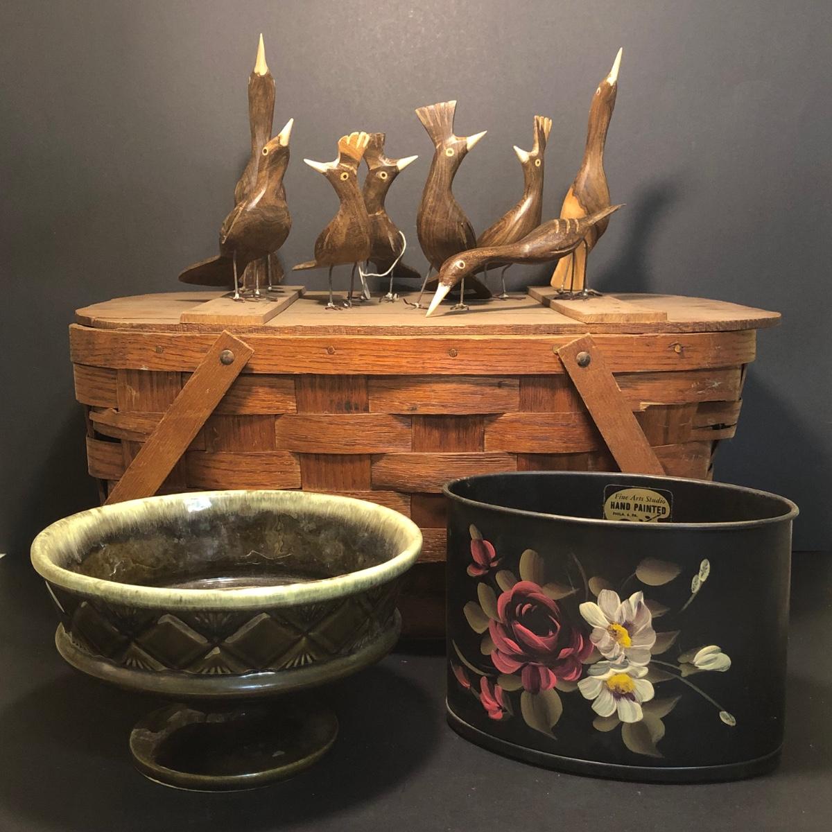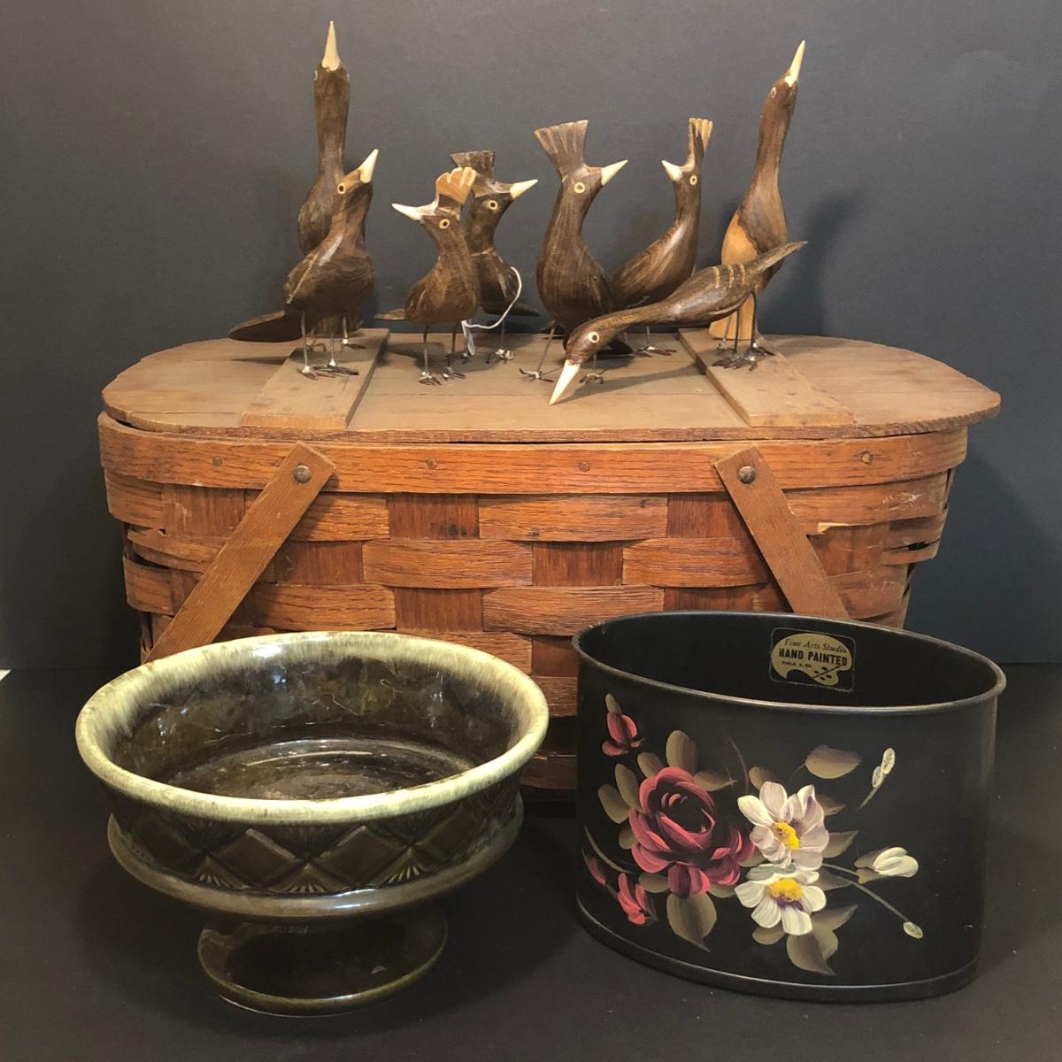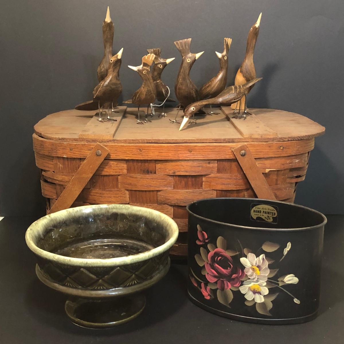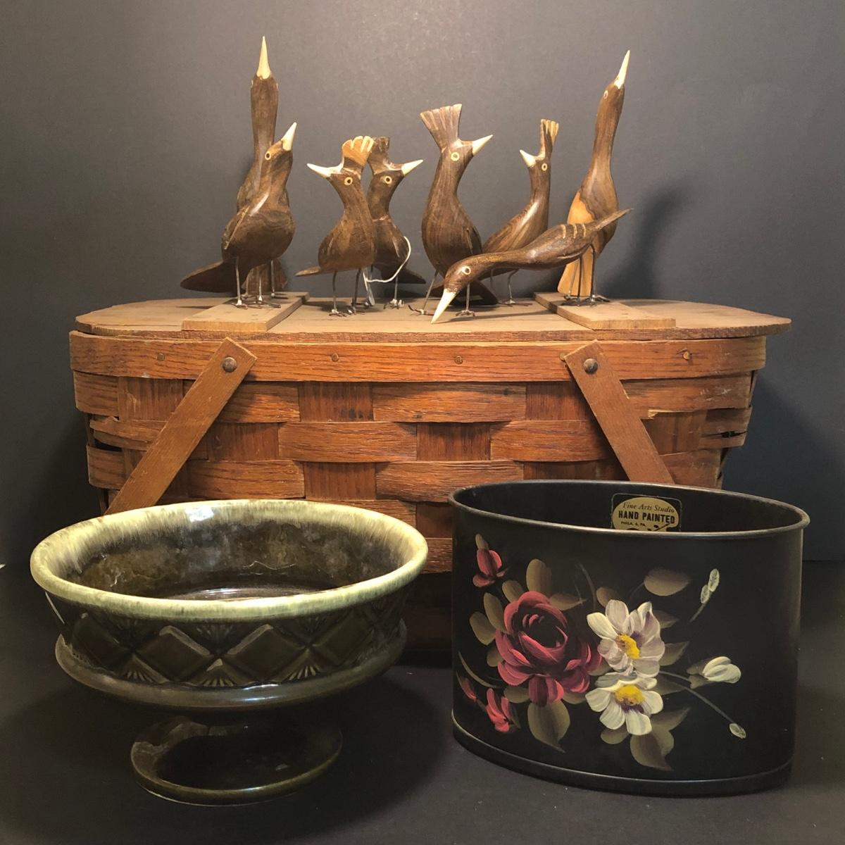 LOT 259M: Hull Pottery Compot Planter: Hand Painted Florial Planter; Wov-N-Wood Wicker Picnic Basket and a Group of Hand Carved Wood Birds