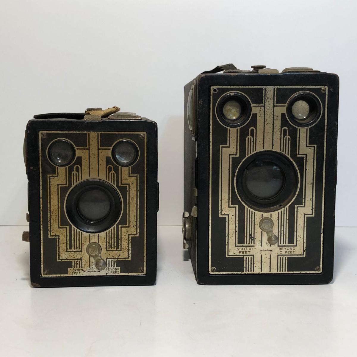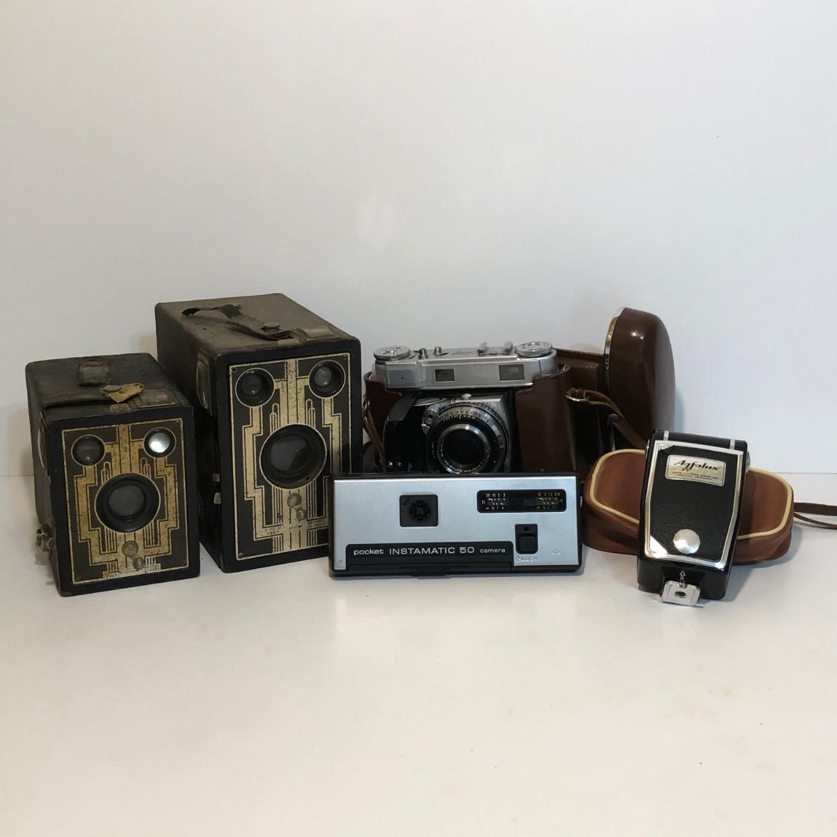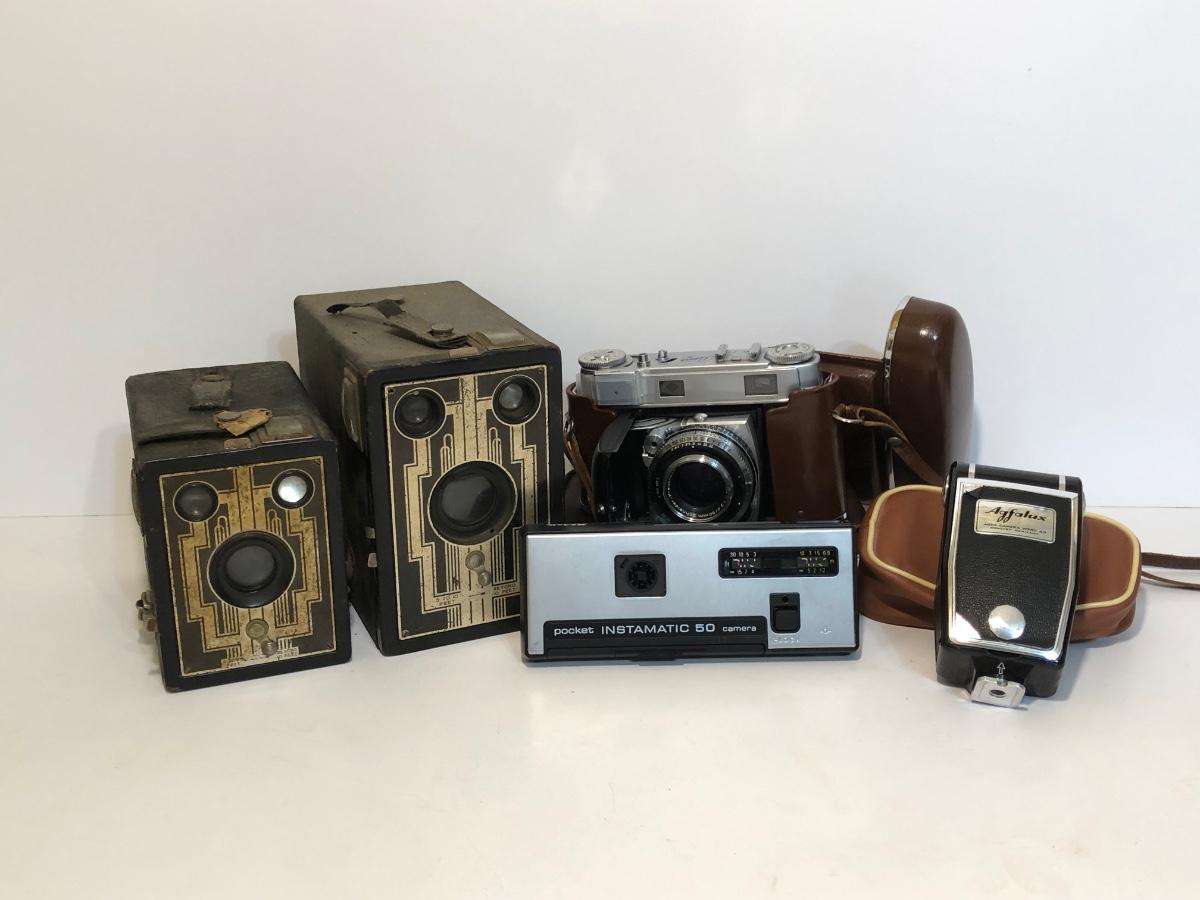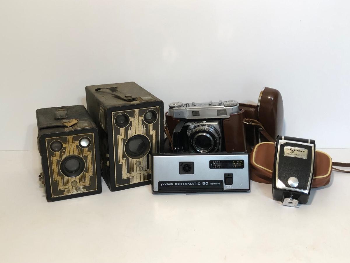 LOT 260M: Camera Collection with Accessories Including - 2 Brownie Box Cameras, Kodak 35mm & Instamatic Camera and an Agfalux  Flash with Case