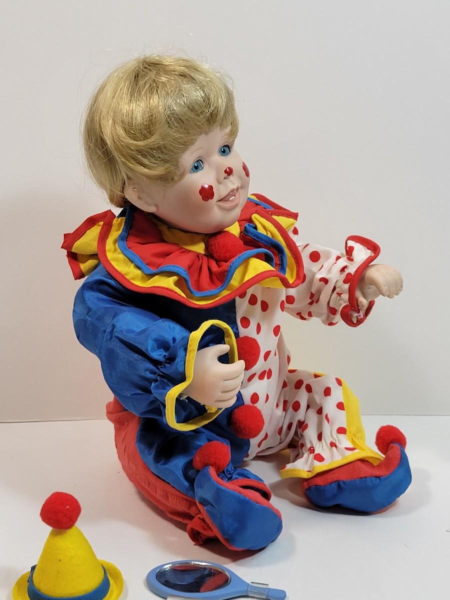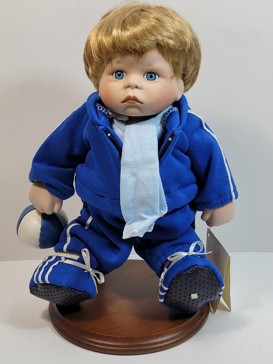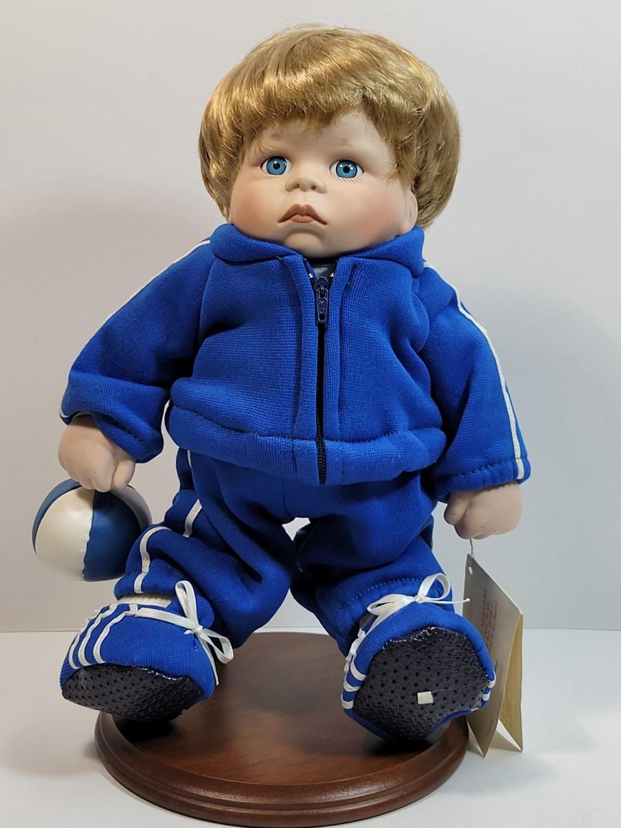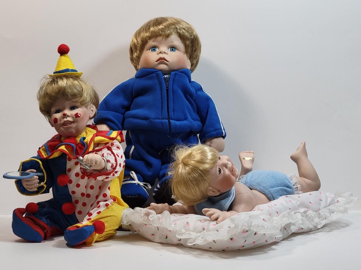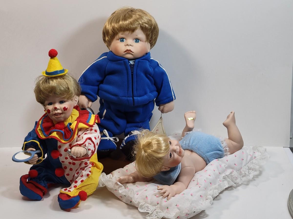 LOT8: Baby "The Clown" by Fayzah Spanos, Johnathan- by William Tung Collection, & Chuck by Camelot Handcrafted Dolls "Basket Ball Player"