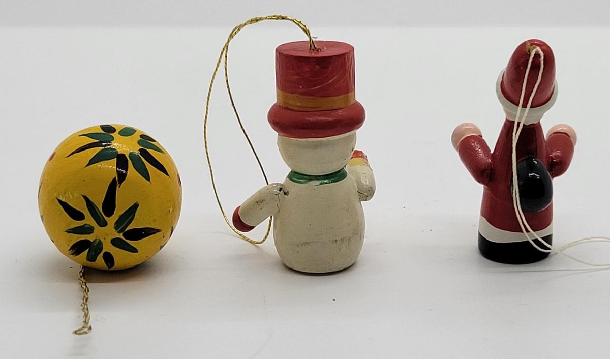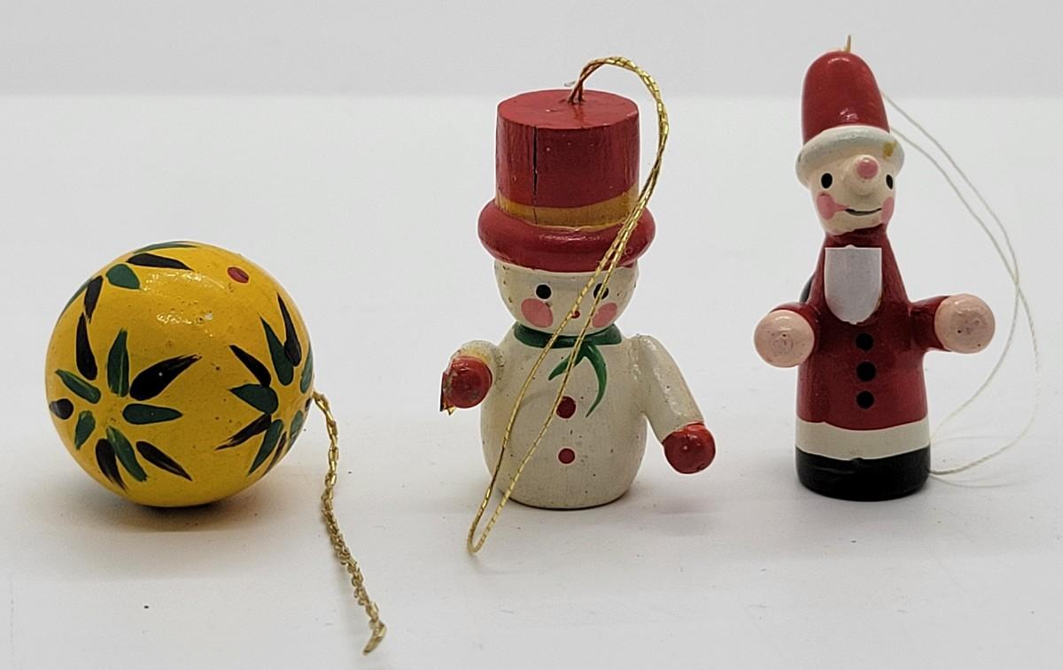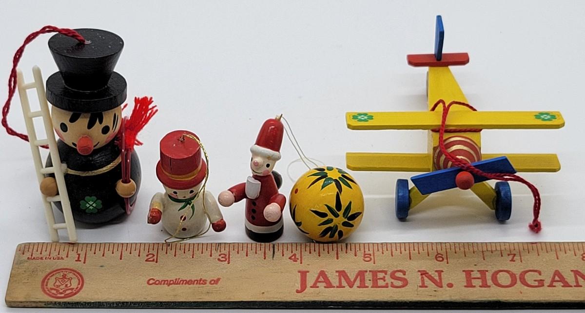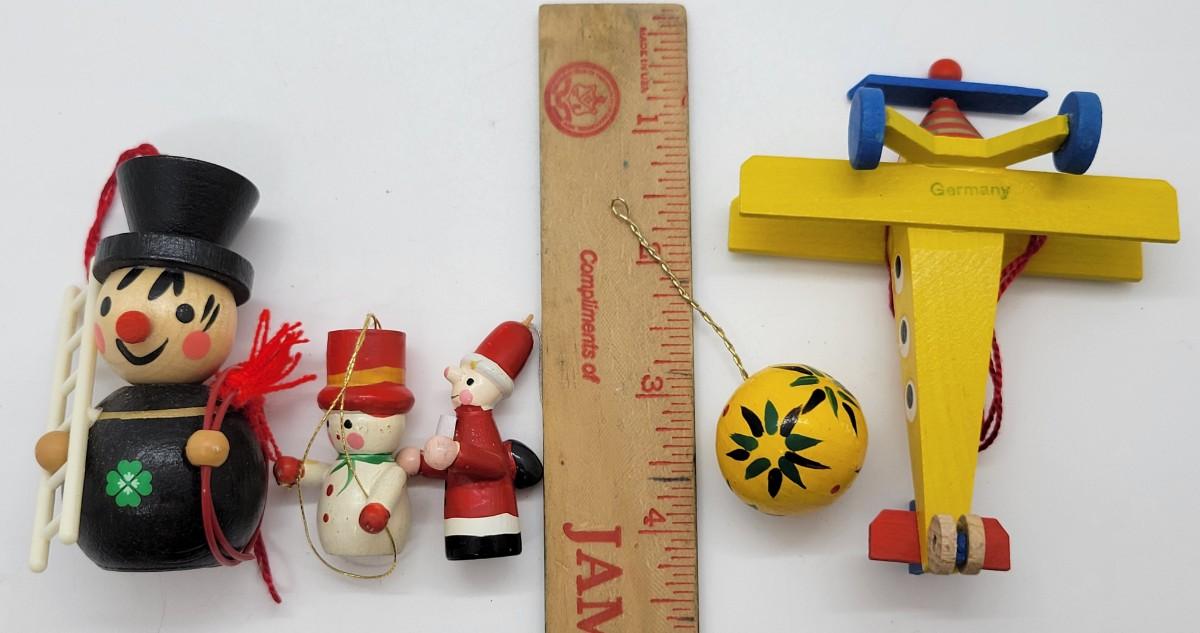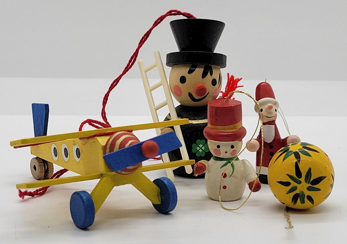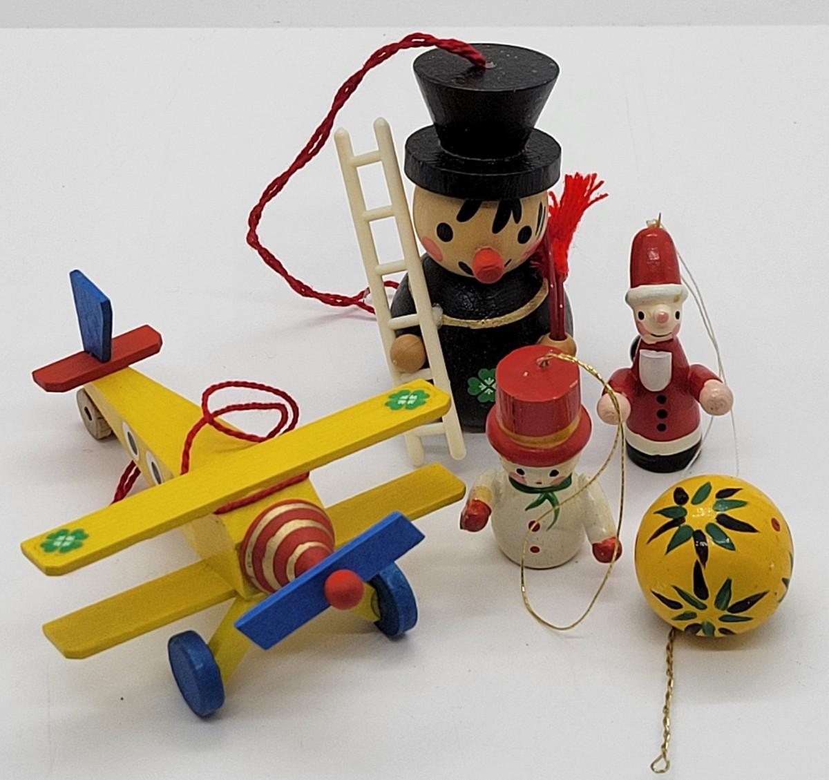 LOT67: Steinbach Wooden Airplane, Steinbach Wooden man with top hat ornament, Vintage wooden ornaments: snowman, Santa, & ball