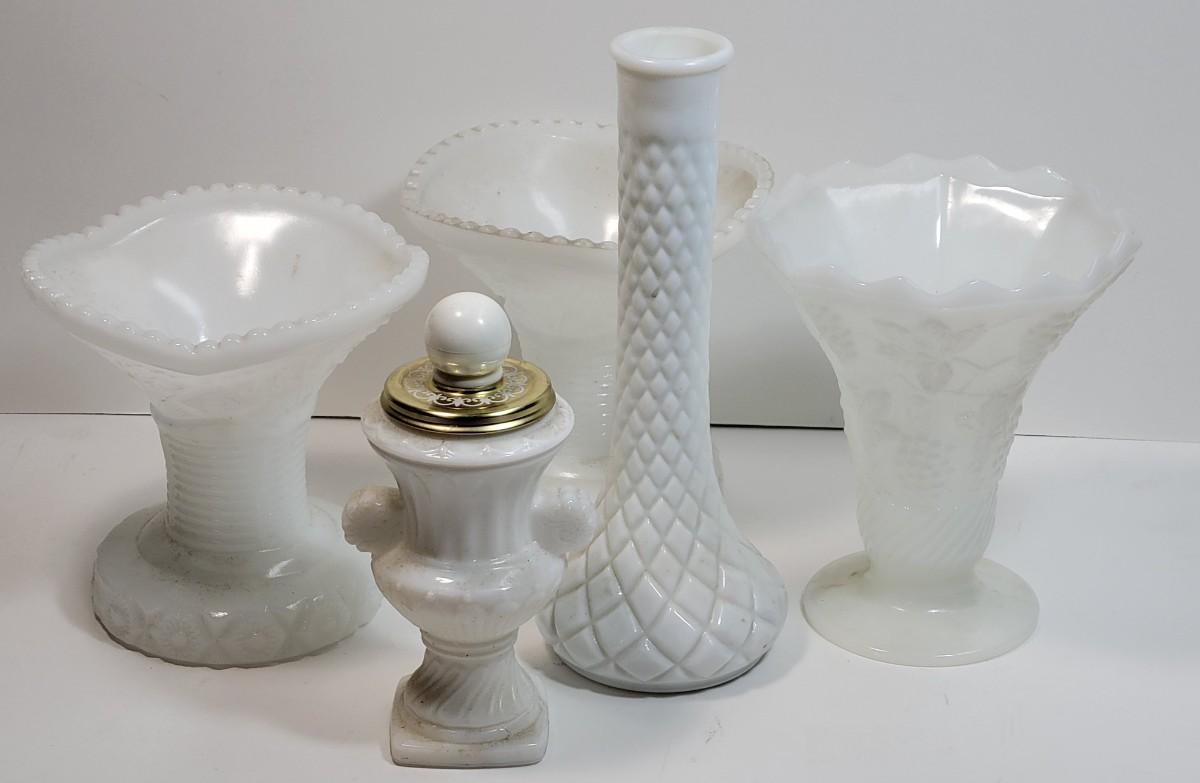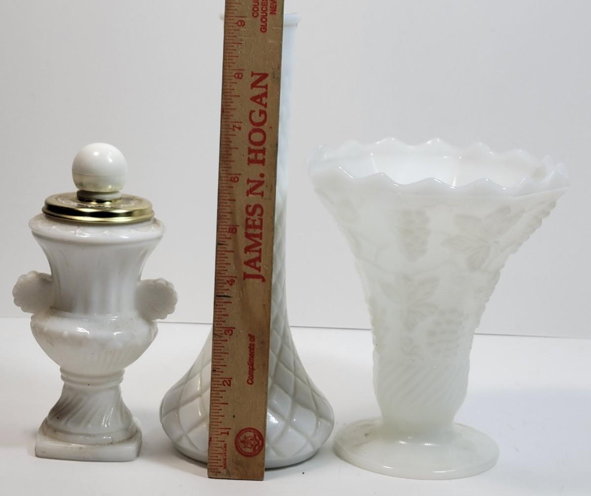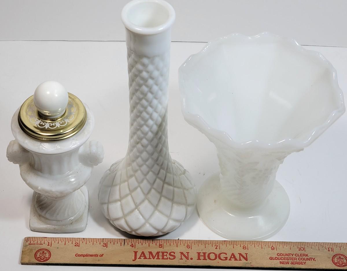 LOT94: Vintage Milk Glass Vases & Avon Perfume Bottle