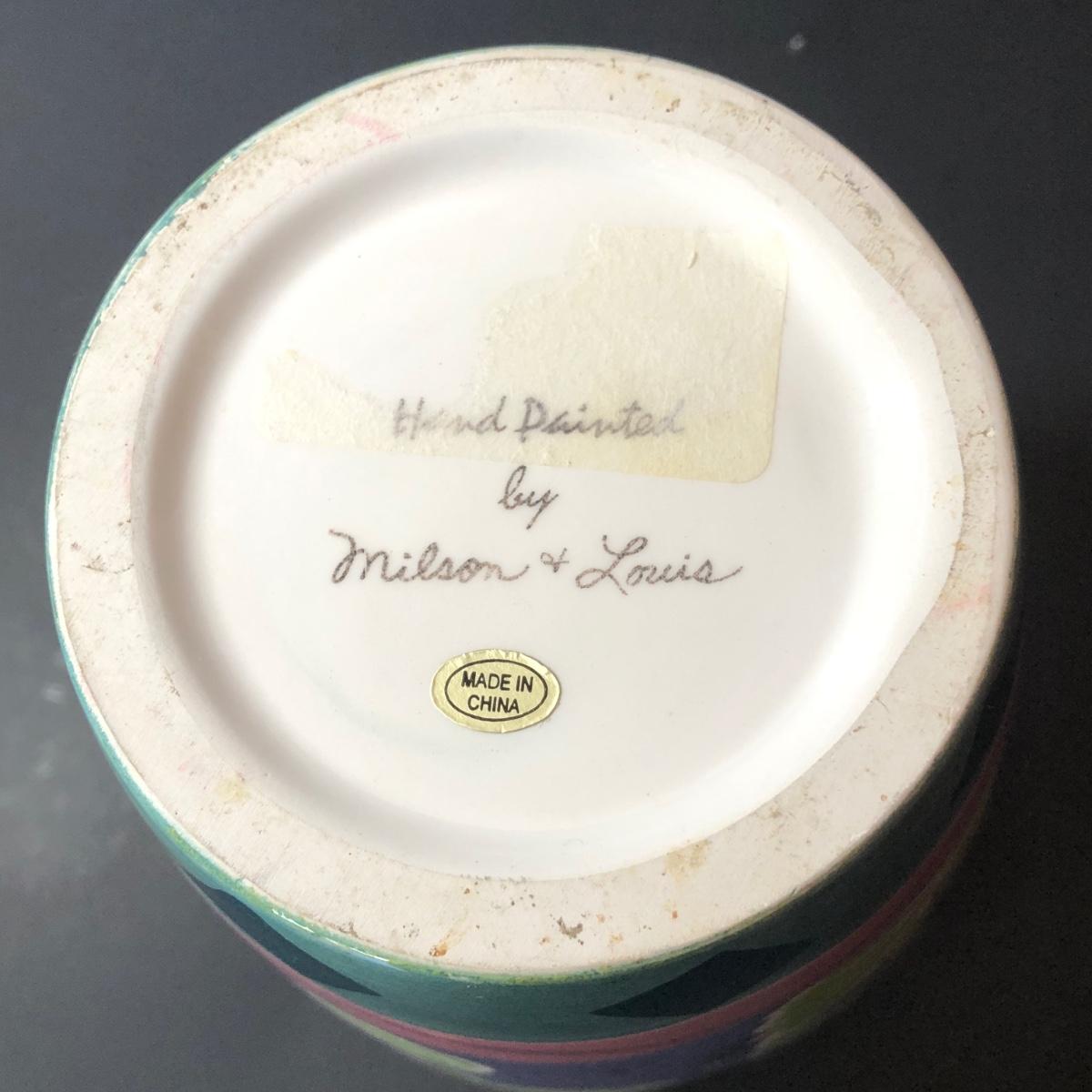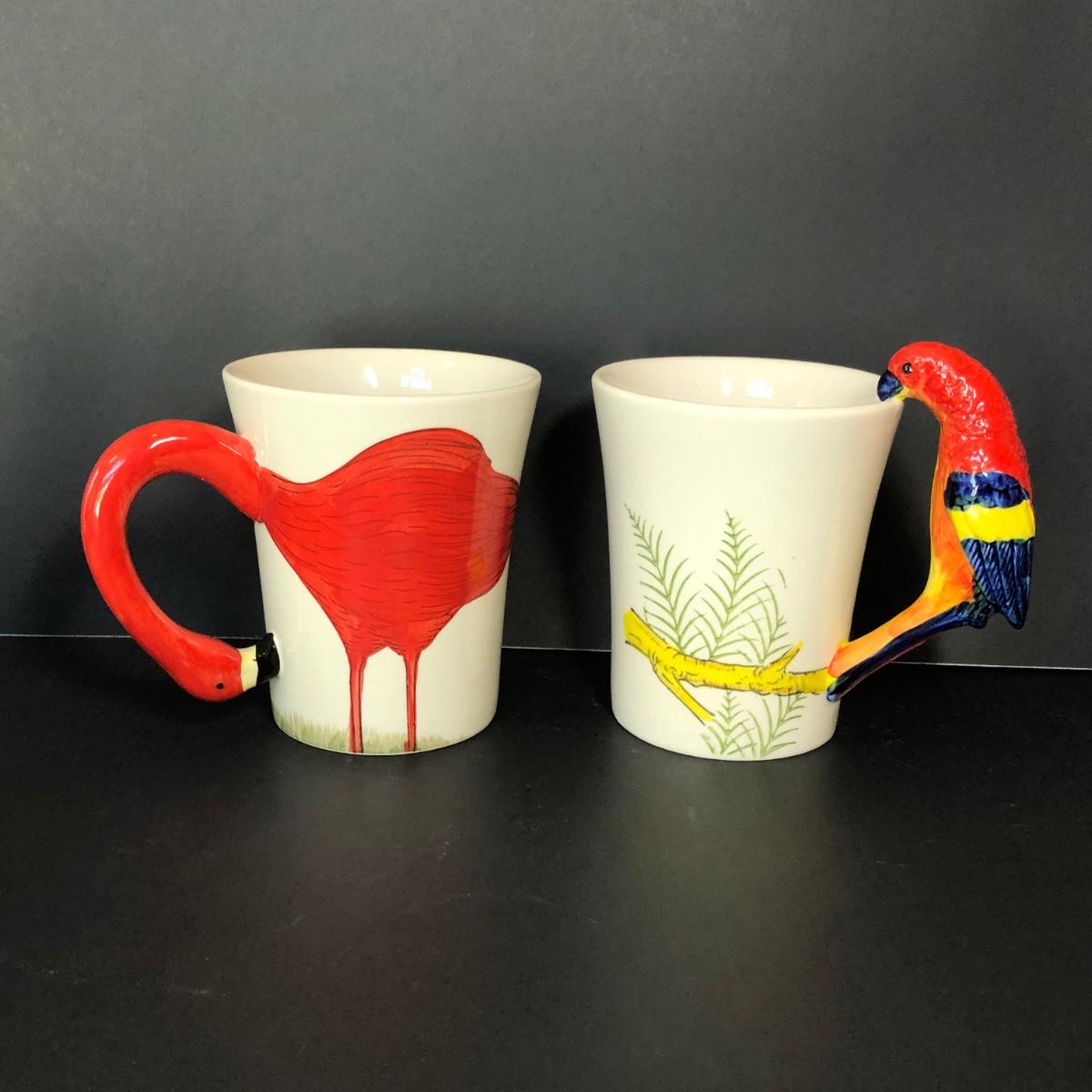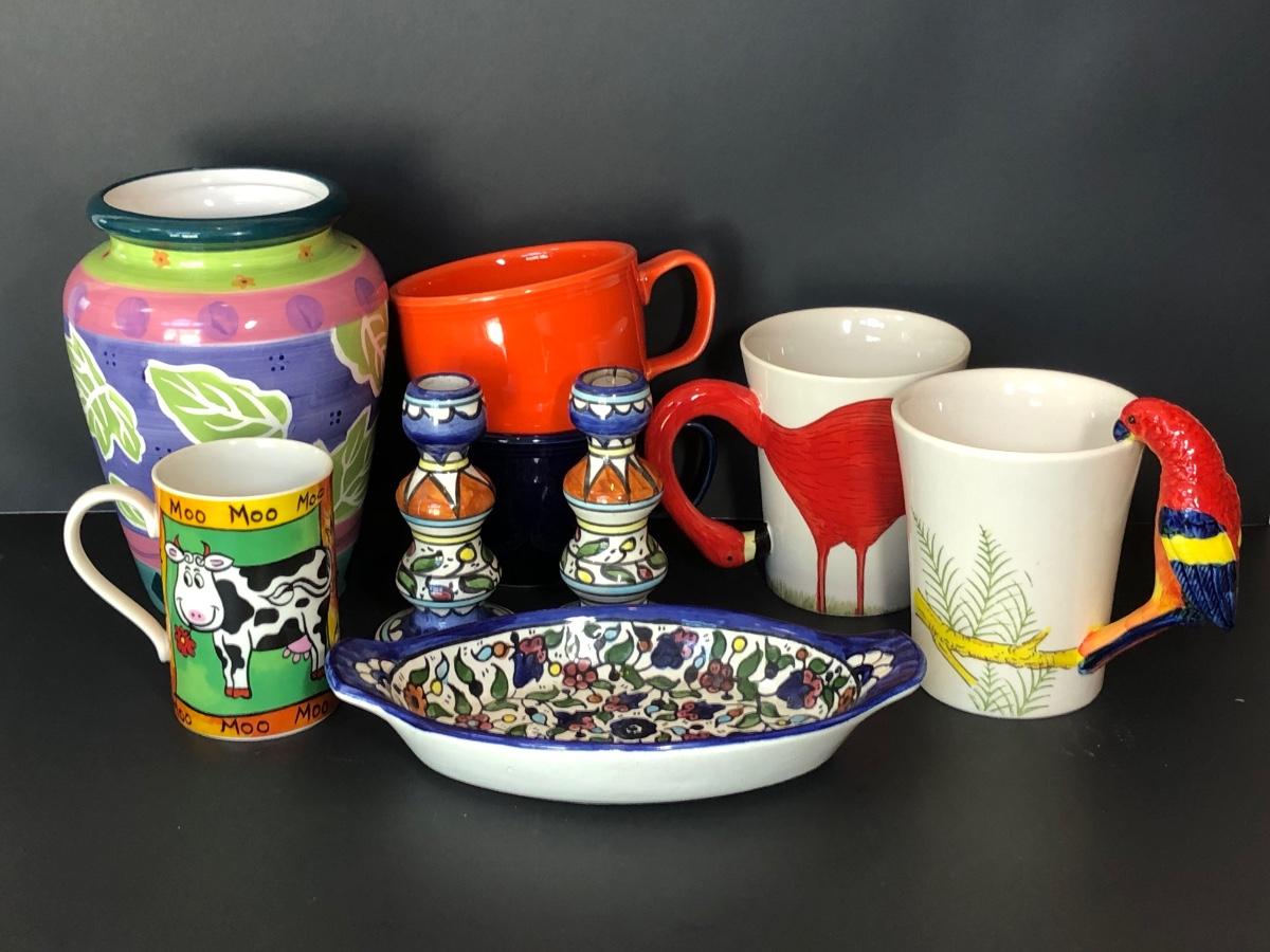 LOT 4M: Colorful Milson & Louise Hand-Painted Vase, Homer Laughlin China Mugs, Flamingo & Parrot Handled Mugs & More