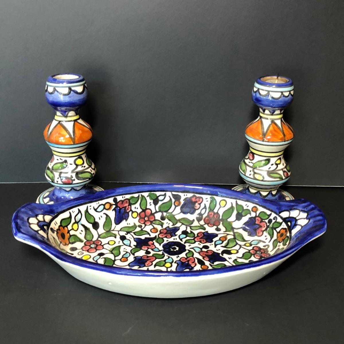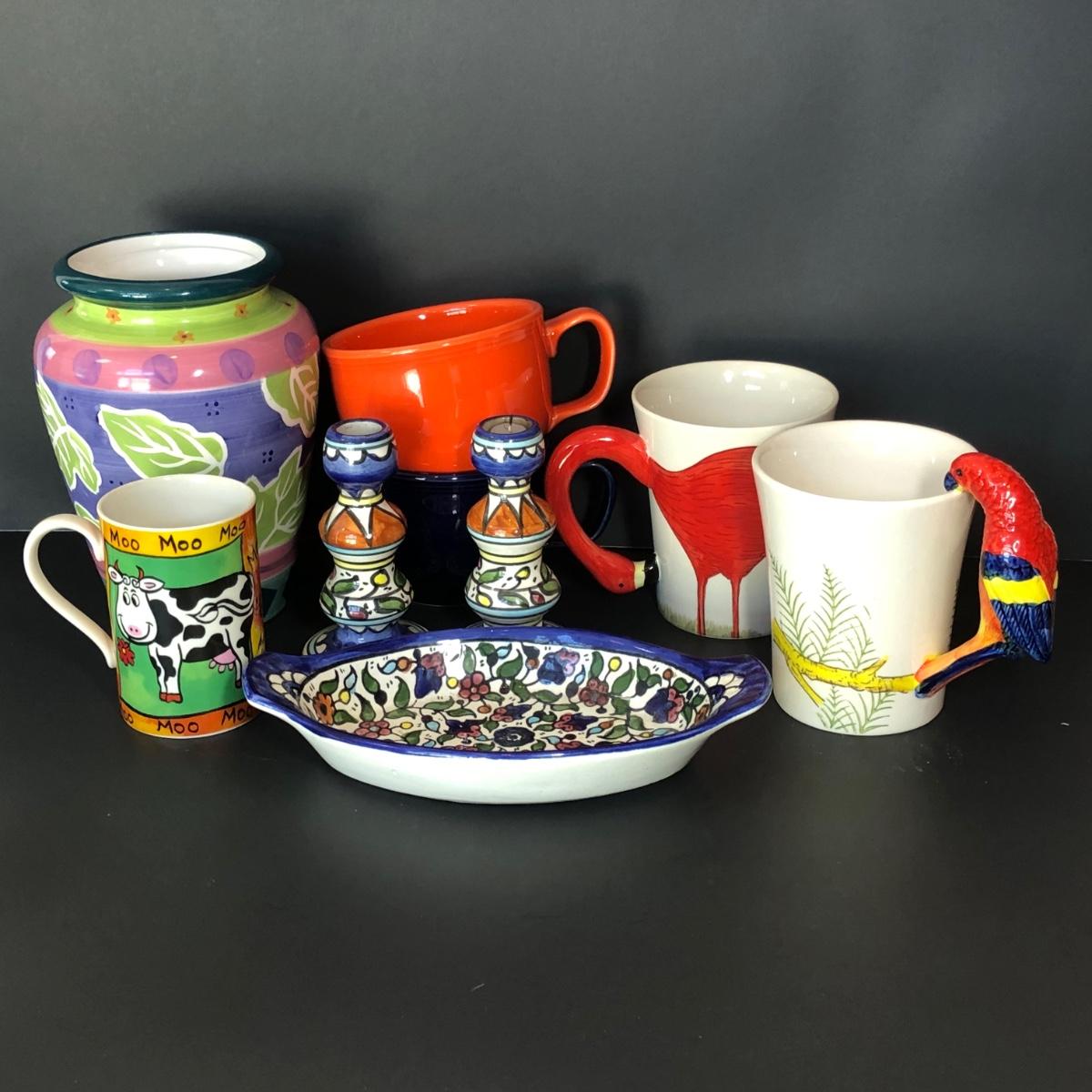 Includes a variety of mugs, serving dish, two candle holders and a vase.