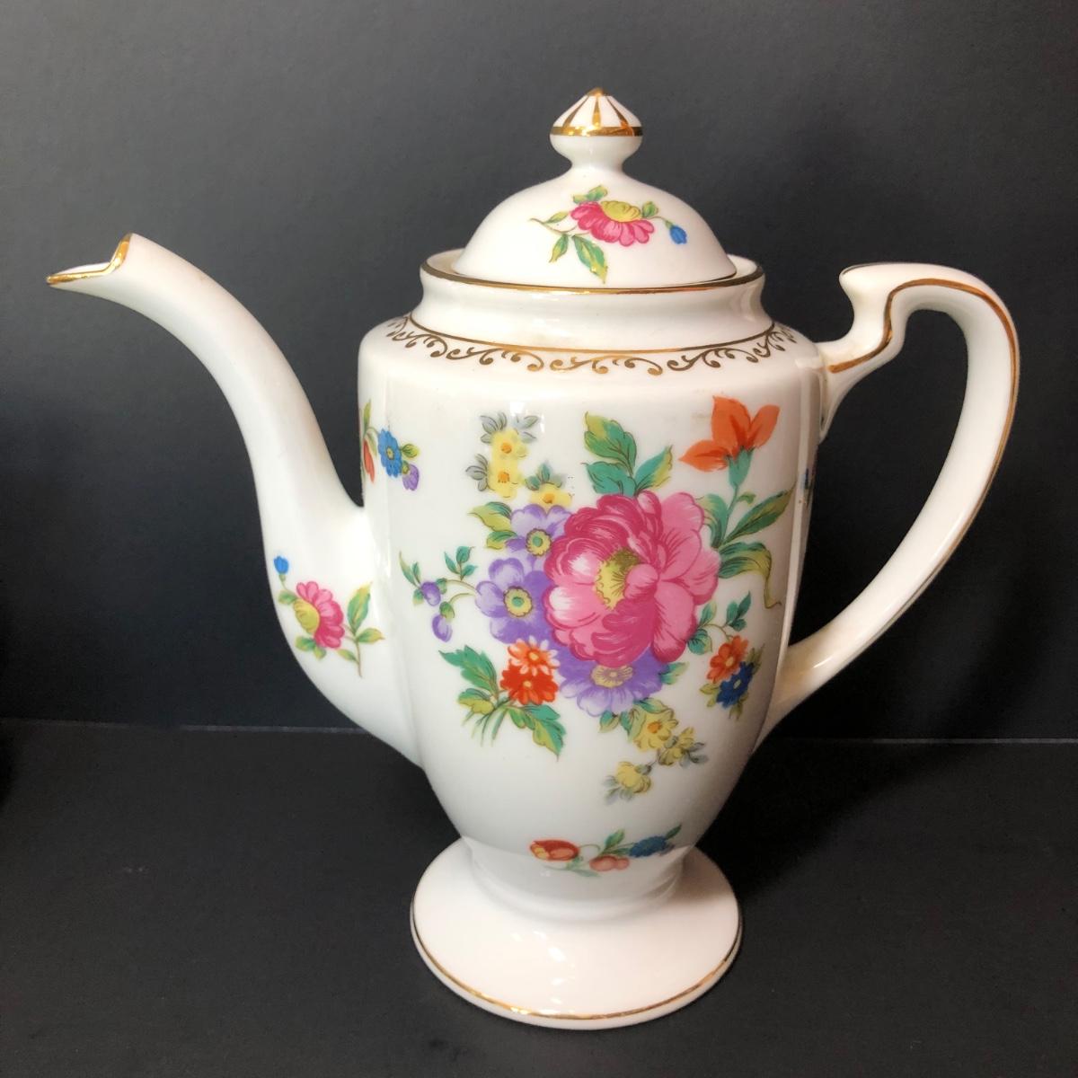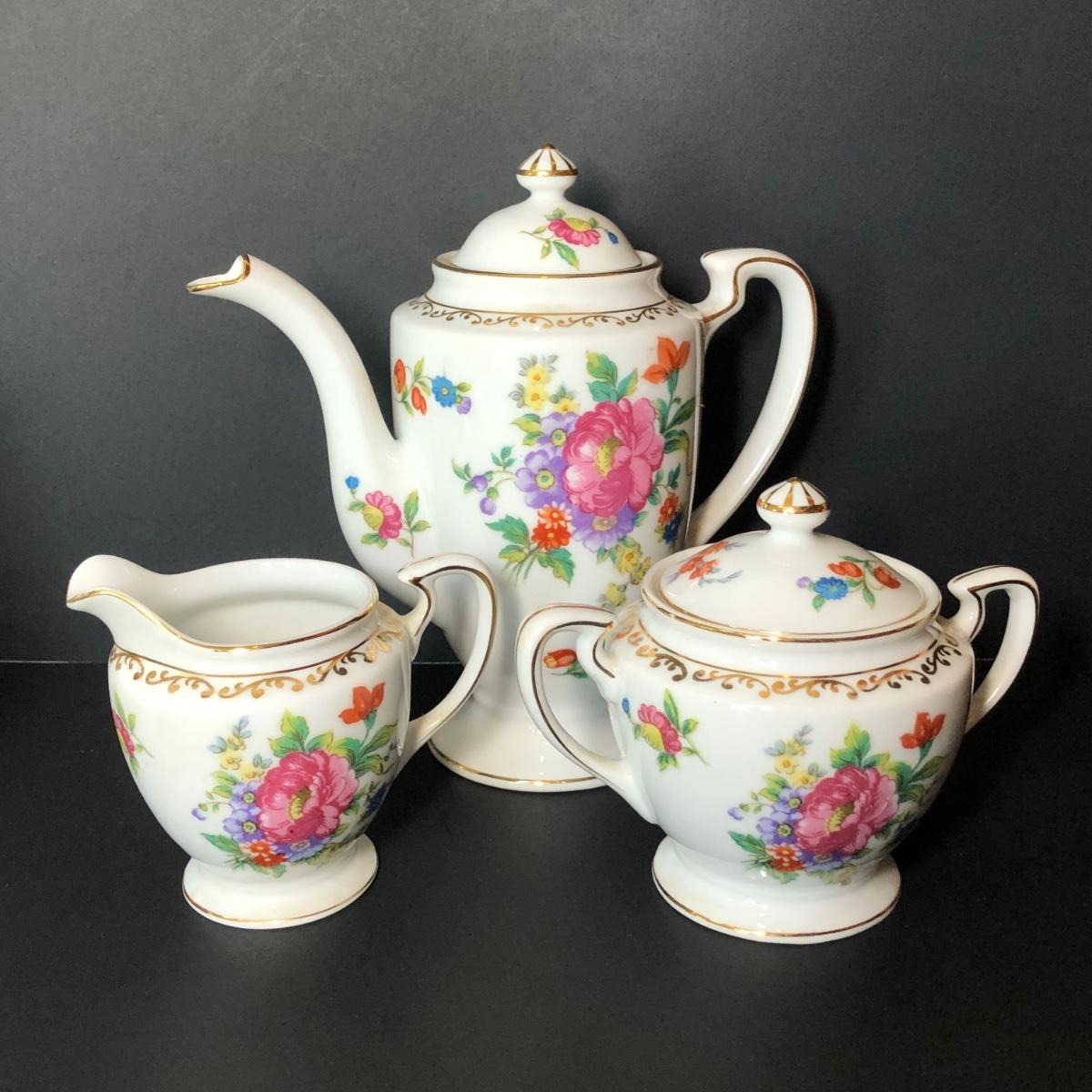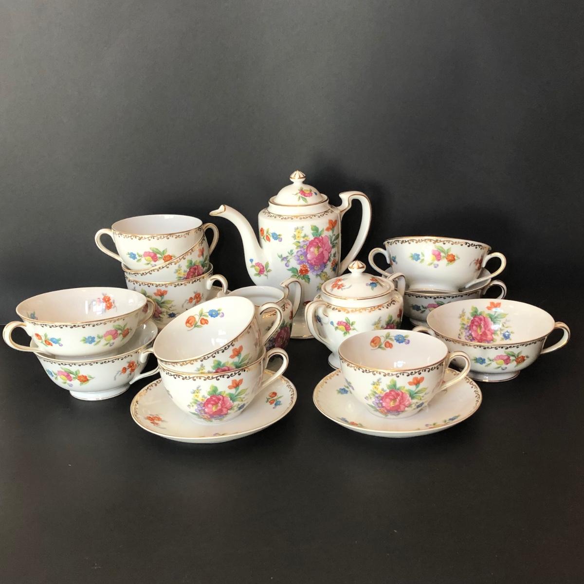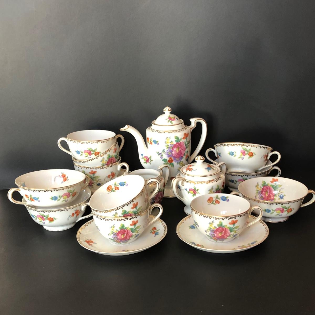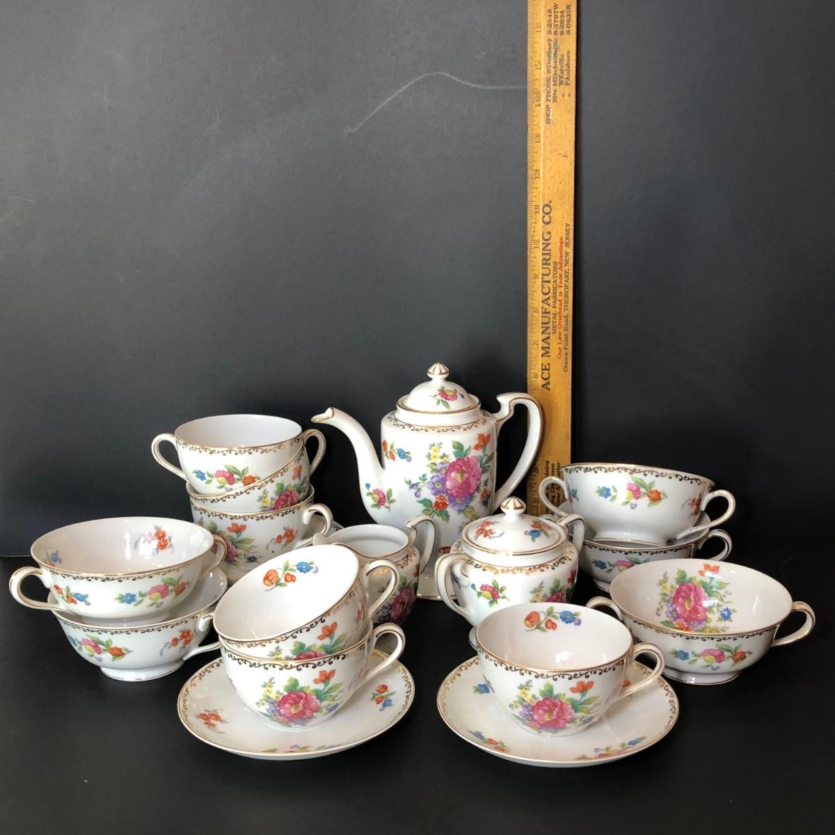 Set includes 5 bowls, 6 saucers, 6 tea cups, a tea pot, sugar bowl, and creamer.