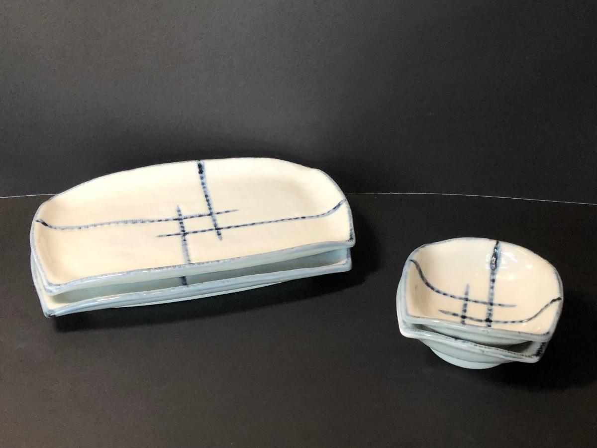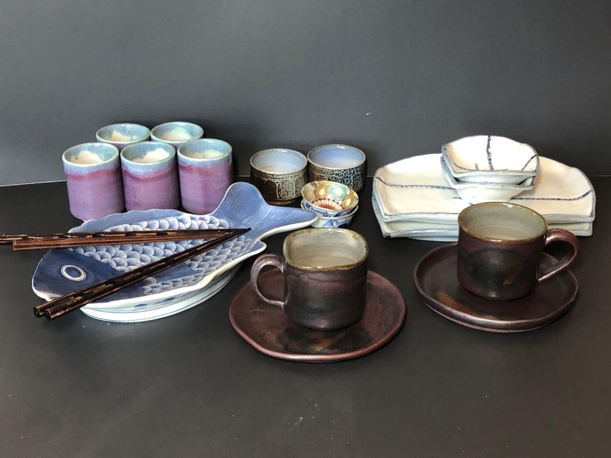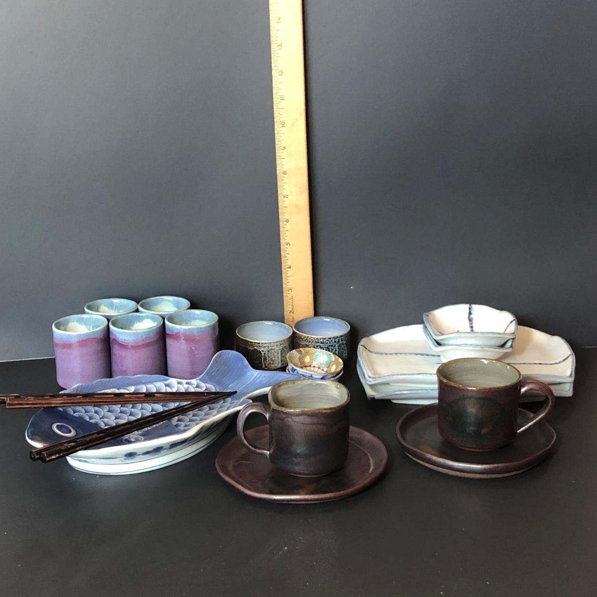 Includes a variety of tea cups, two small bowls, two sets of chopsticks, a fish plate, and some serving dishes.