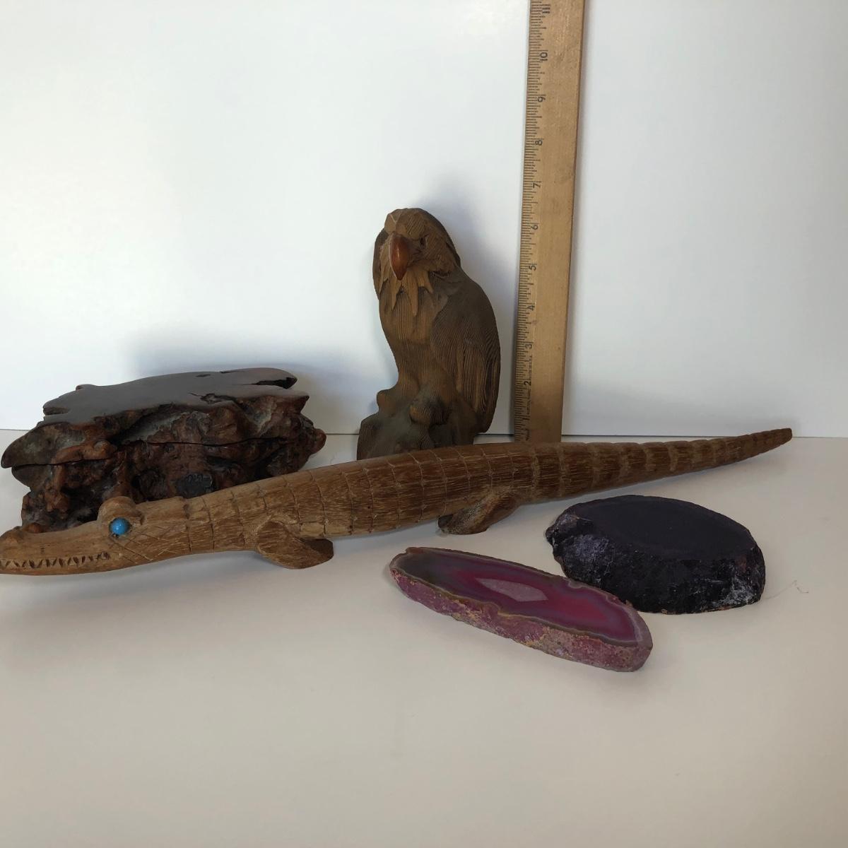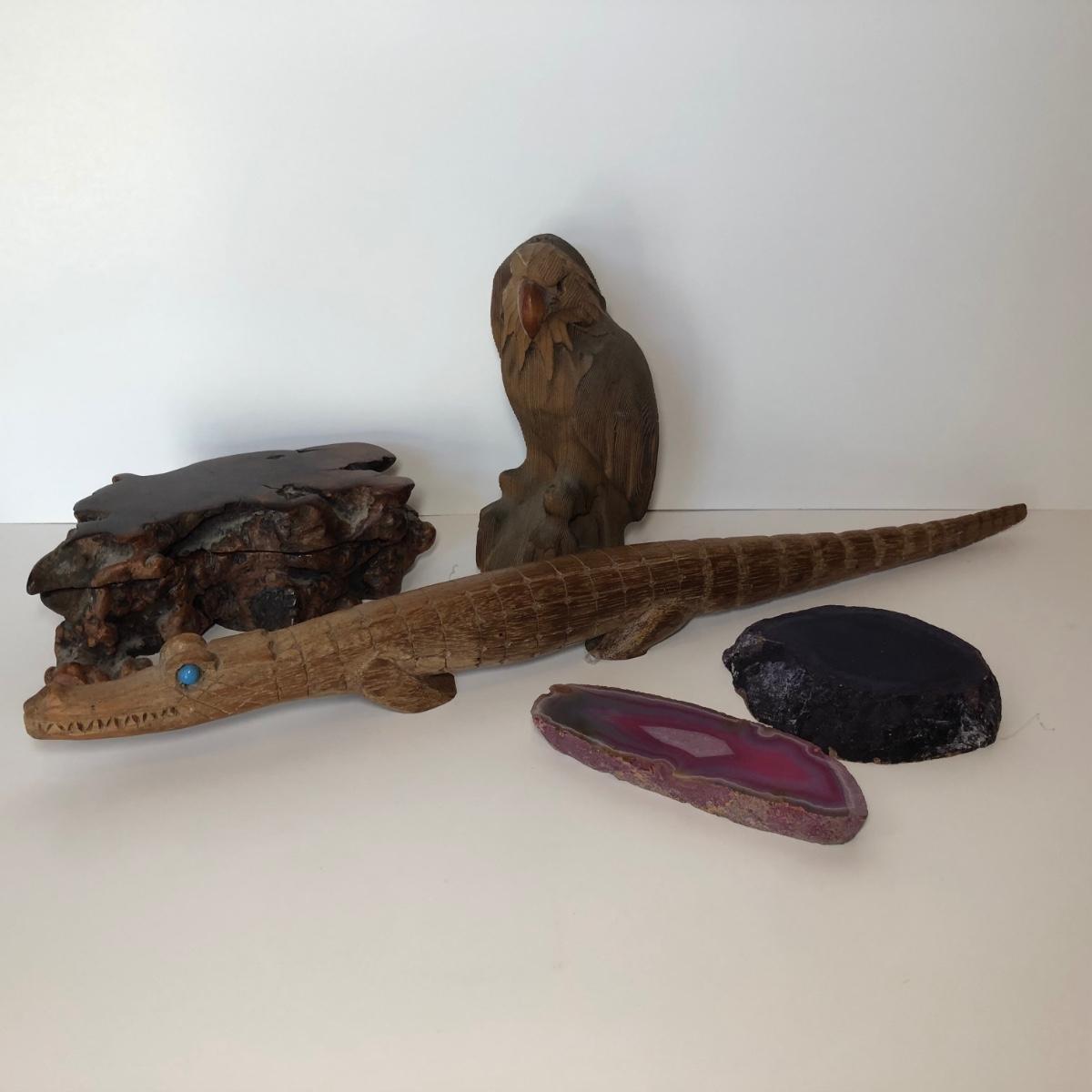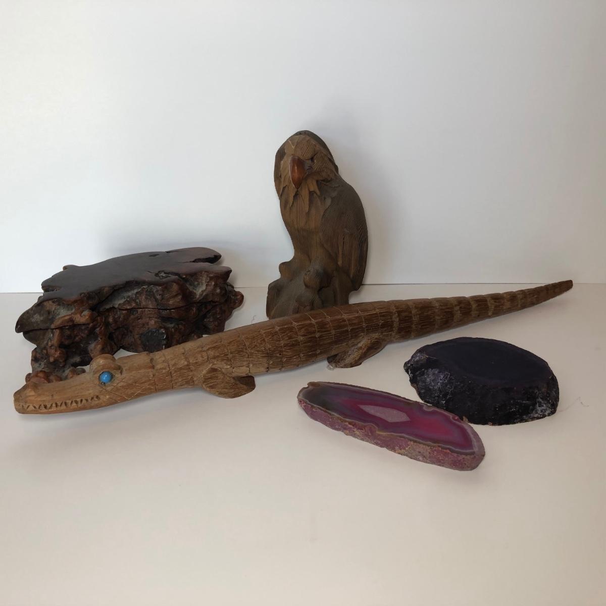 LOT 14M: Carved Wooden Eagle & Crocodile, Wood Trinket Box, Geodes