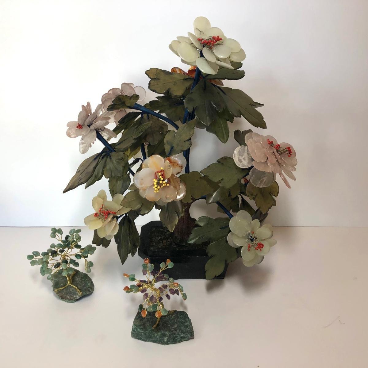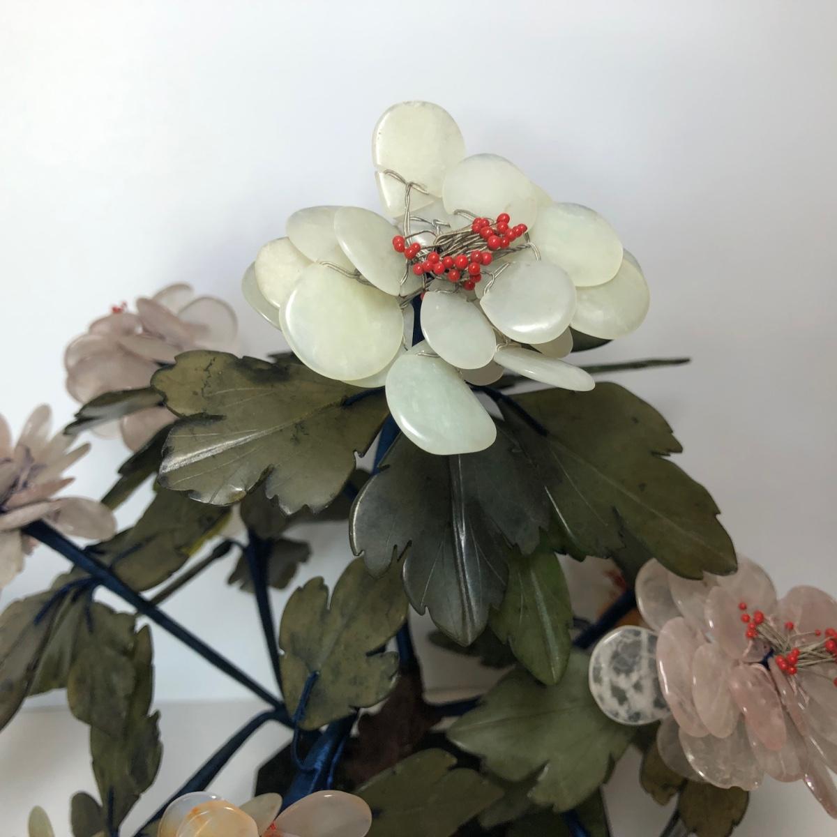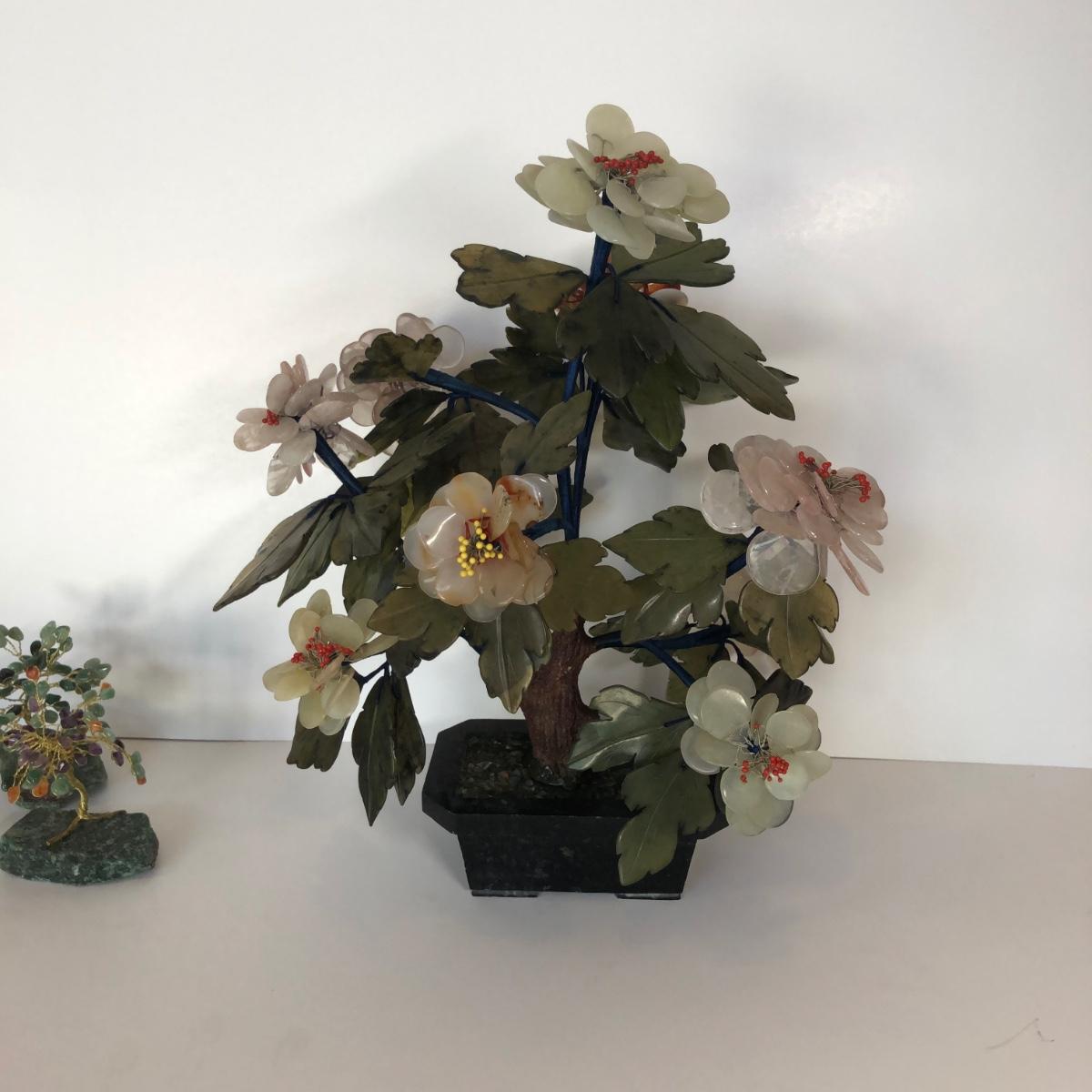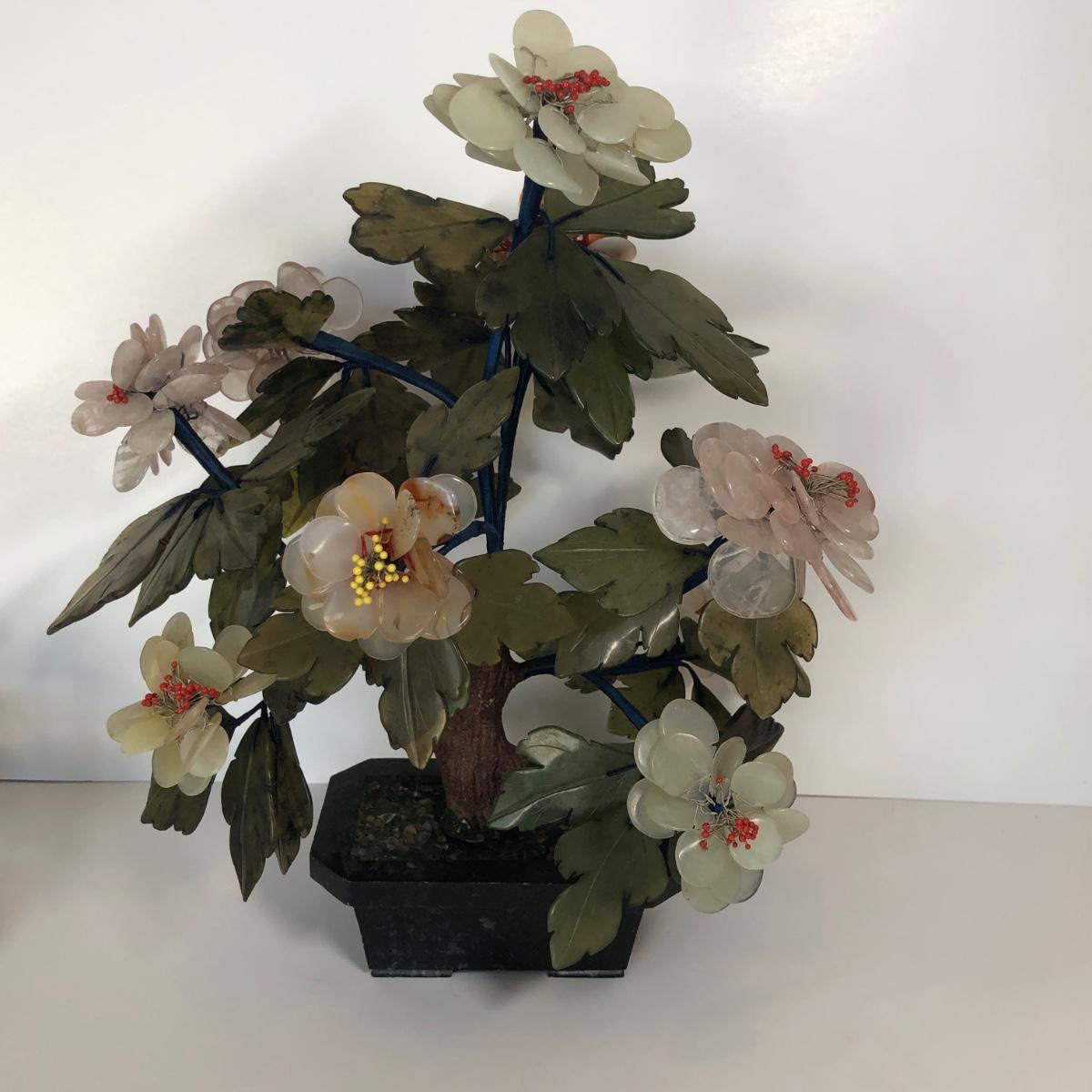 LOT 16M:  Beautiful Vintage  Jade Flower Tree w/ Multi-Petal Flowers in Stone Pot &  Miniature Stone/Jade Wired Trees