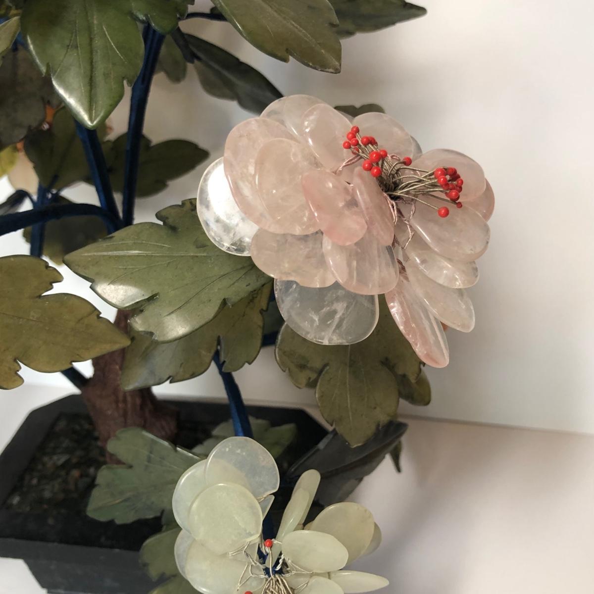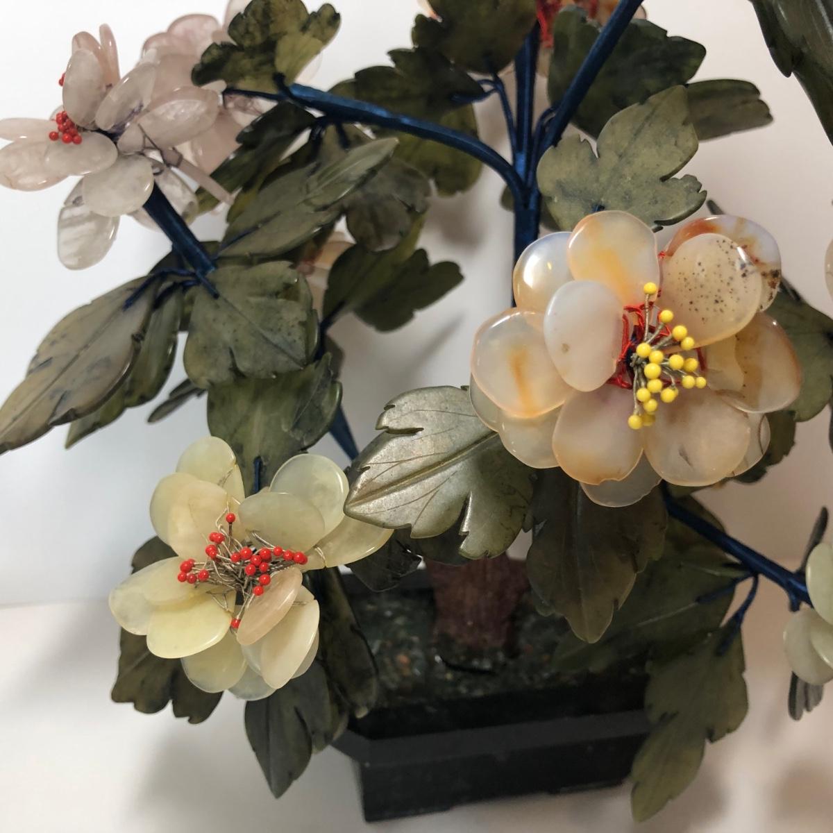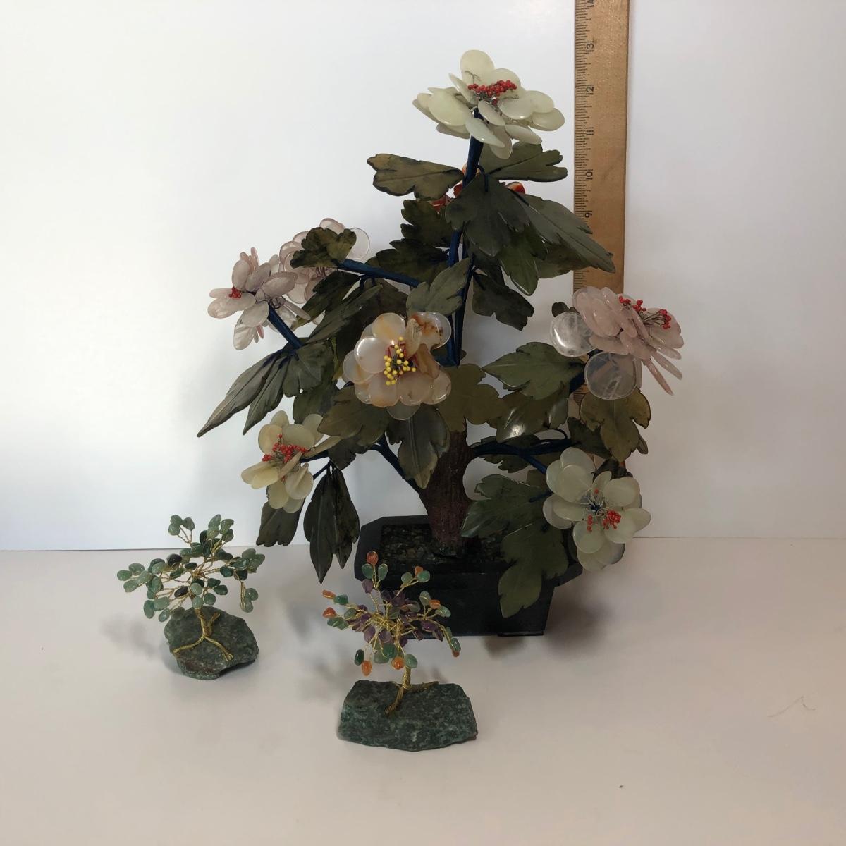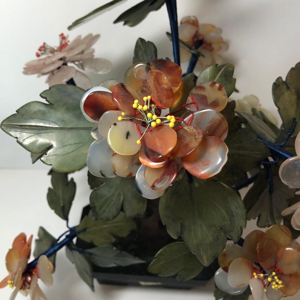 LOT 16M:  Beautiful Vintage  Jade Flower Tree w/ Multi-Petal Flowers in Stone Pot &  Miniature Stone/Jade Wired Trees
