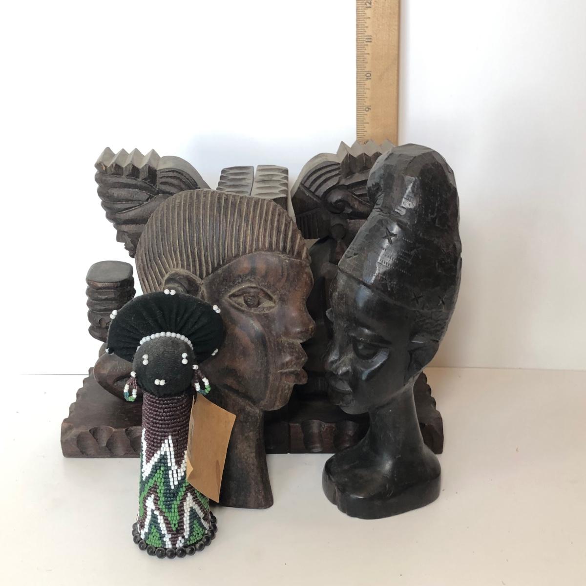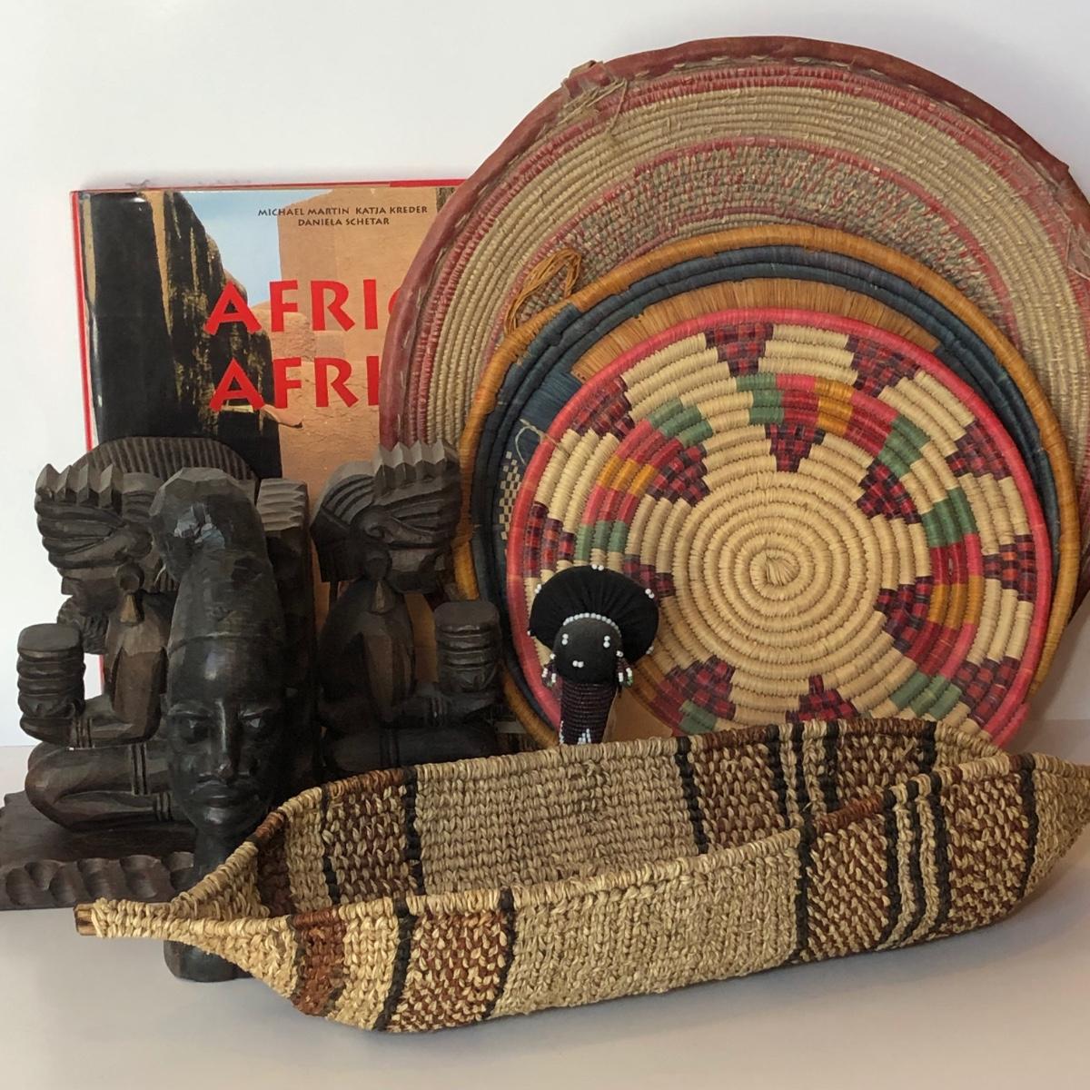 LOT 18M: Zulu Matron Doll, Woven Baskets, Carved Wood Bookends & Statues, Africa Book