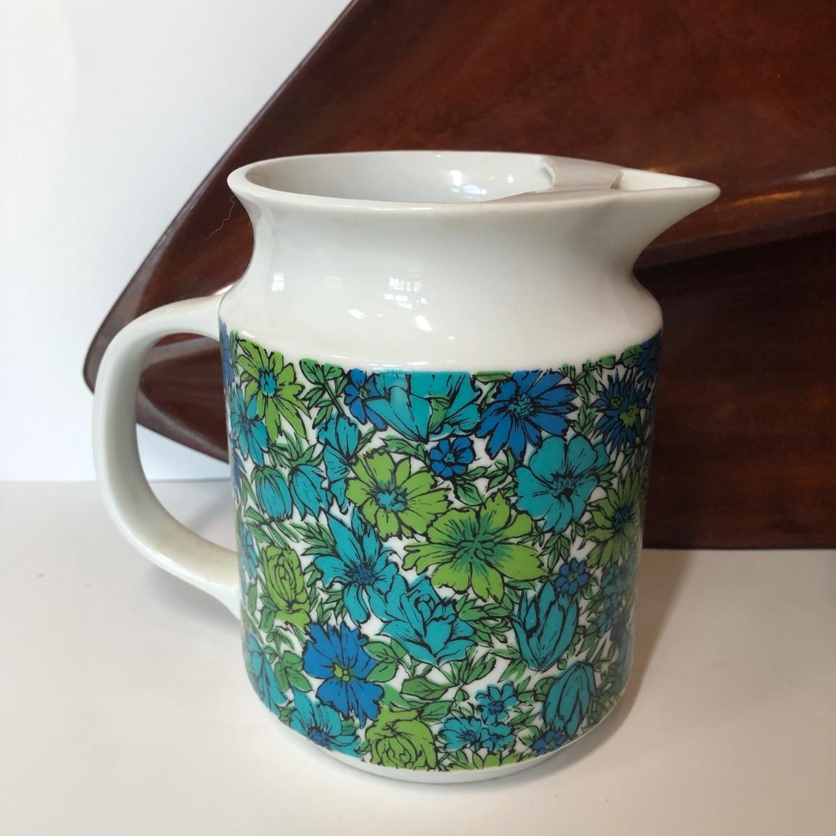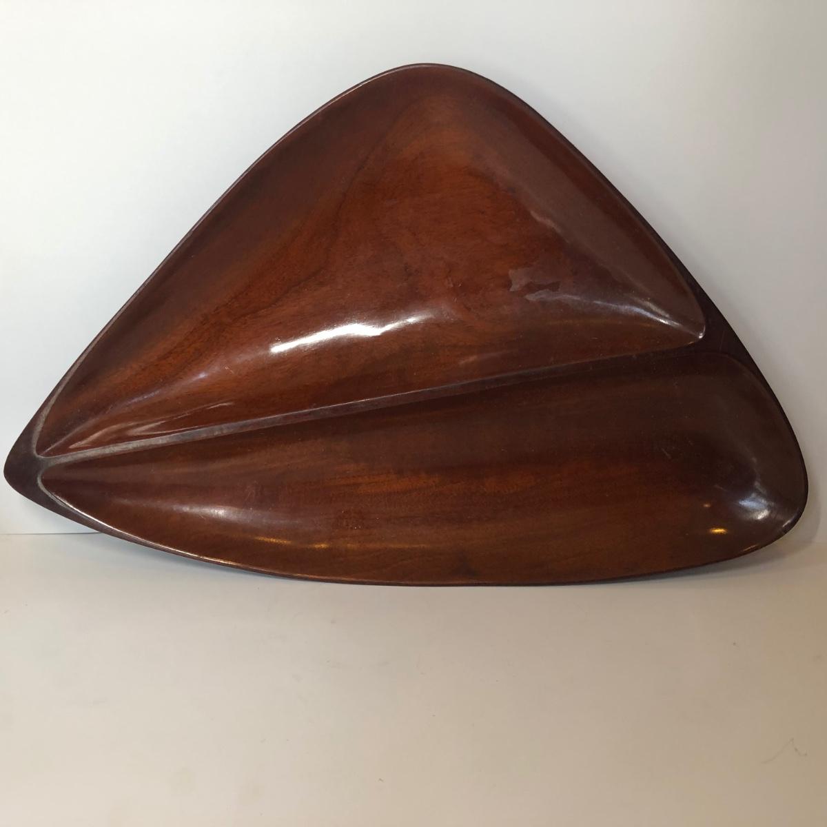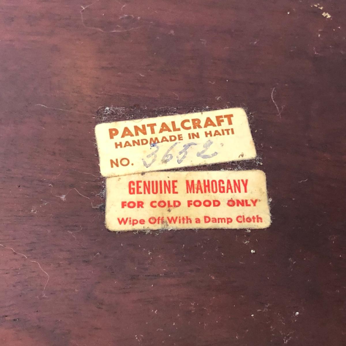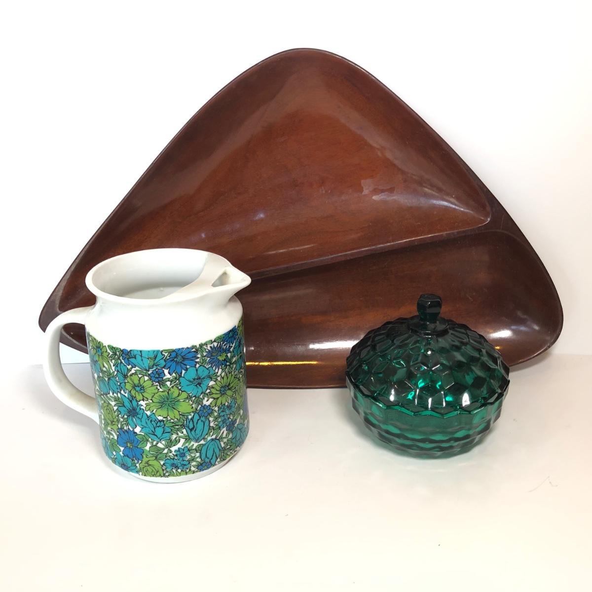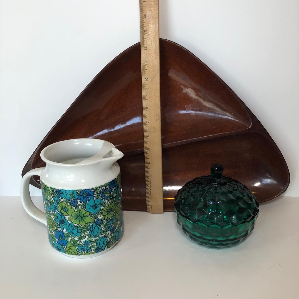 LOT 21M: Vintage Pantalcraft Mahogany Serving Tray, Turquoise Glass Candy Dish & Floral Pitcher