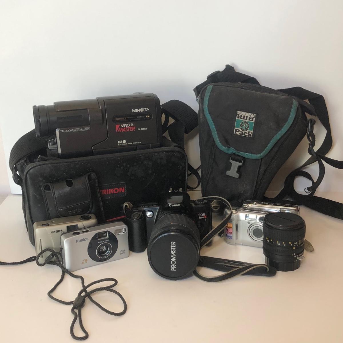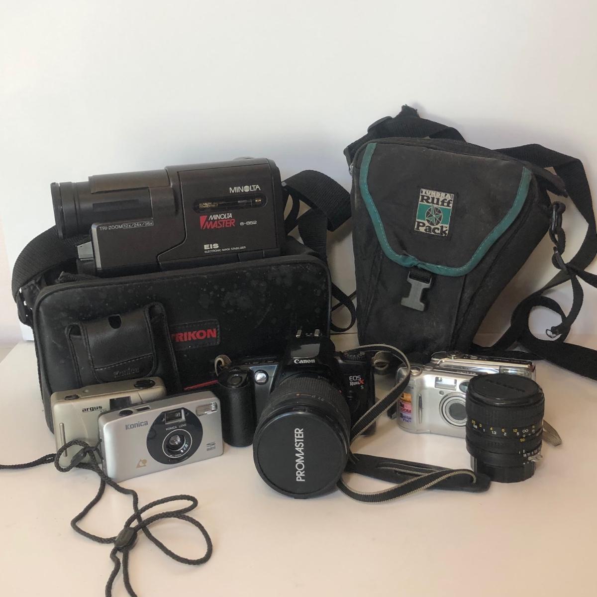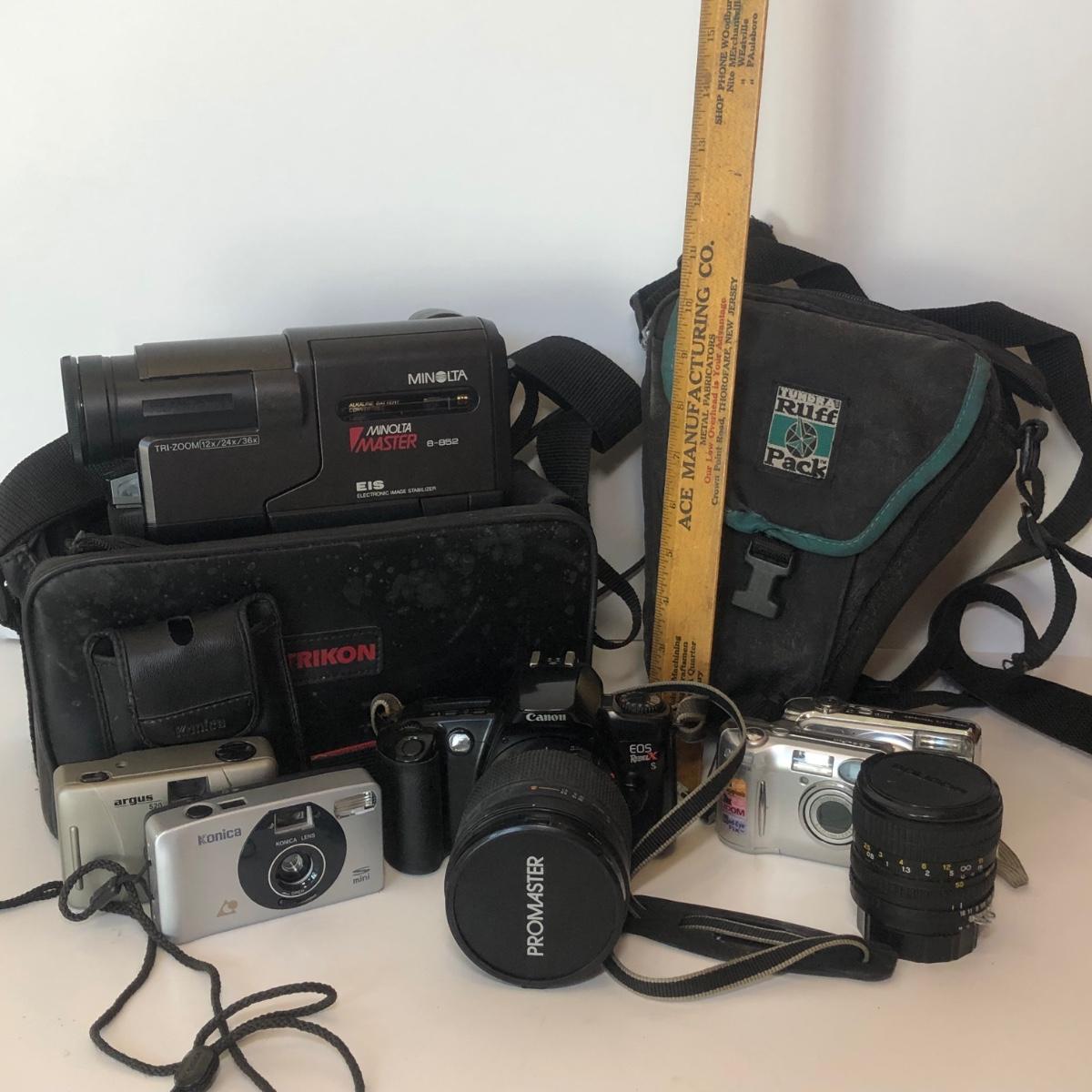 Includes two more point and shoot film cameras and two digital point and shoot cameras. Also includes bags for the Minolta and the Canon.