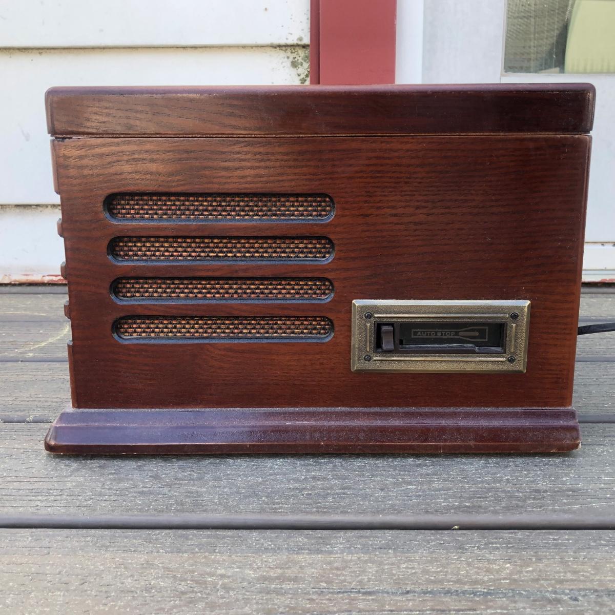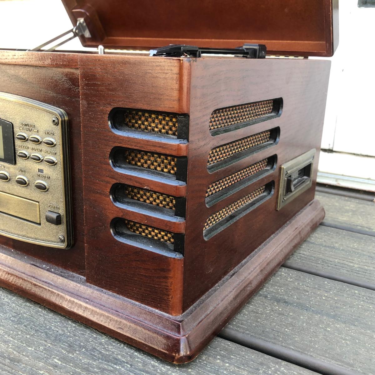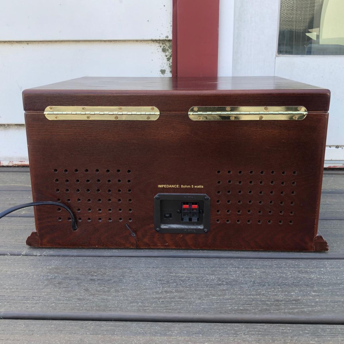 Plays records, tapes, and CDs. Untested. Measures 16.5W x 13.5D x 10H.