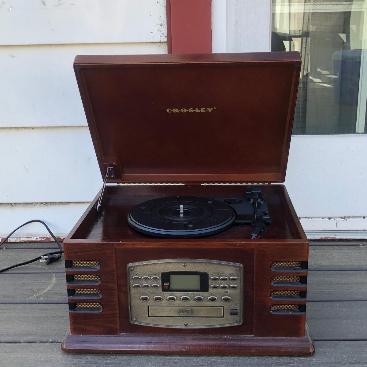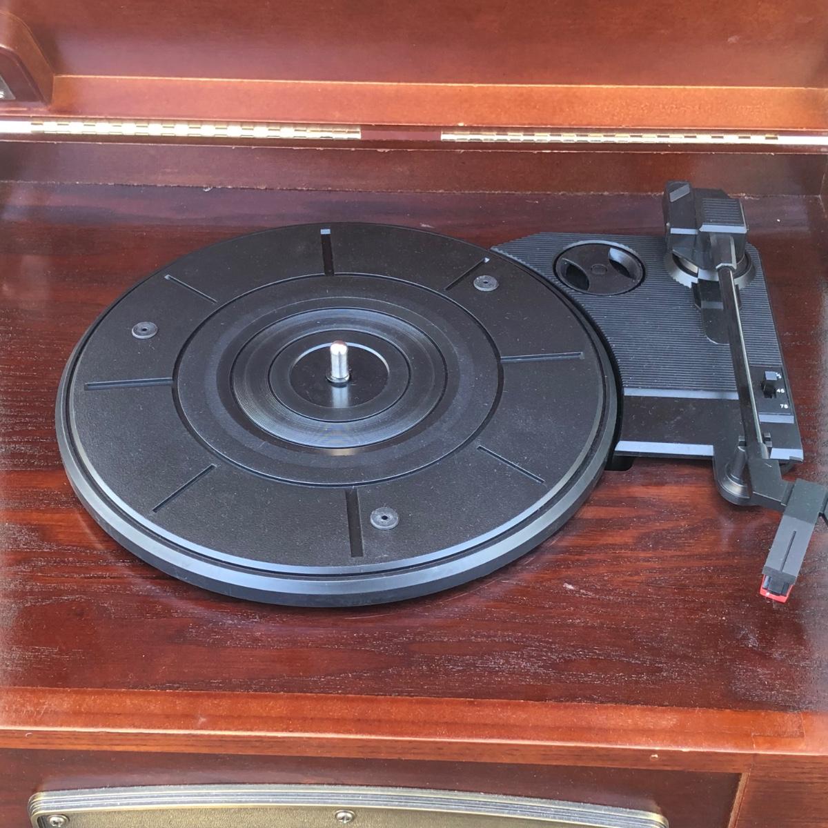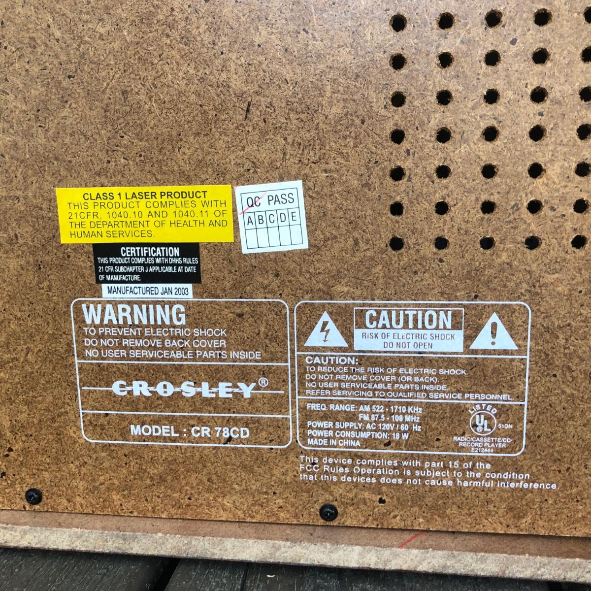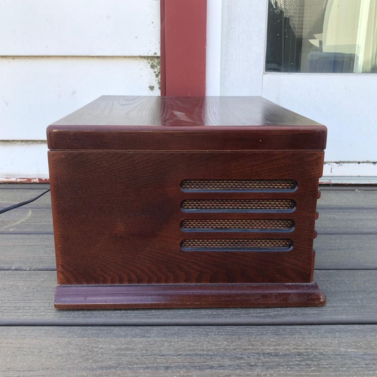 Plays records, tapes, and CDs. Untested. Measures 16.5W x 13.5D x 10H.