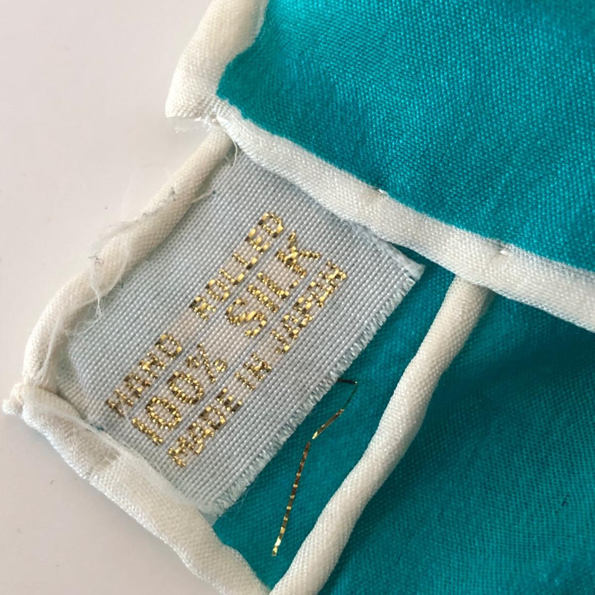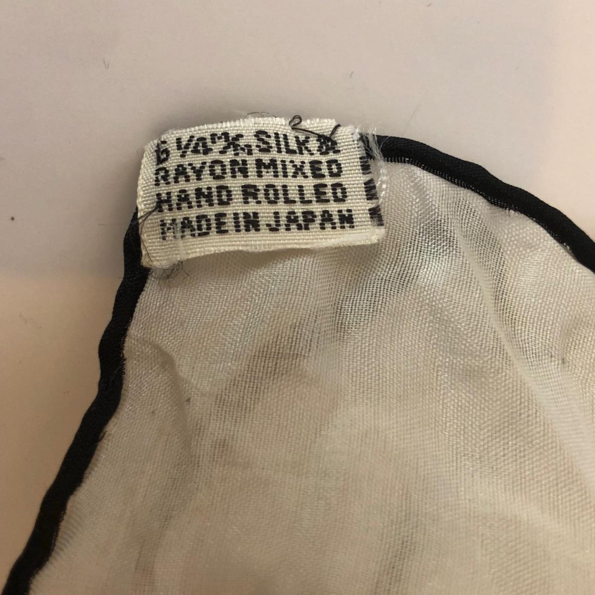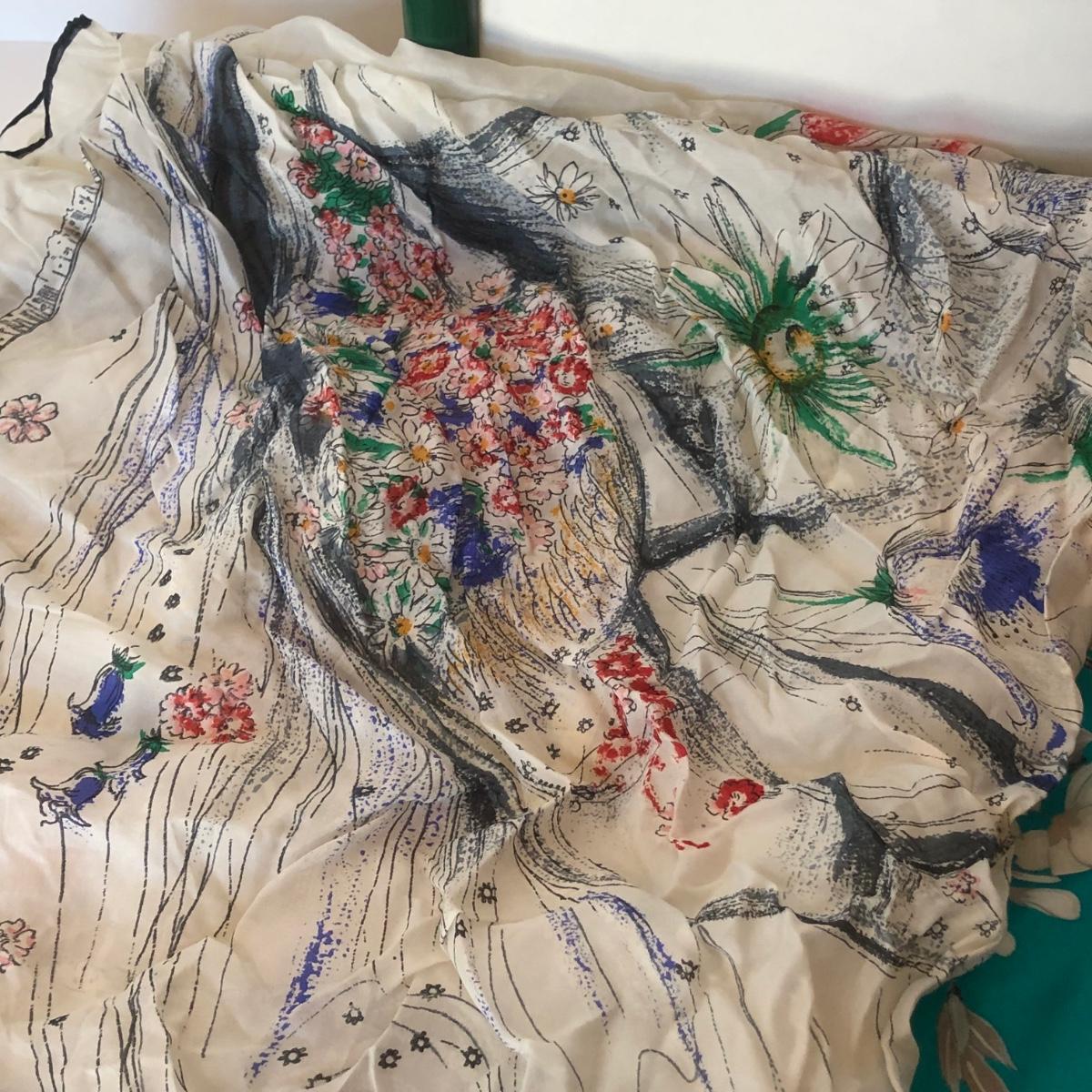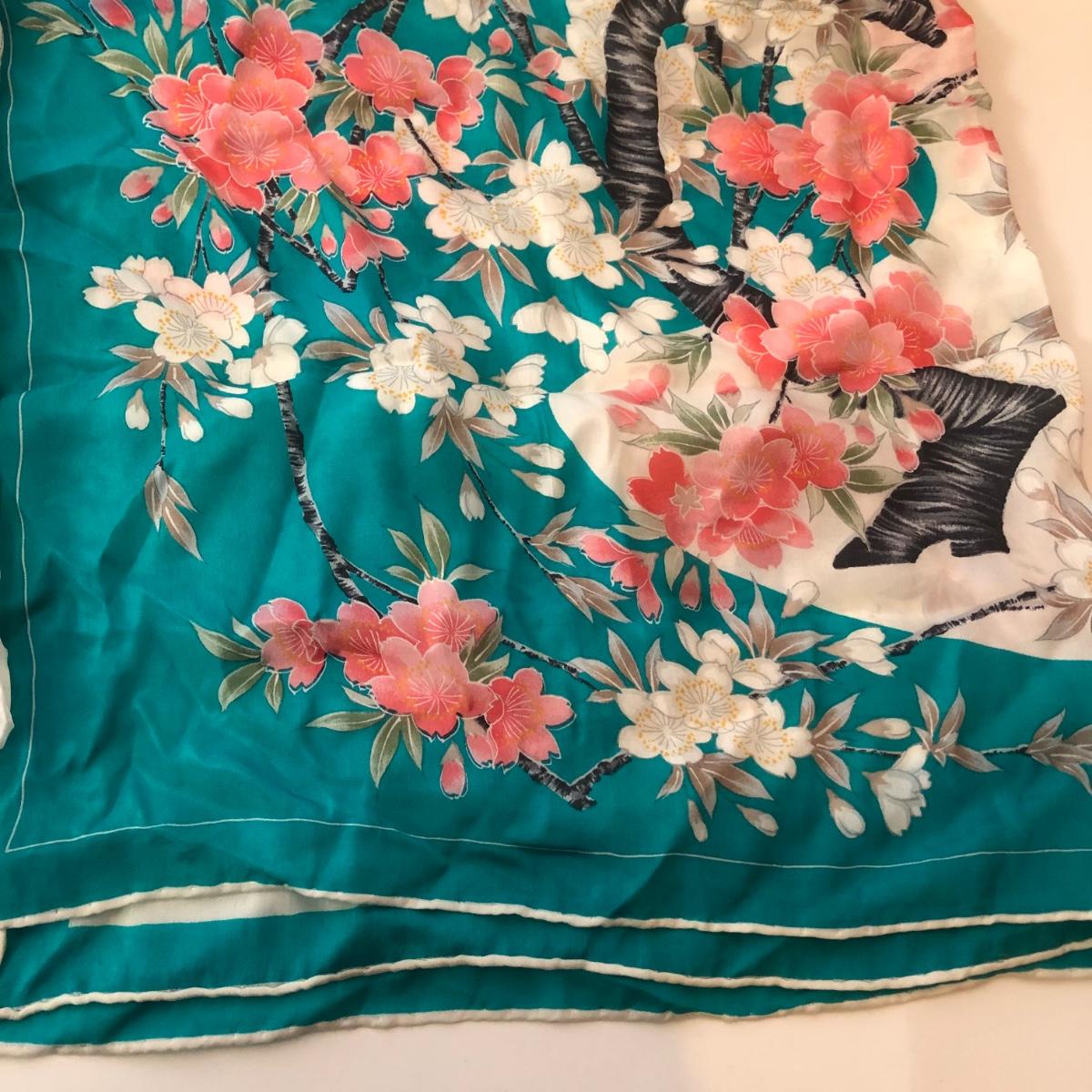 Scarves are both made in Japan. Embroidery is matted and framed with a green frame.