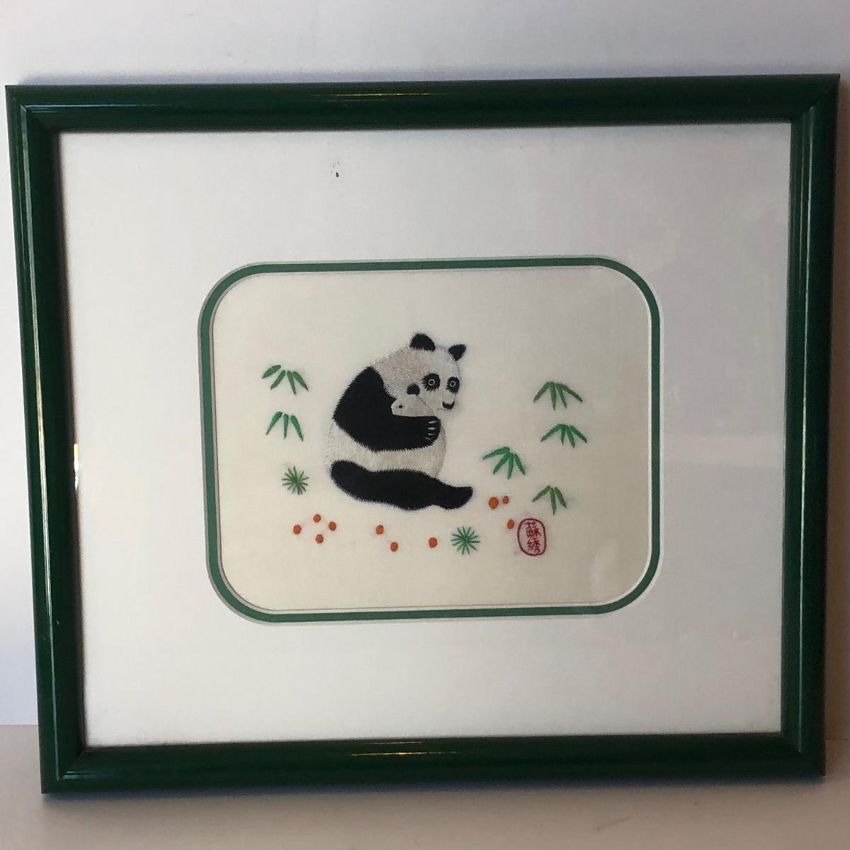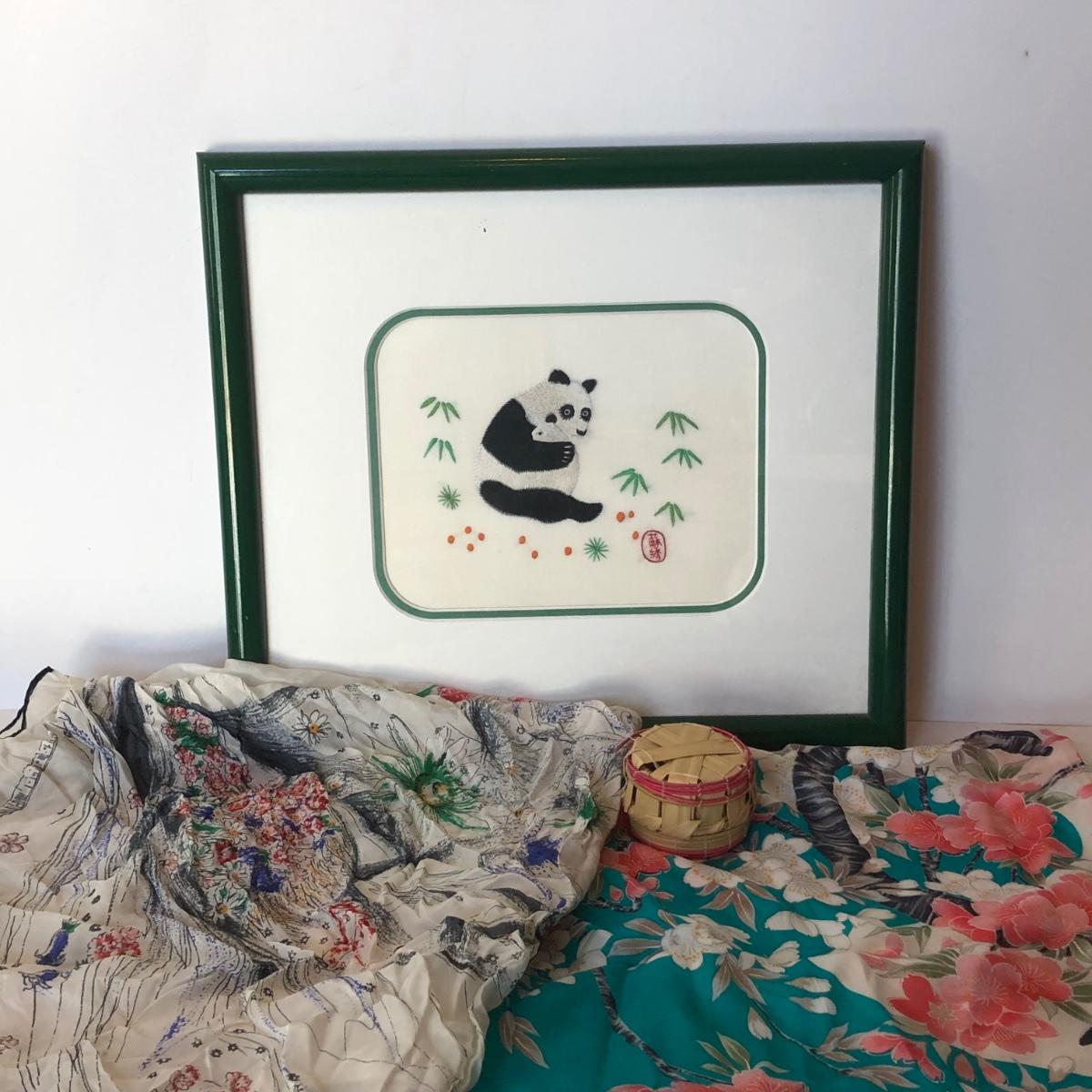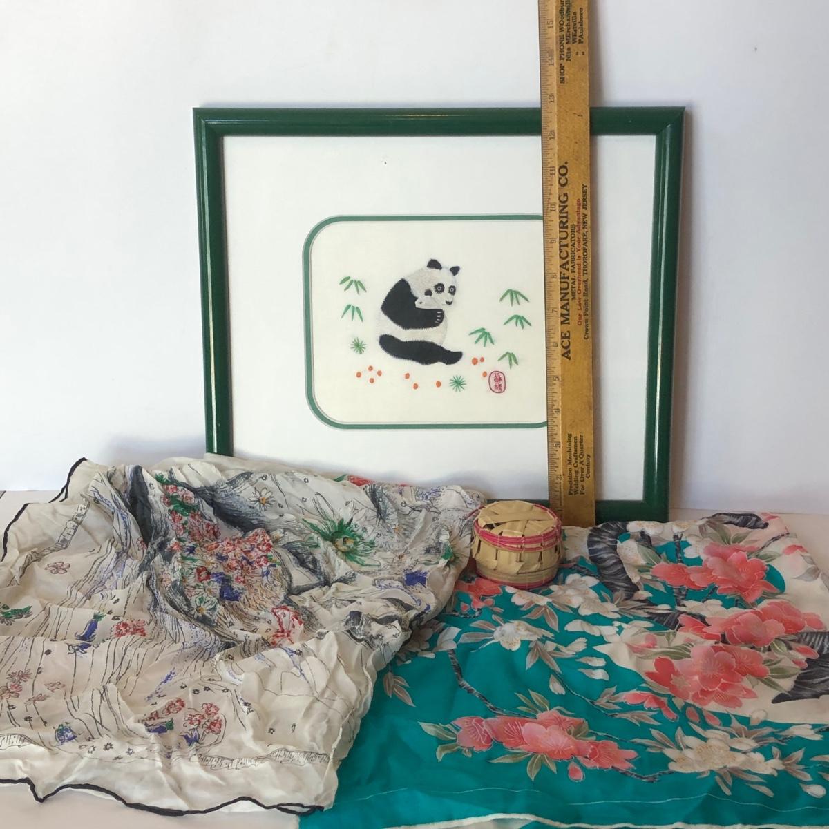 LOT 50M: Framed Panda Embroidery, Silk Scarves & Woven Mini Basket