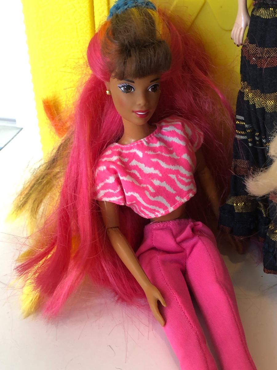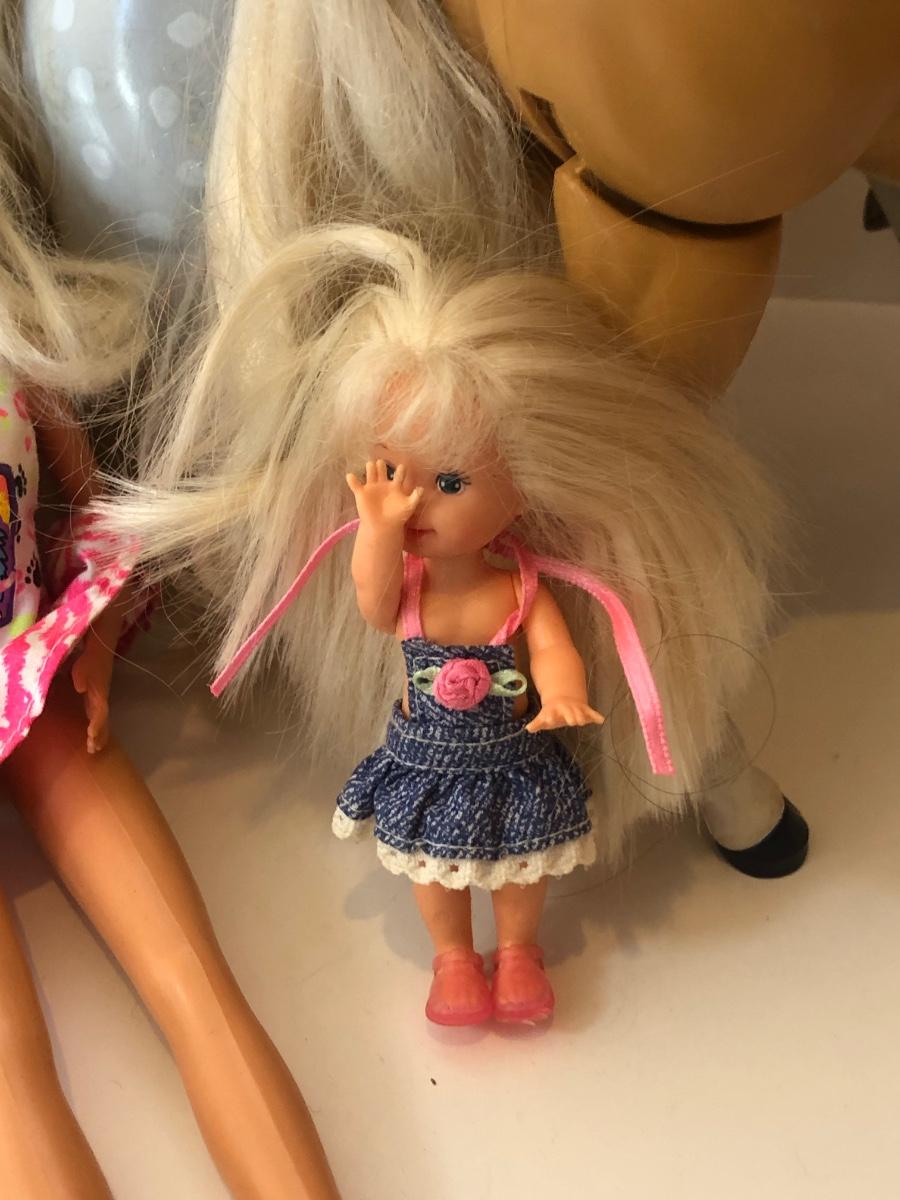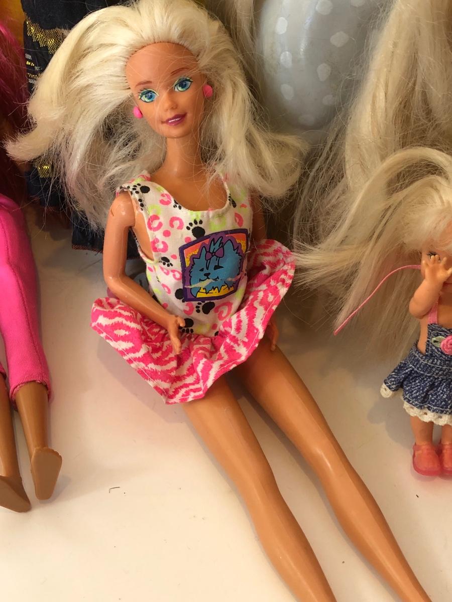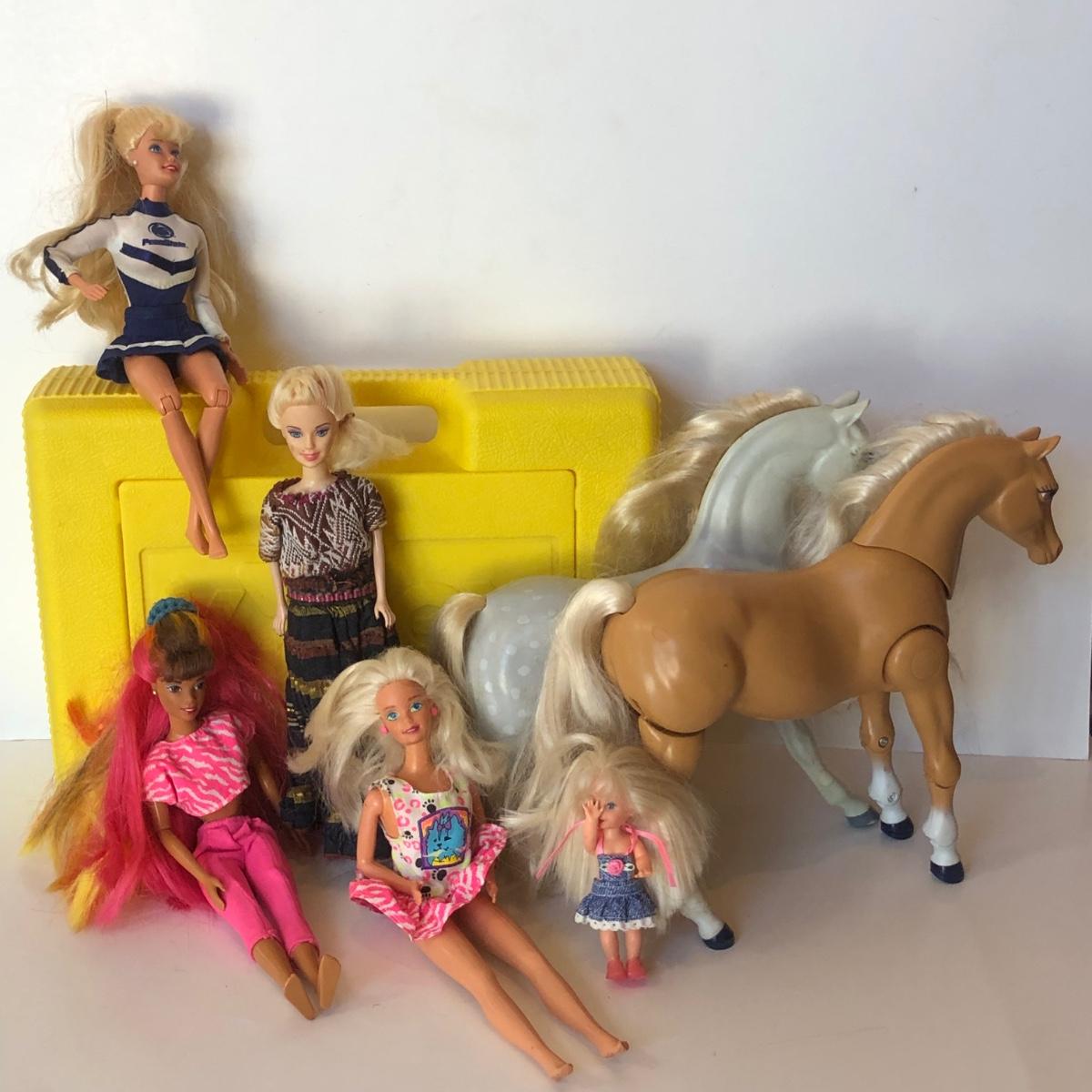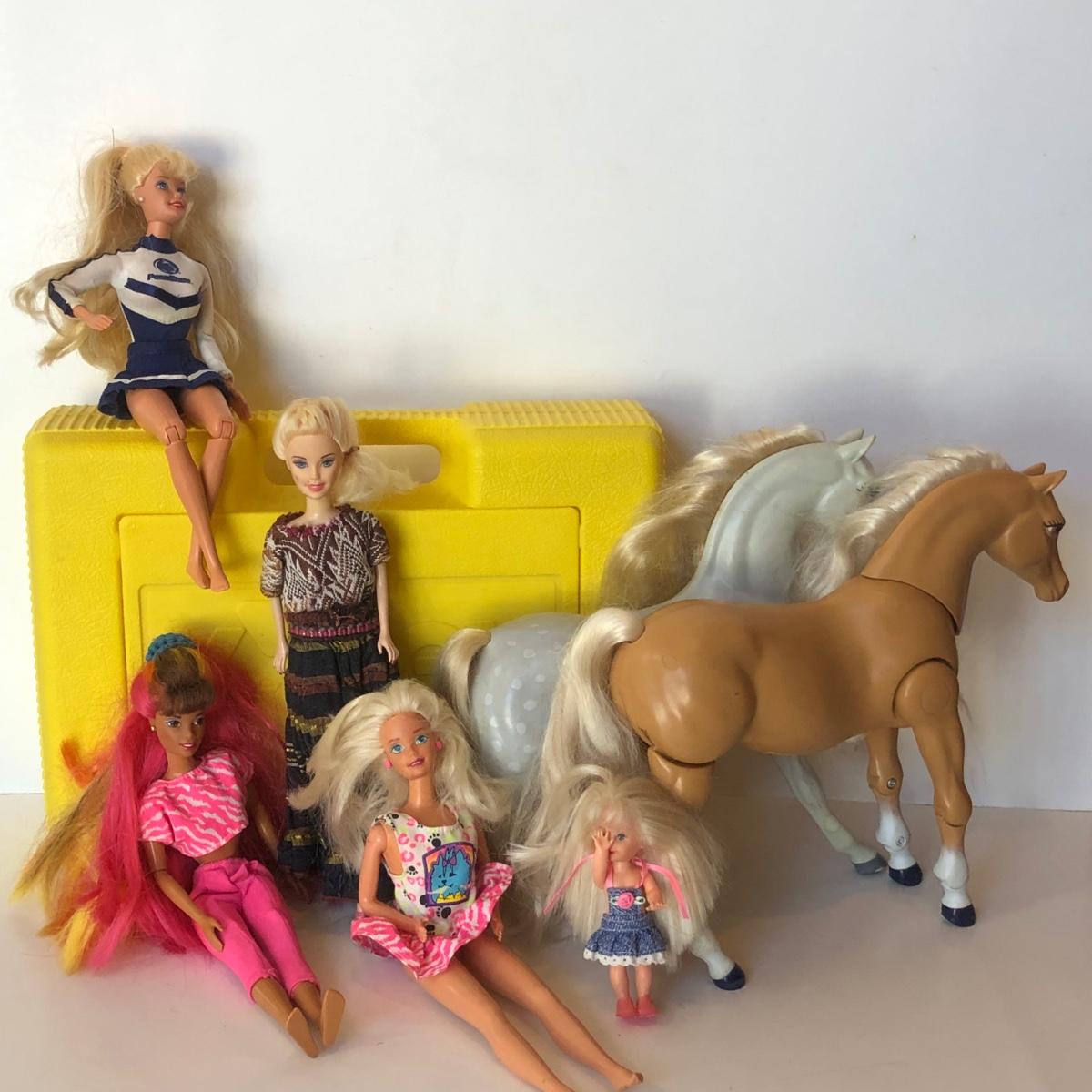 Includes four Barbie dolls, one Kelly doll, two Mattel horses and a small case of K'nex building toys.