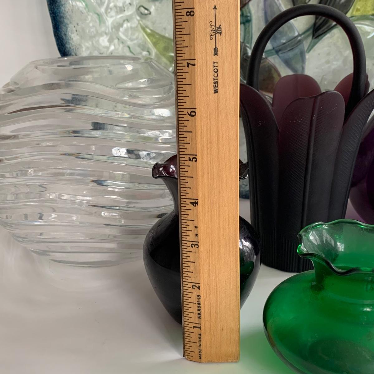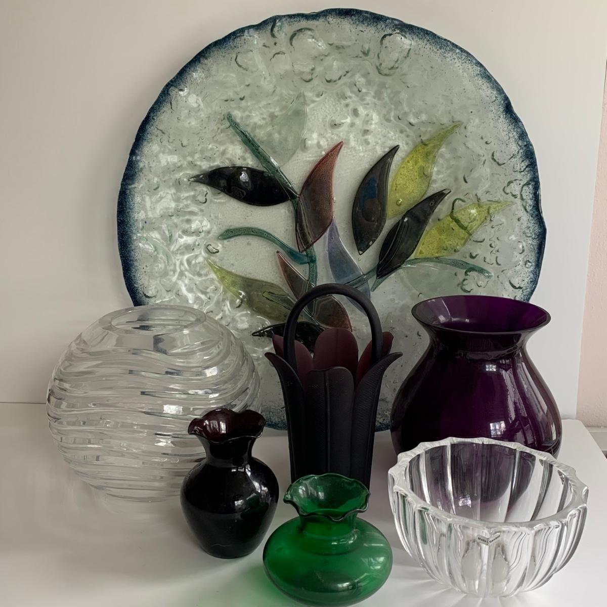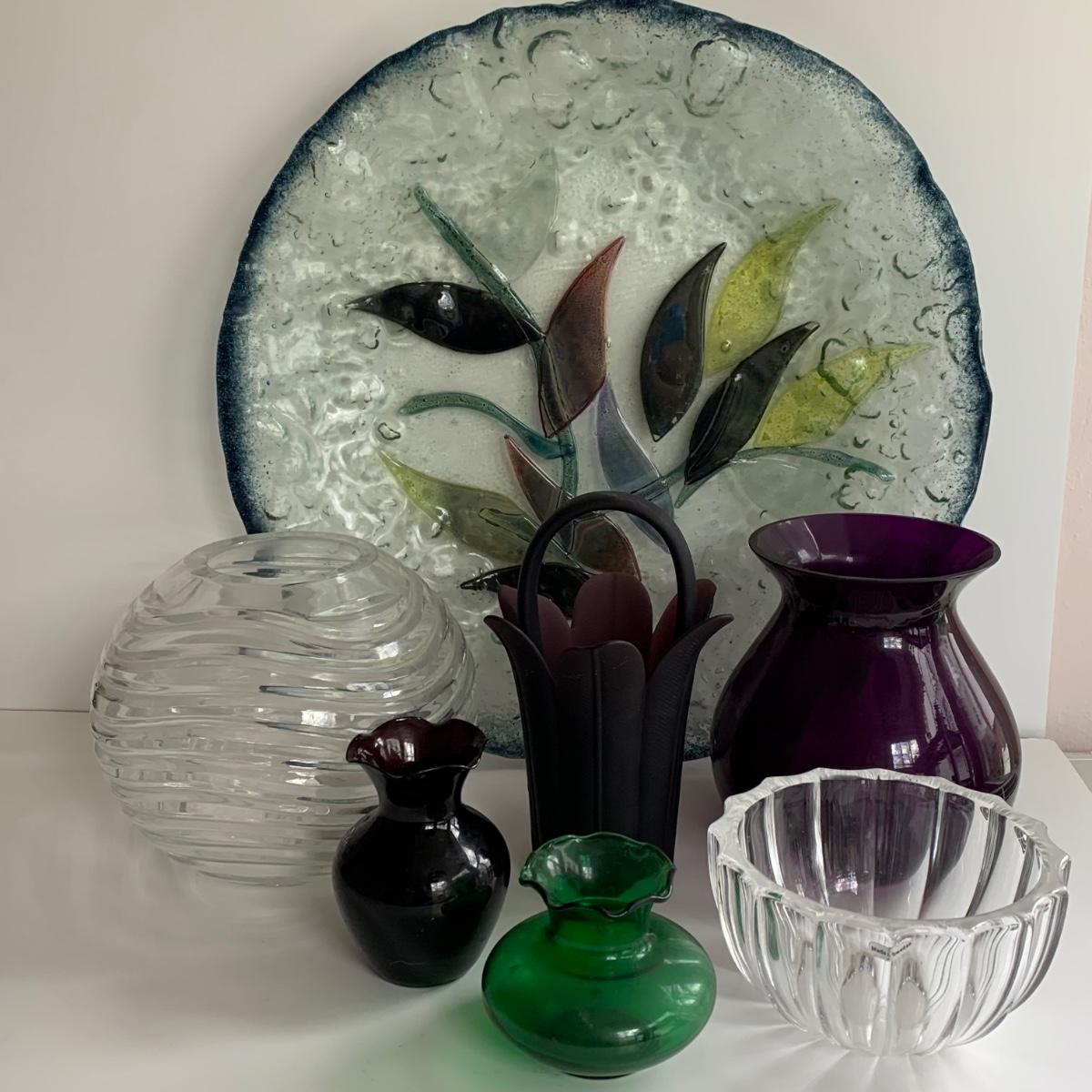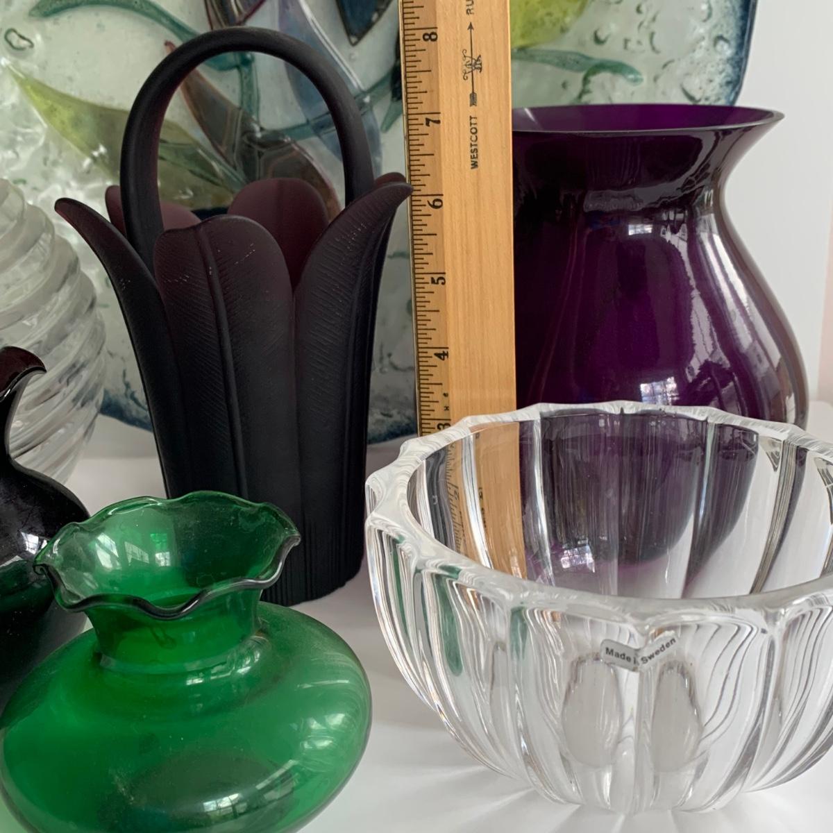 LOT 62: Glass Platter 18", Frosted Glass Purple Glass Flower Vase, Glass Bowls & More
