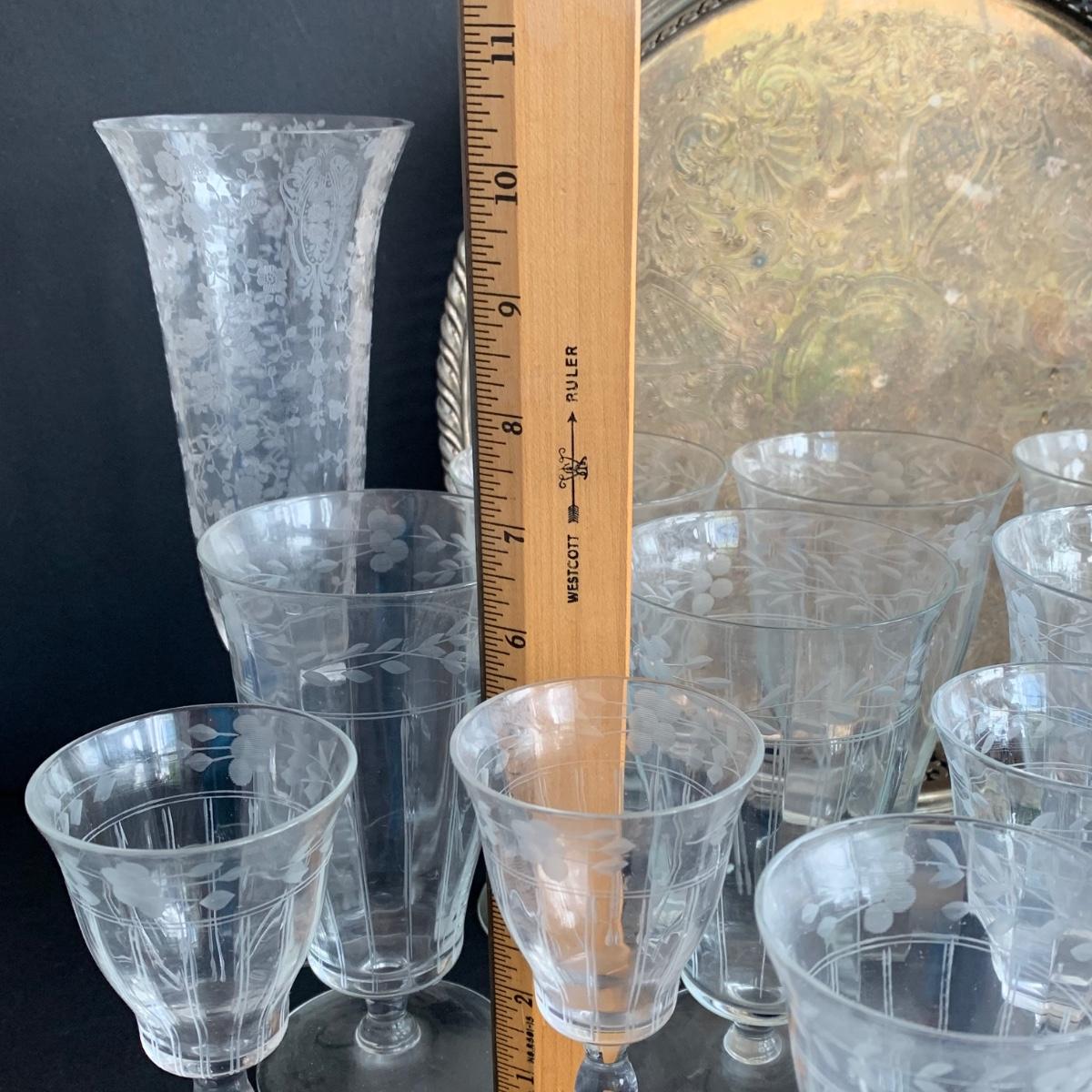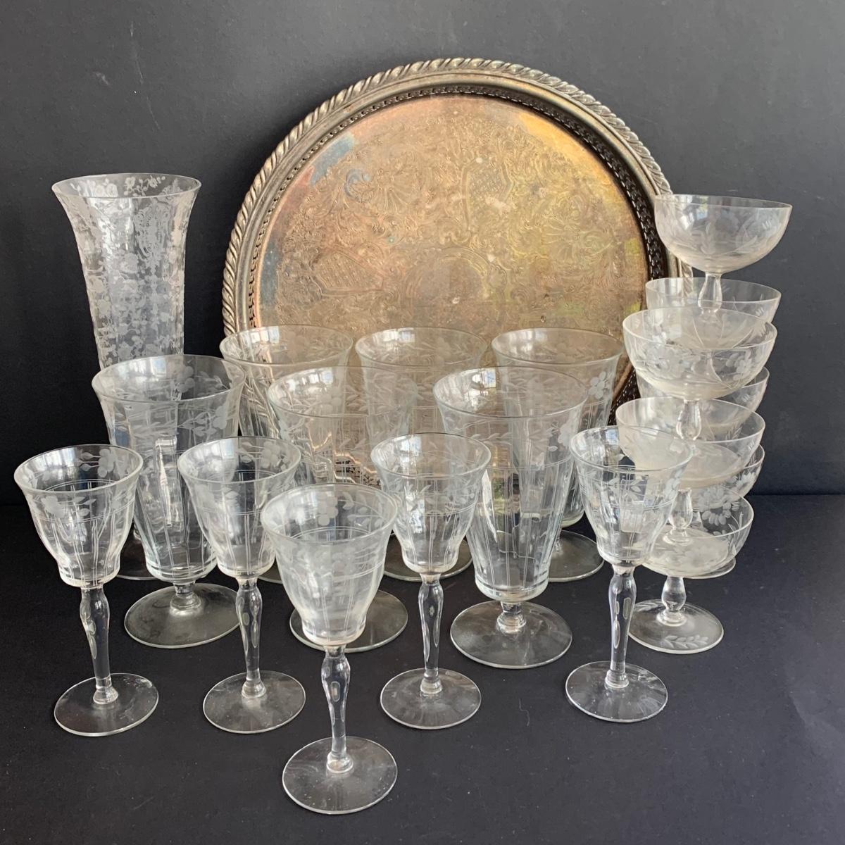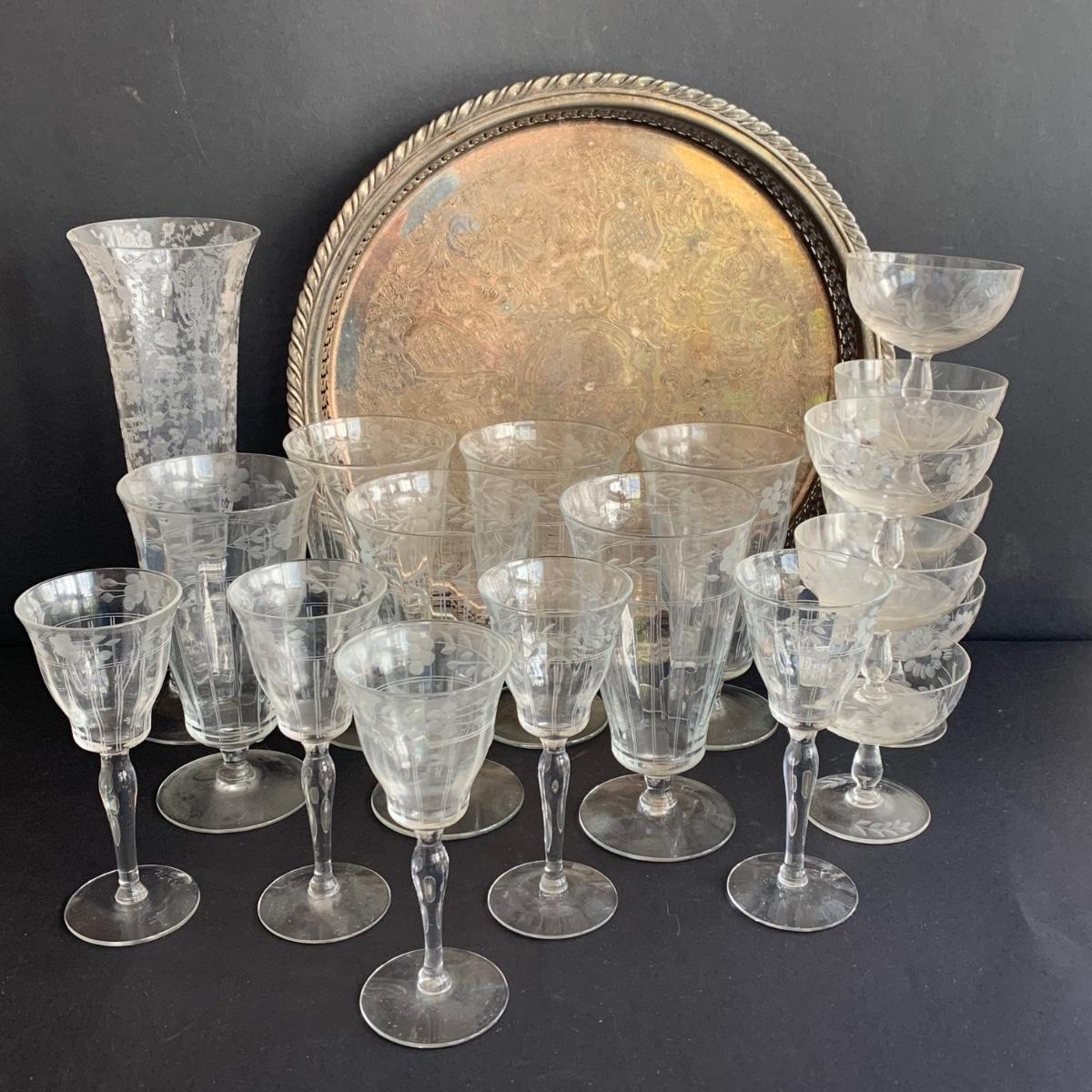 LOT 63 Elegant Etched Crystal, Lolita "Last Night Out" Wine Glass & Silver Plated Serving Tray