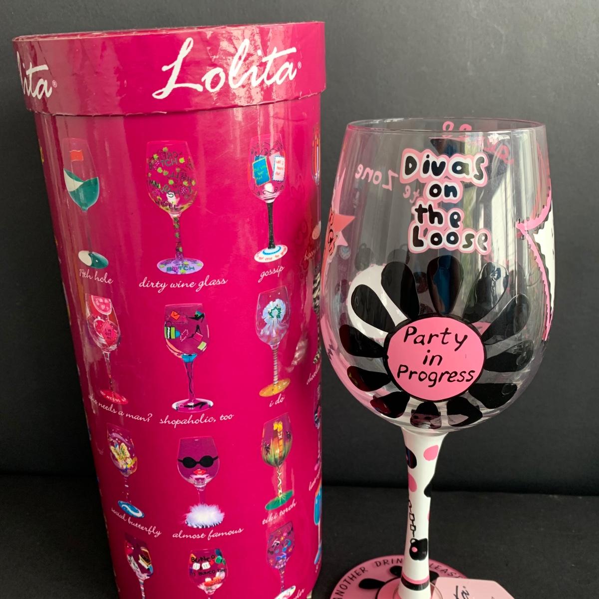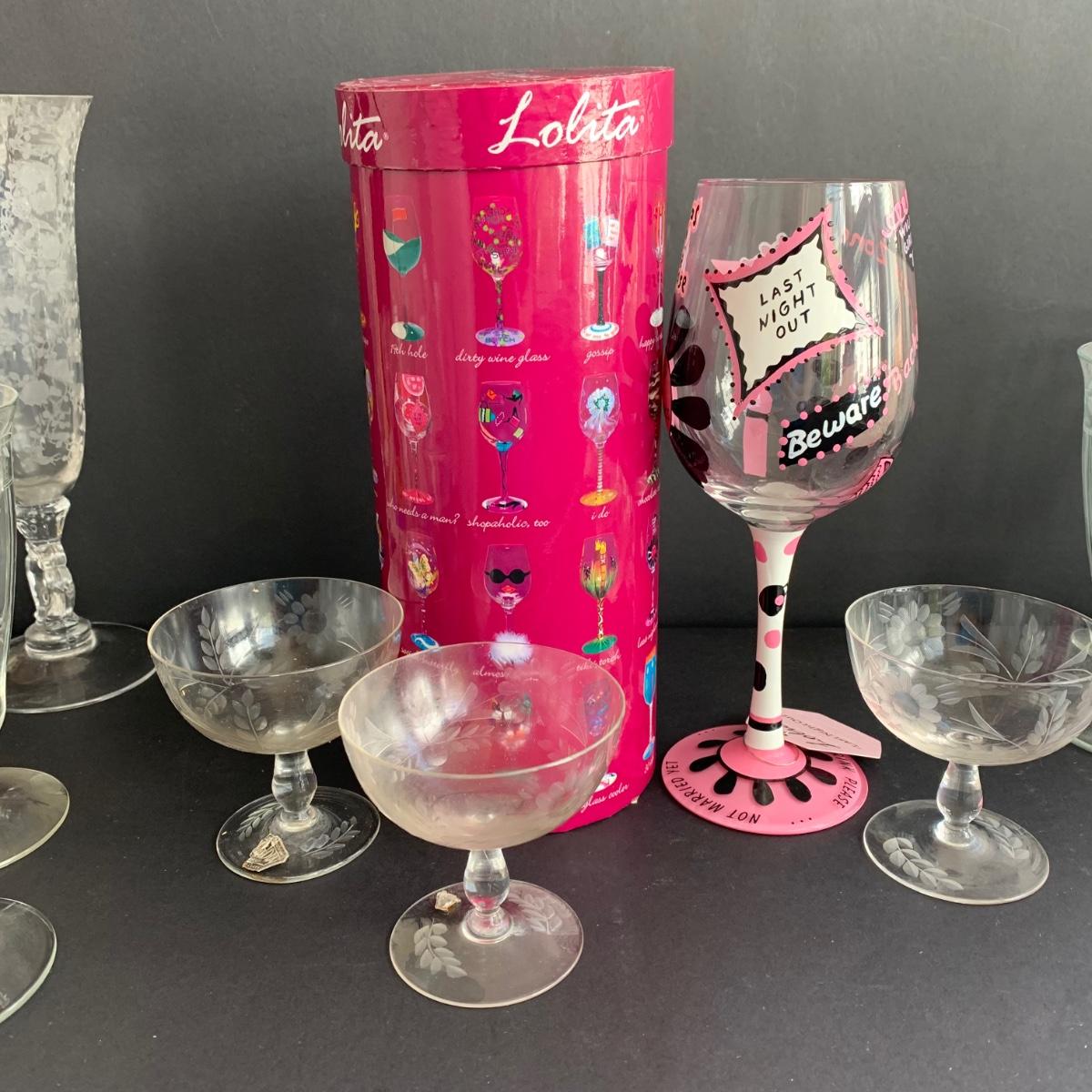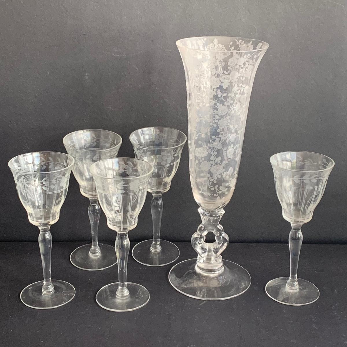 LOT 63 Elegant Etched Crystal, Lolita "Last Night Out" Wine Glass & Silver Plated Serving Tray