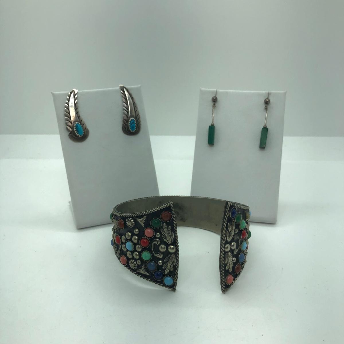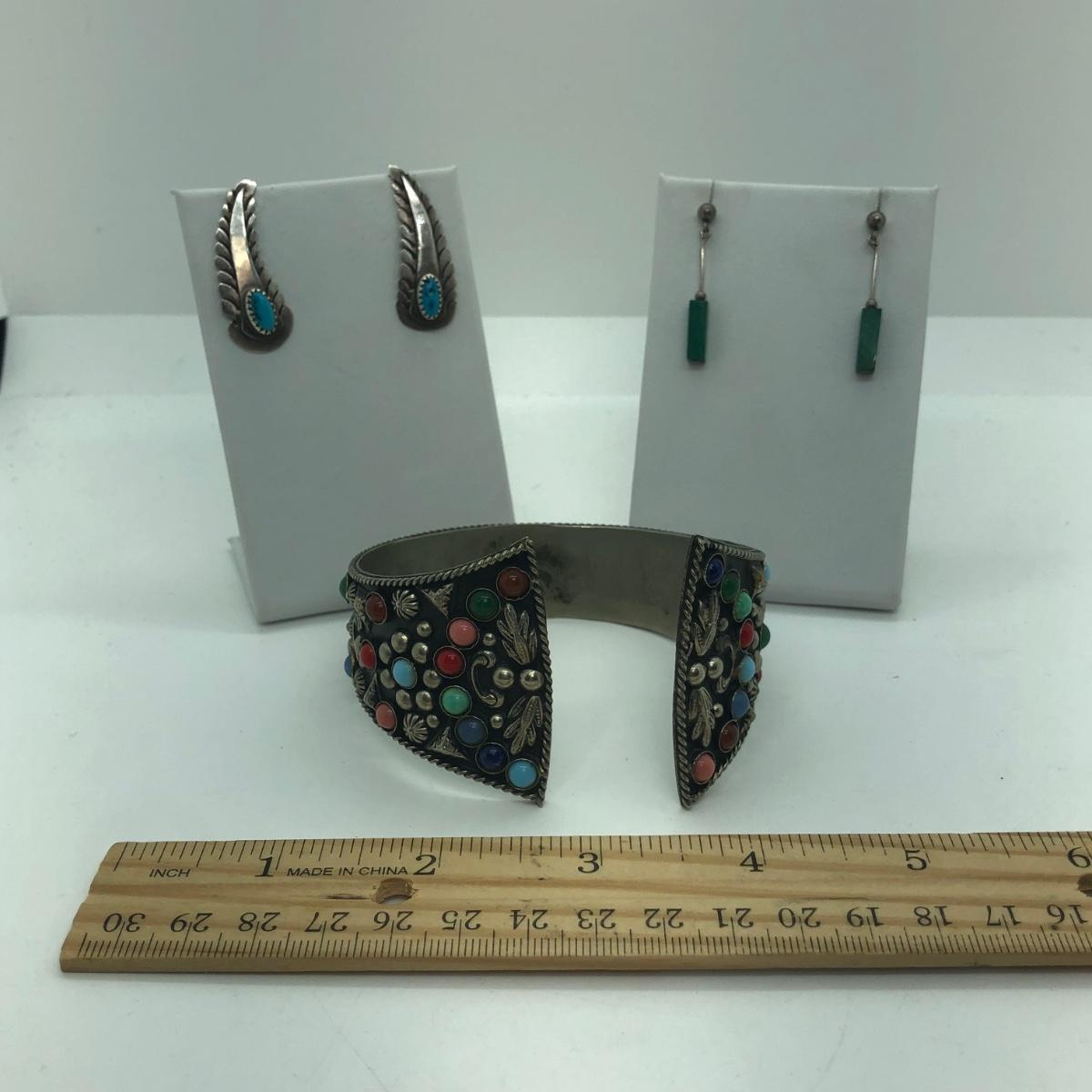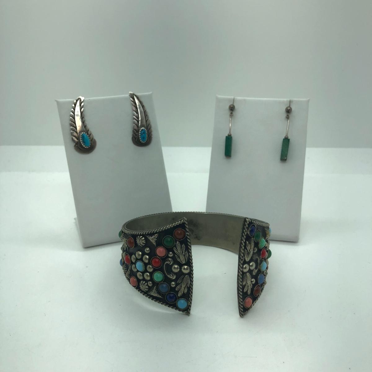LOT 87M: Alpacca Sterling Silver Cuff Bracelet & 2 Pairs of Earrings