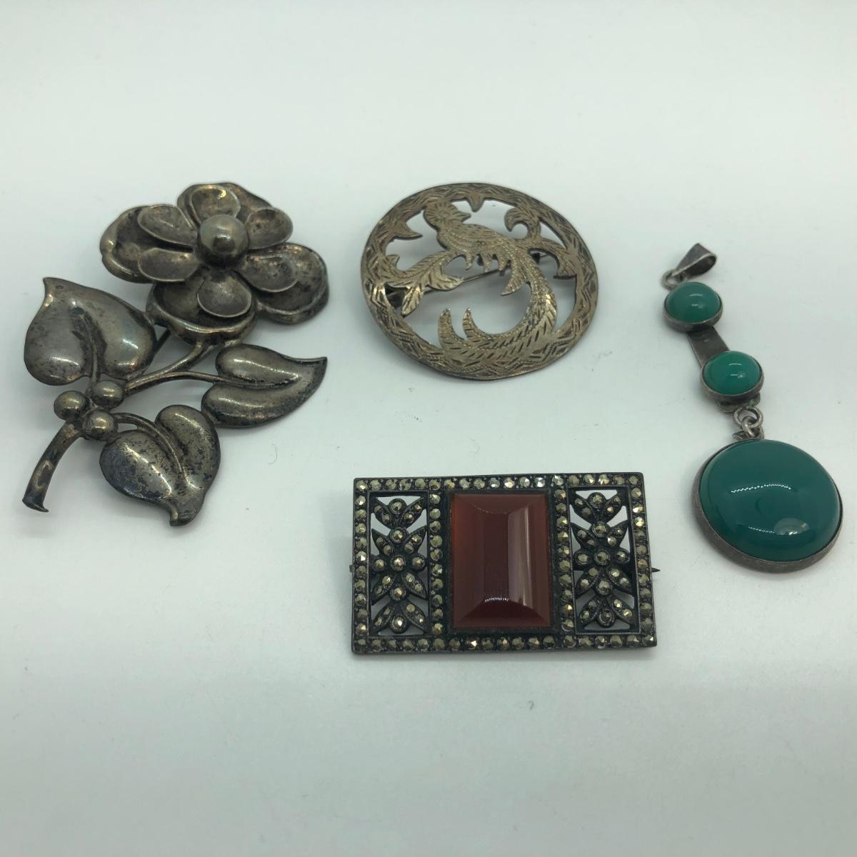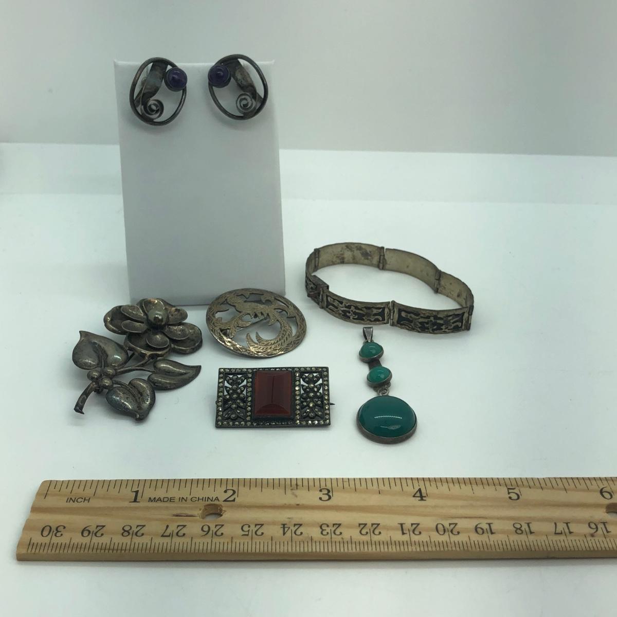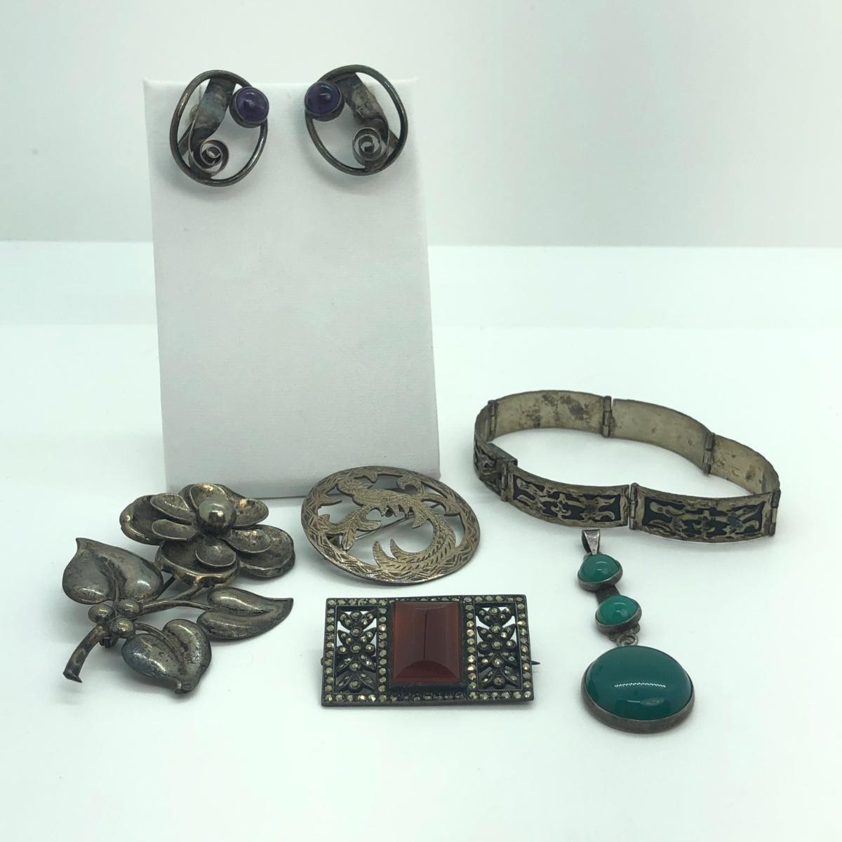 LOT 92M: Silver Screwback Earrings, Silver Brooches, Bracelet & Aqua Pendant
