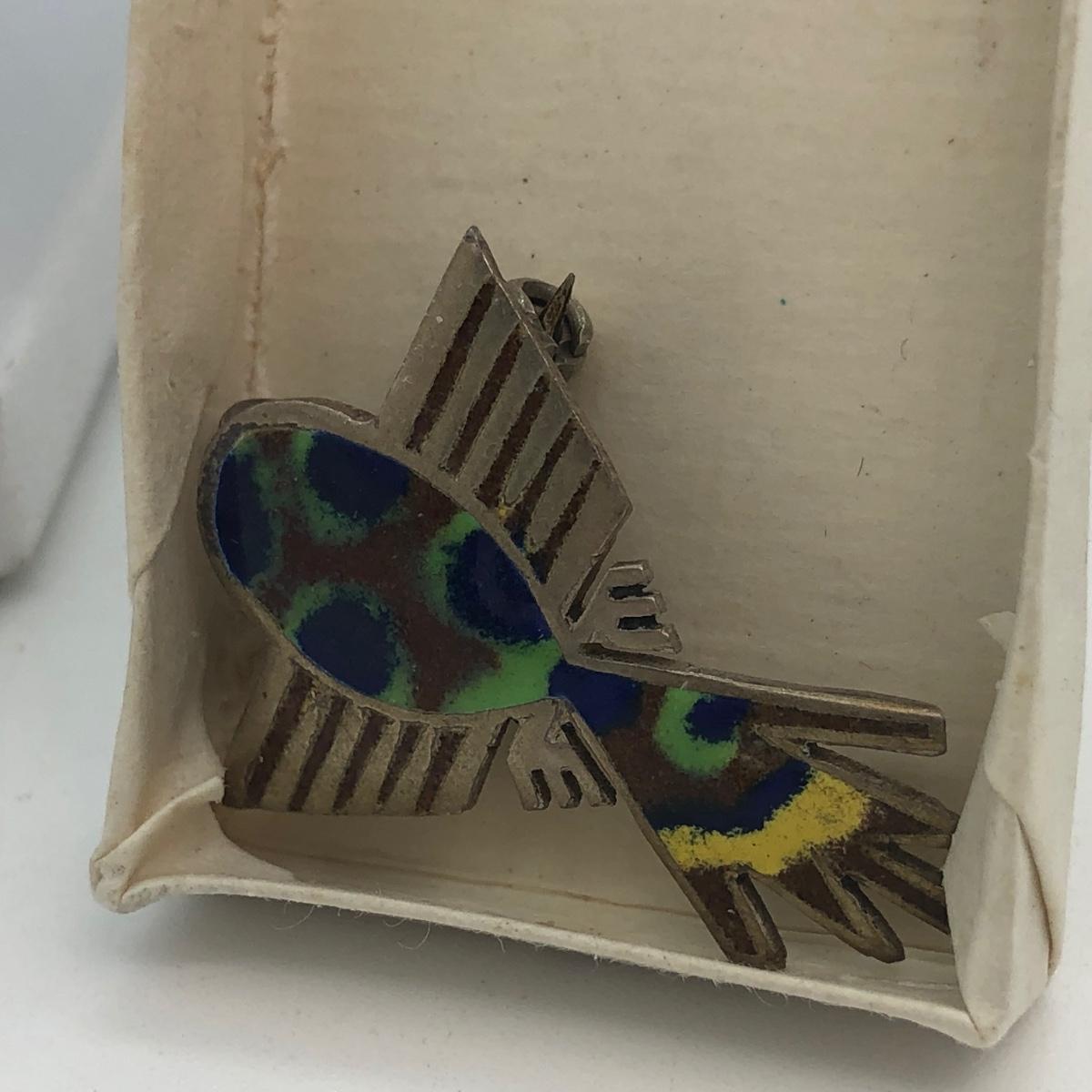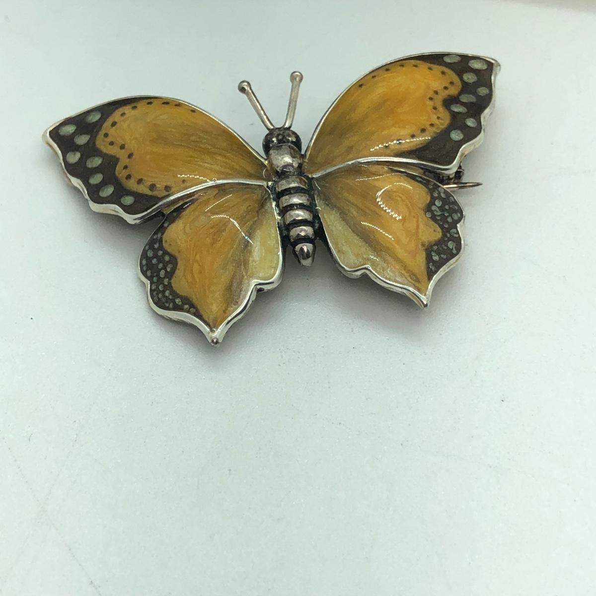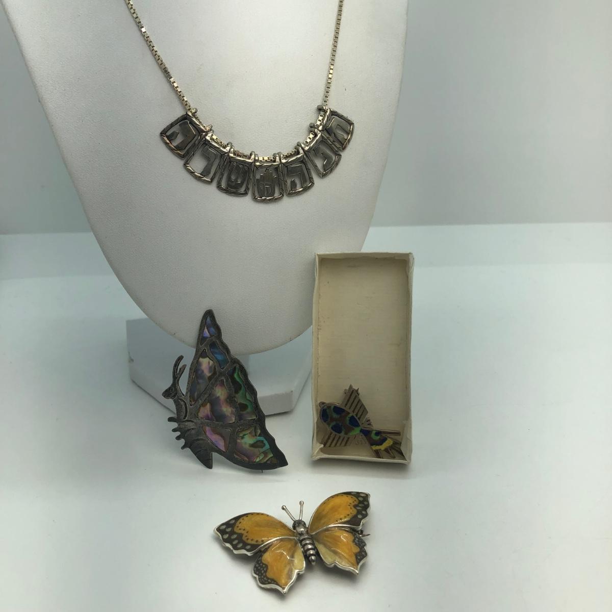 Two butterfly pins made with silver and a bird shaped pin and a Kolbo Inc. necklace.