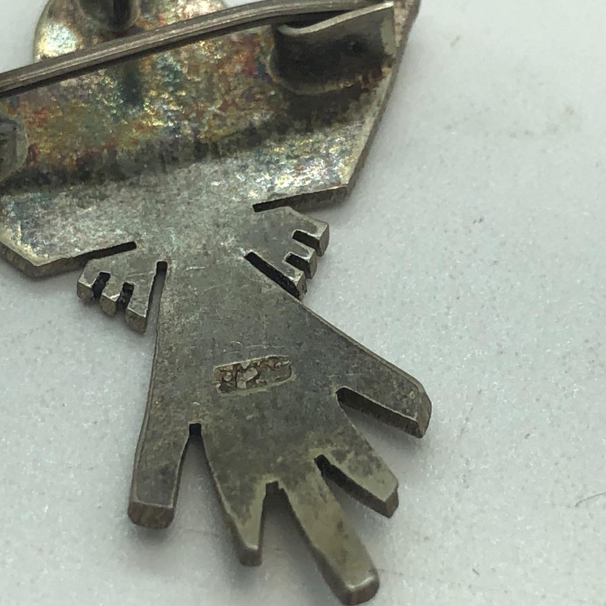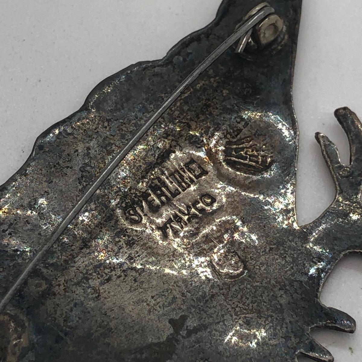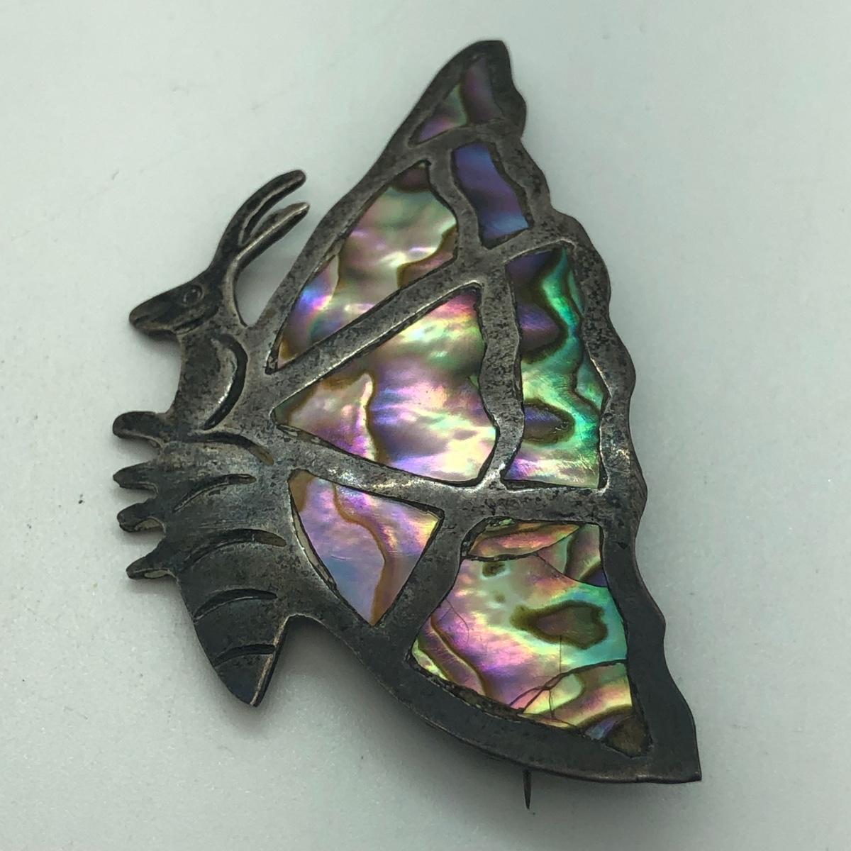 Two butterfly pins made with silver and a bird shaped pin and a Kolbo Inc. necklace.