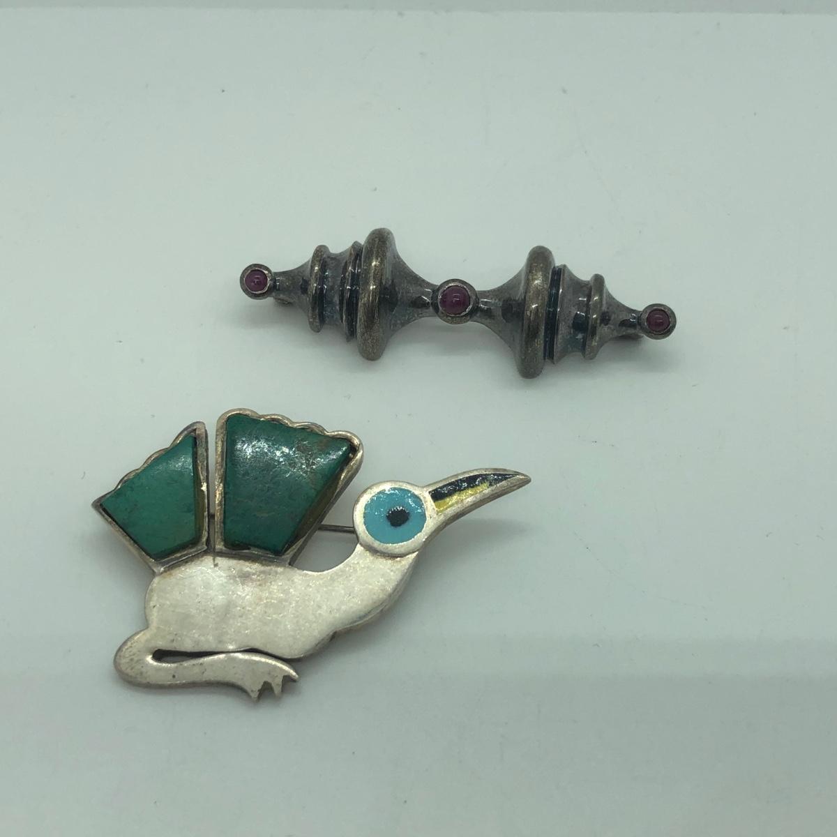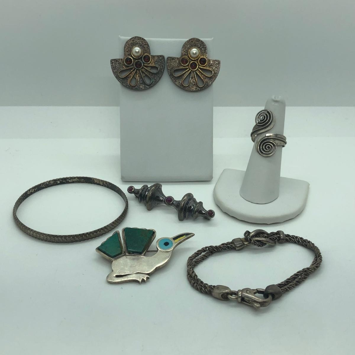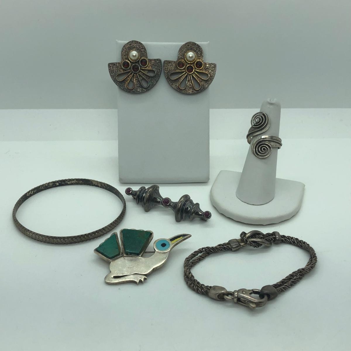LOT 94M: Silver Pierced Earrings, Bird Pin, Bracelets, & Silver Ring from Mexico