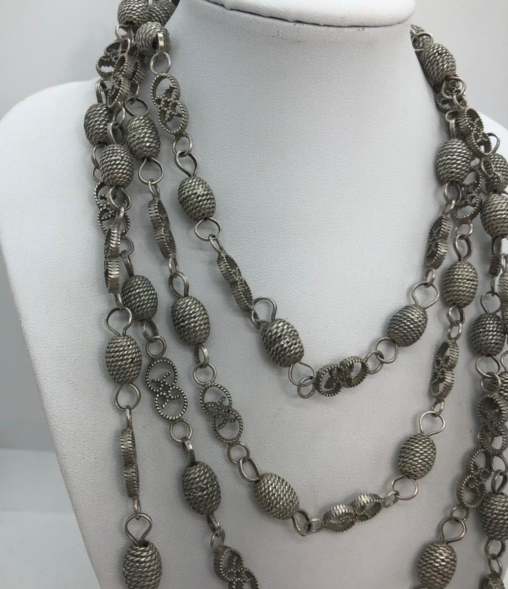 One long silvertone necklace, pictured twisted and layered. Two bracelets and two pins.