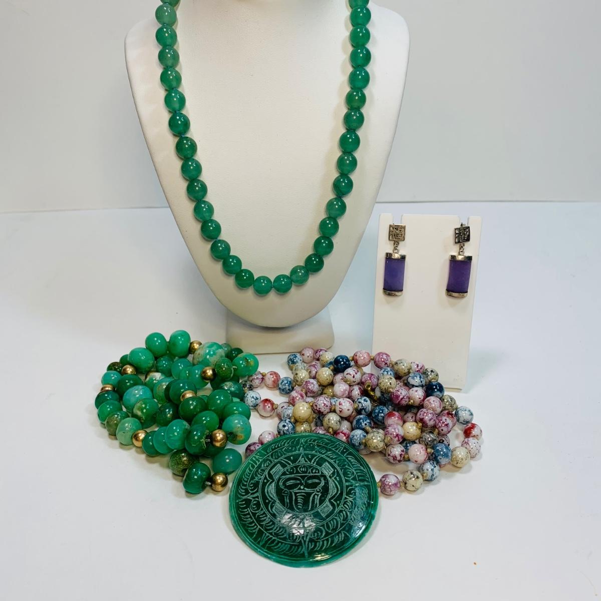 LOT 103: Jade Necklaces & Pierced Post Earrings & Multi Colored Beaded Necklace