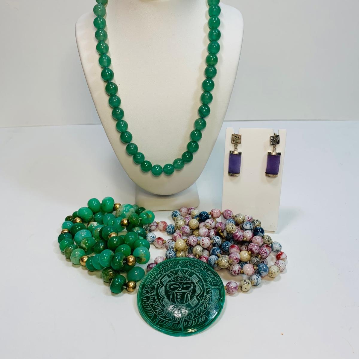 LOT 103: Jade Necklaces & Pierced Post Earrings & Multi Colored  Beaded Necklace