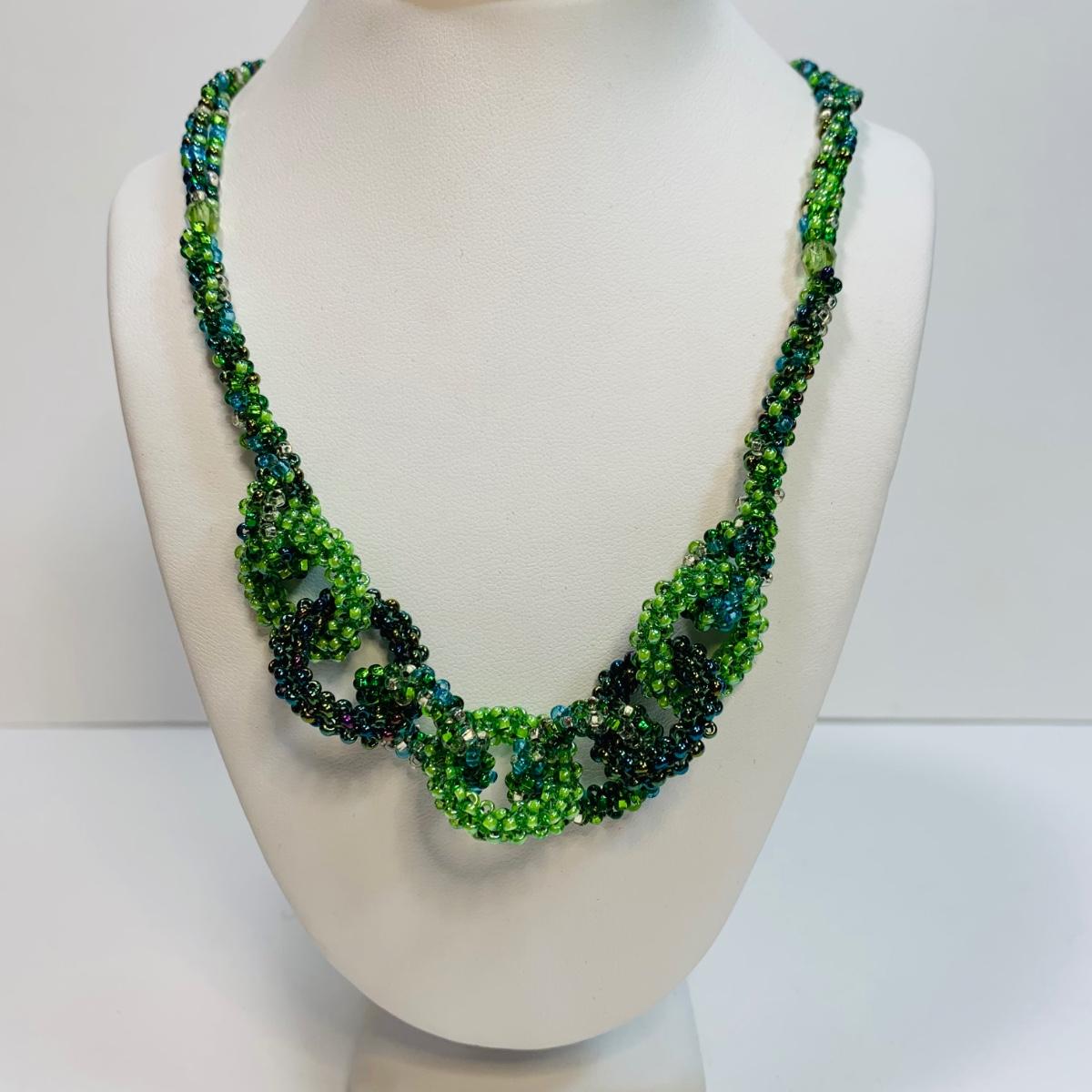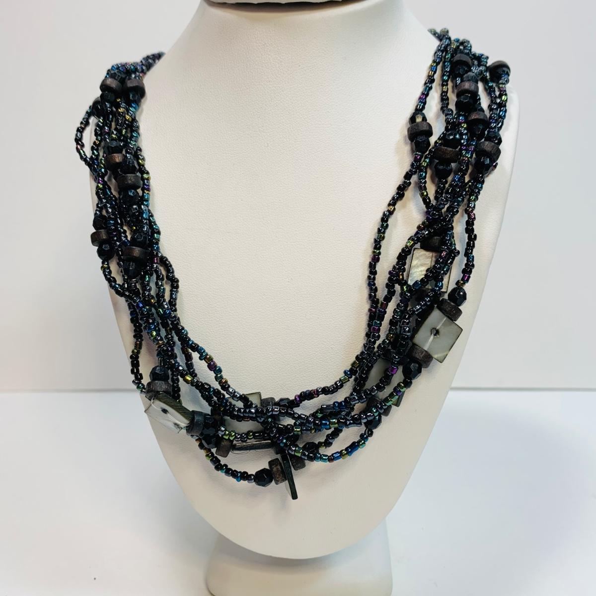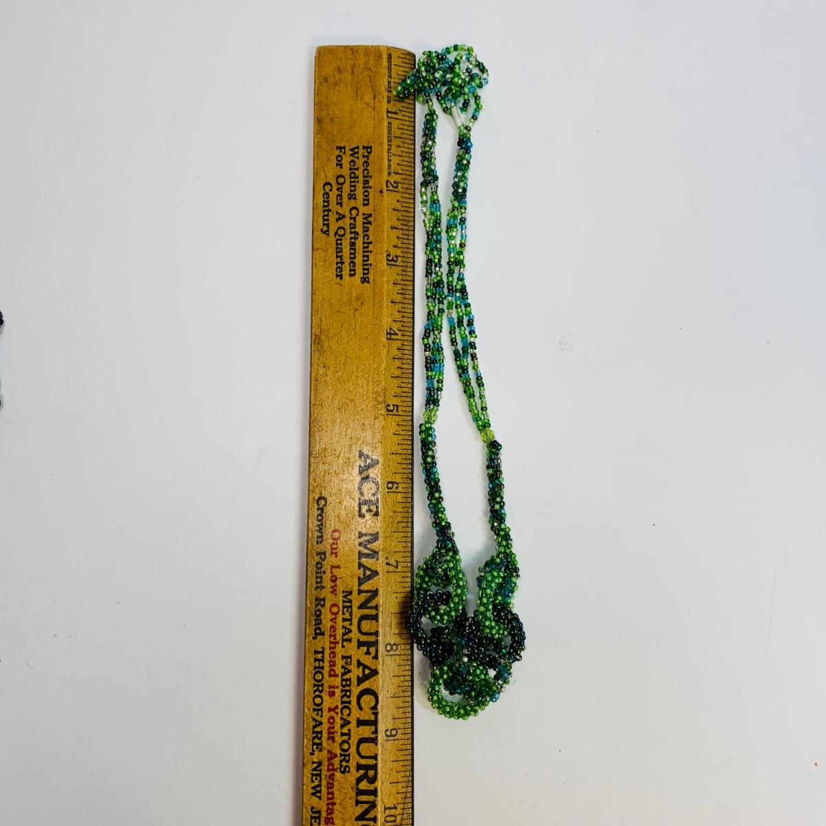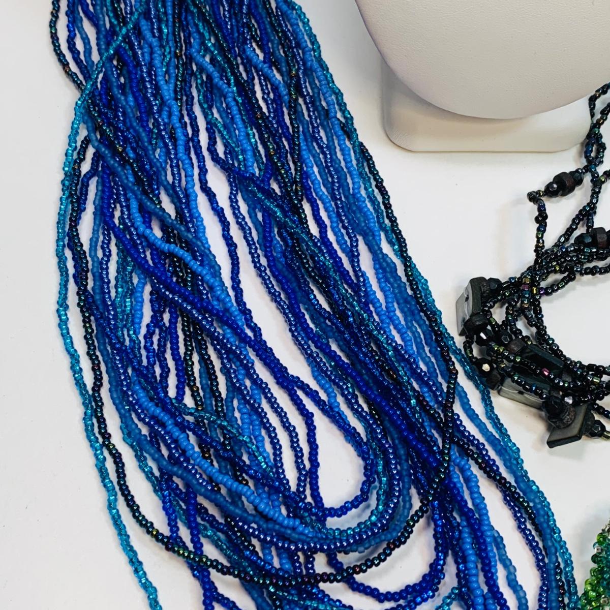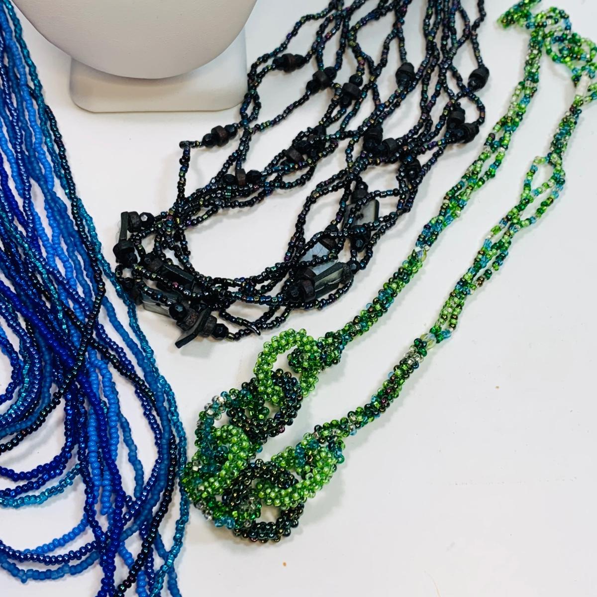 Collection of intricately beaded necklaces including a multi-strand necklace in blues, a green link style, black multi-stand and a choker style