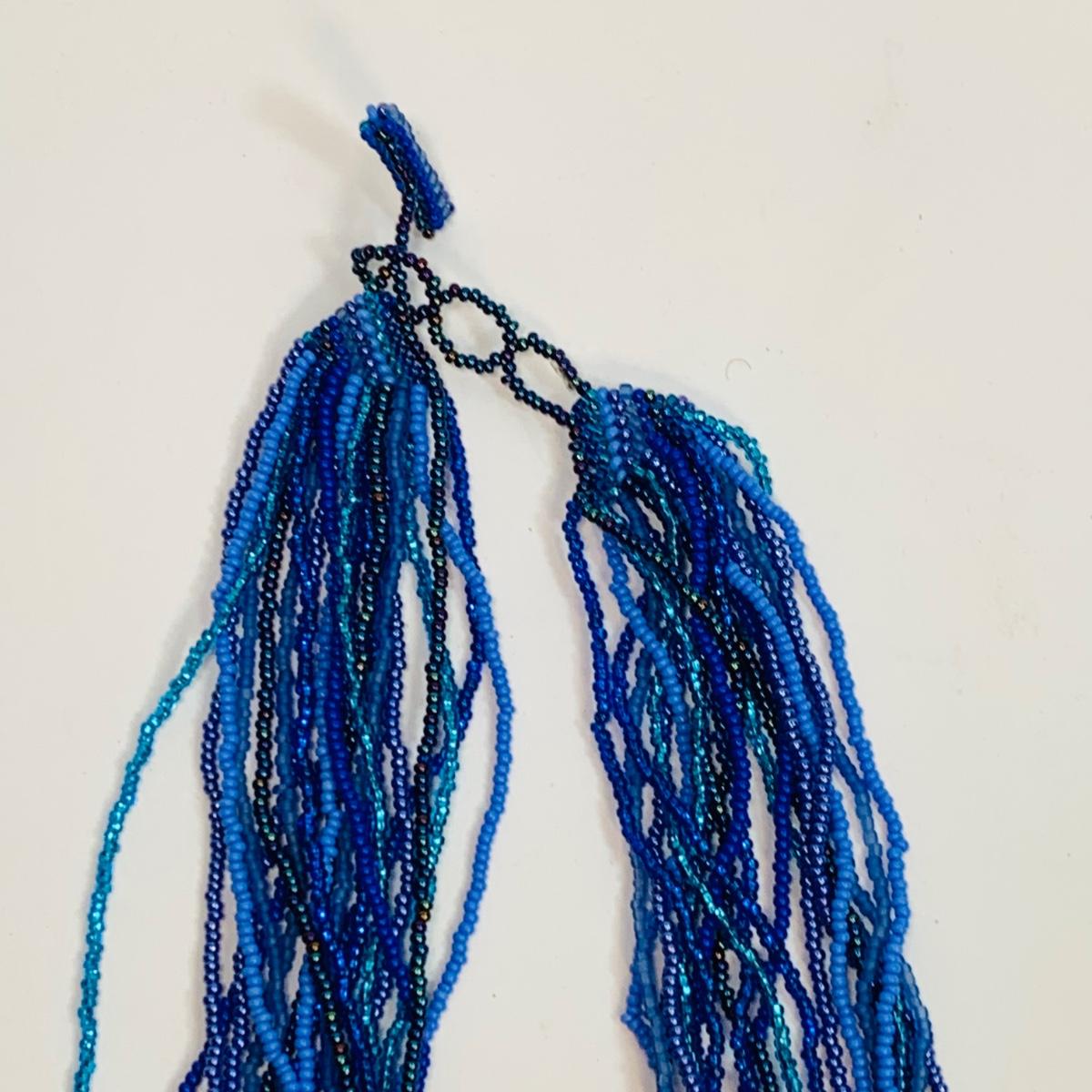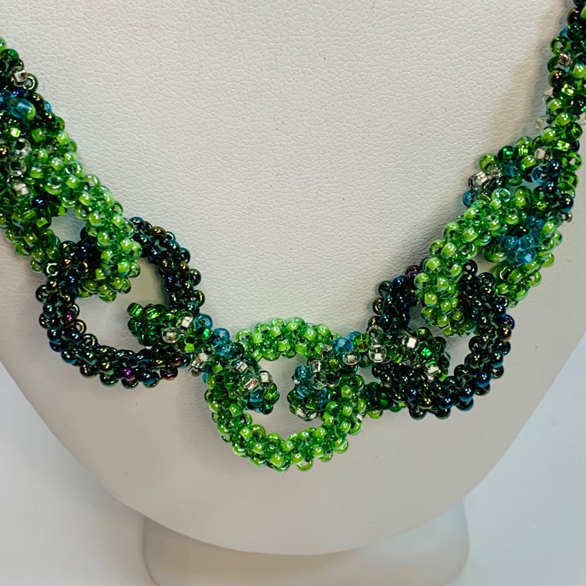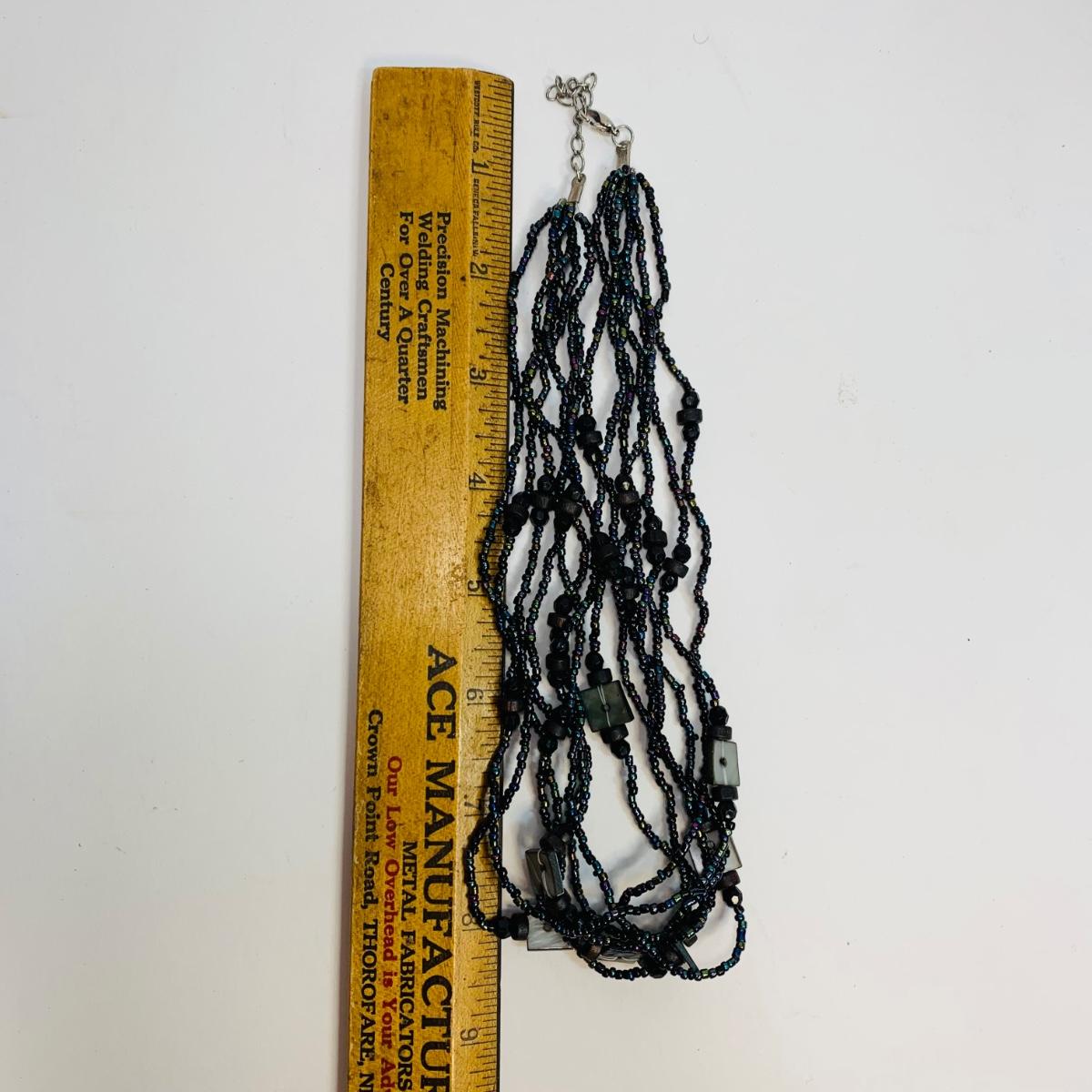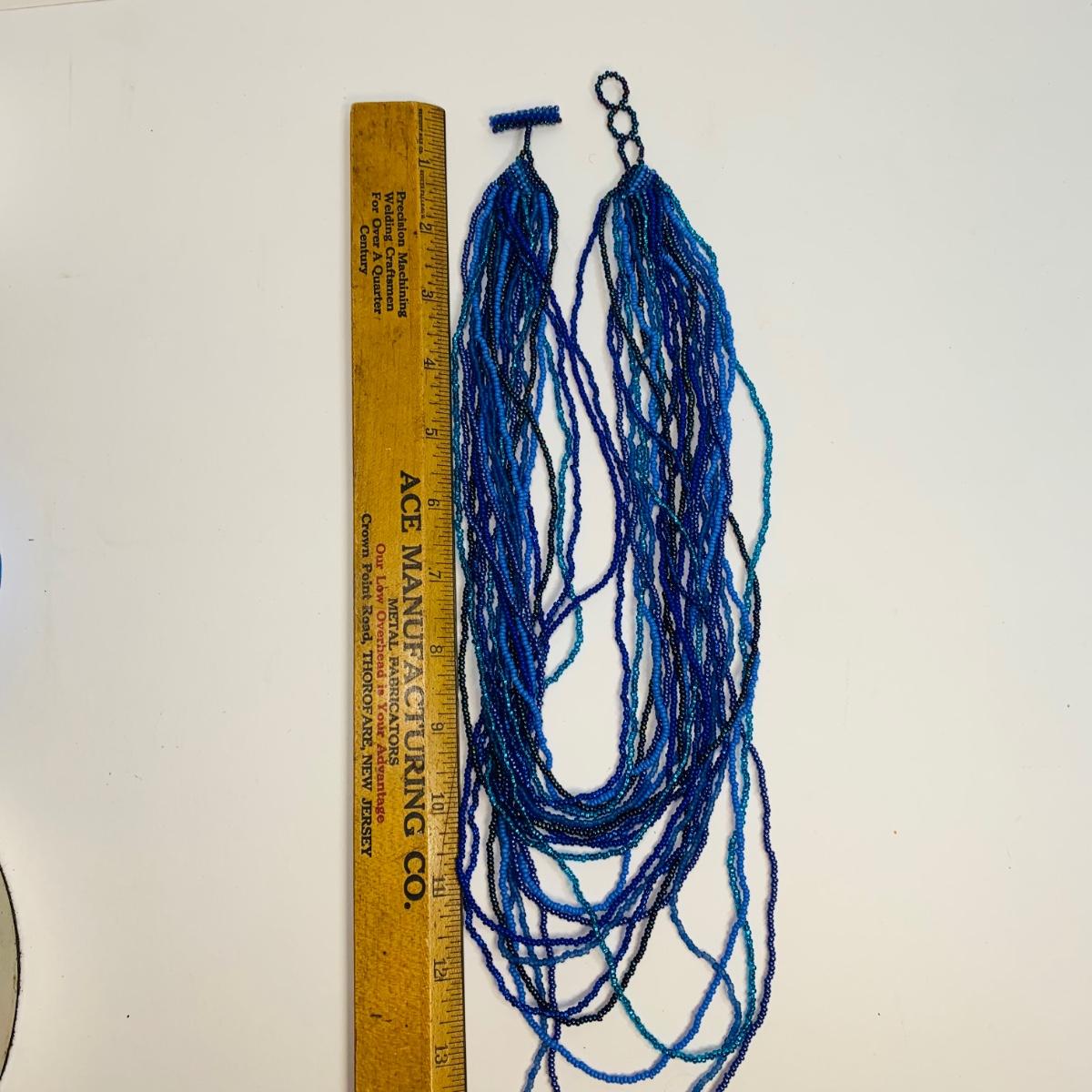 Collection of intricately beaded necklaces including a multi-strand necklace in blues, a green link style, black multi-stand and a choker style