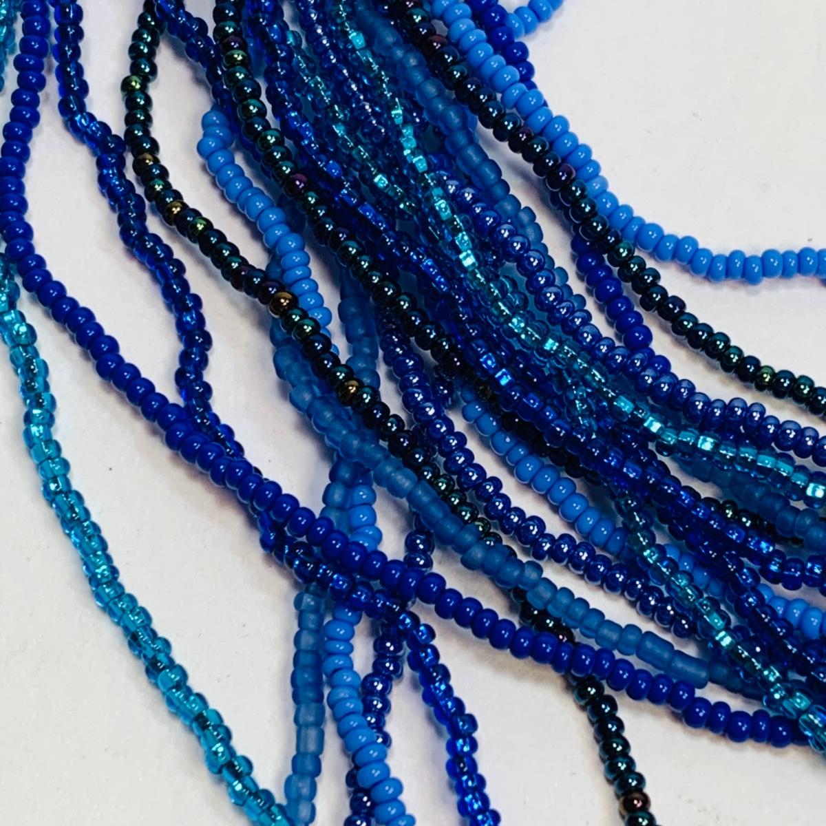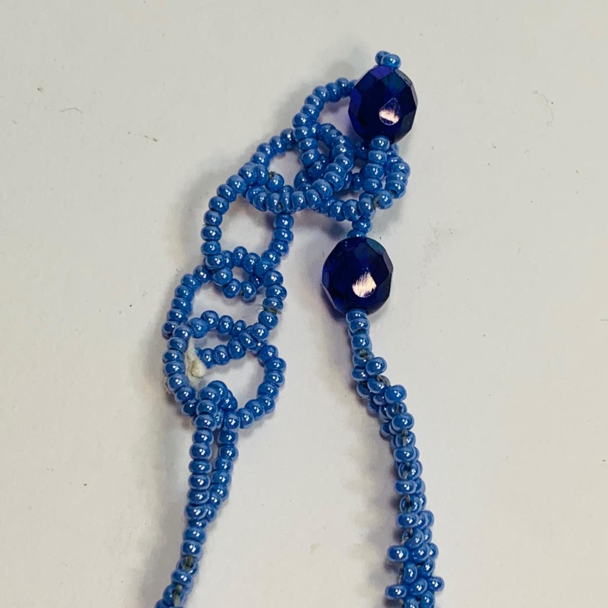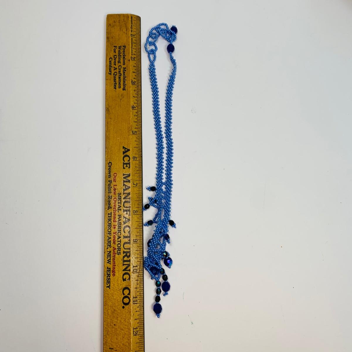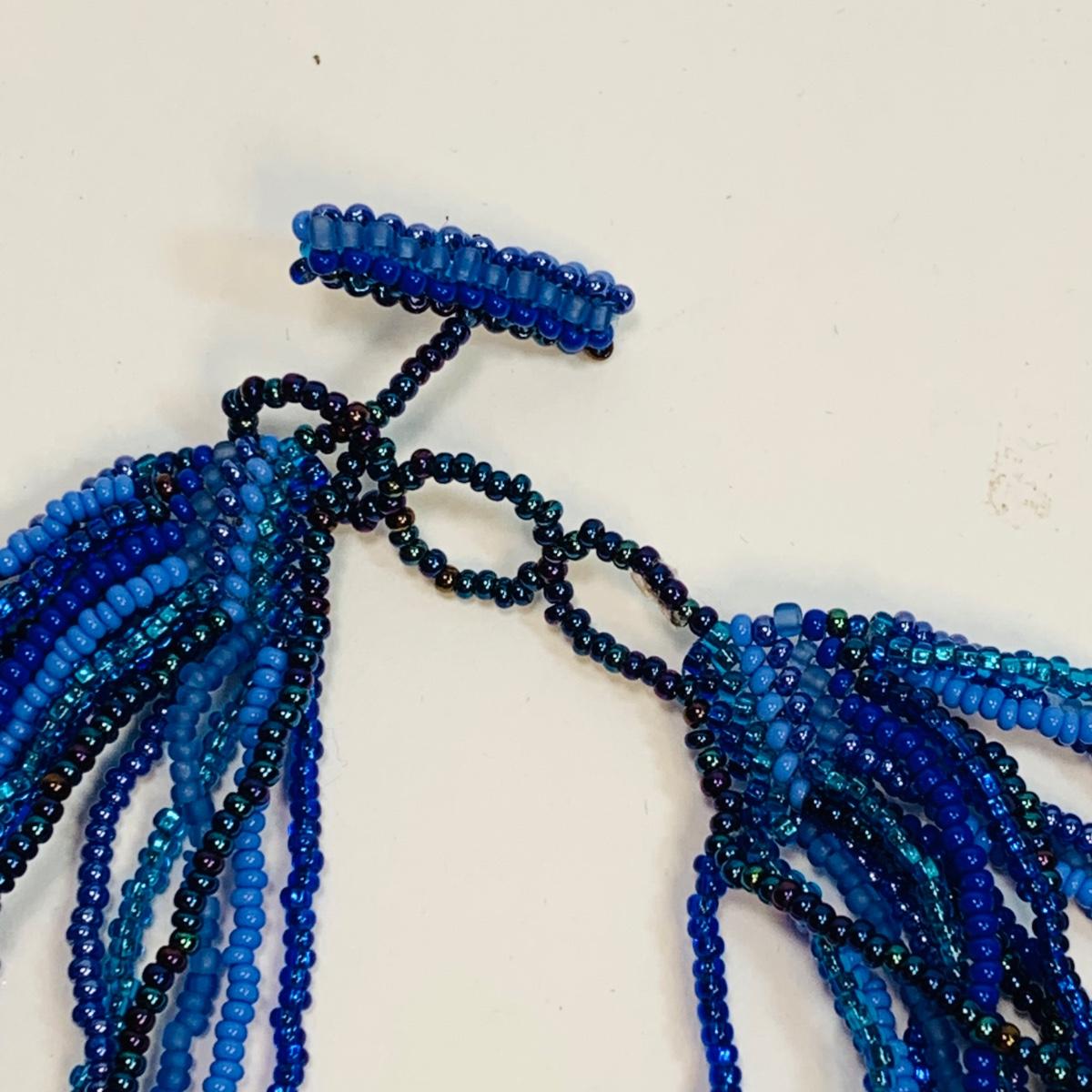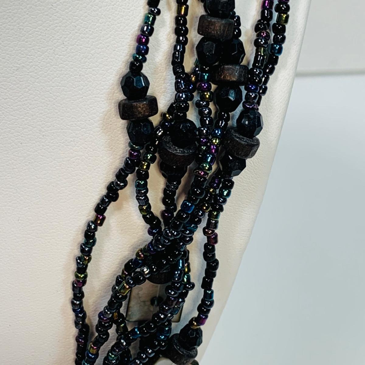 Collection of intricately beaded necklaces including a multi-strand necklace in blues, a green link style, black multi-stand and a choker style