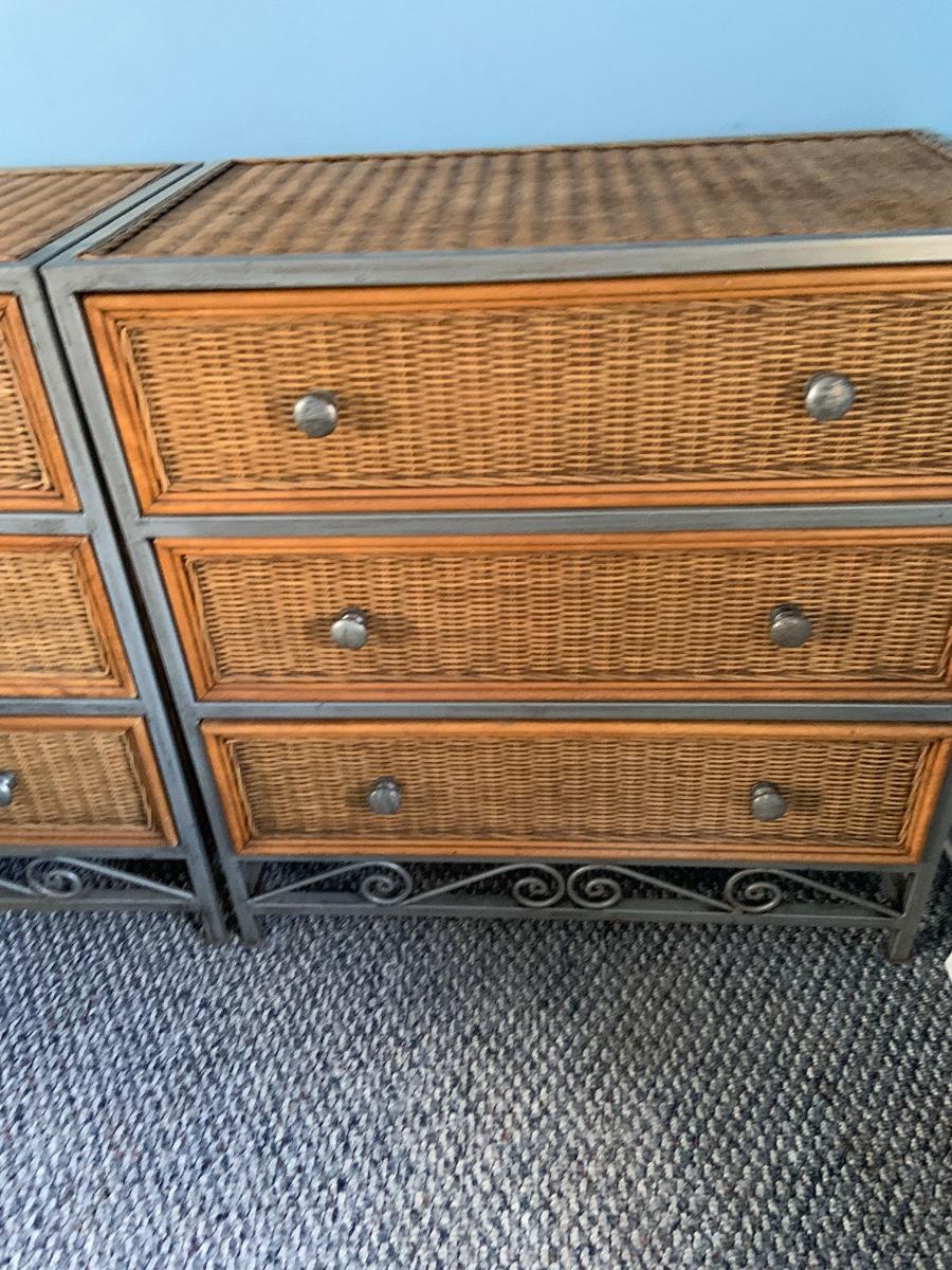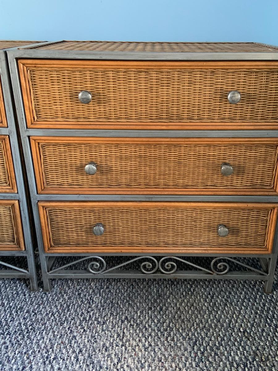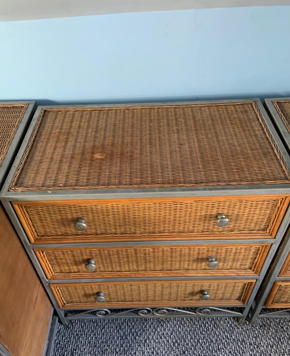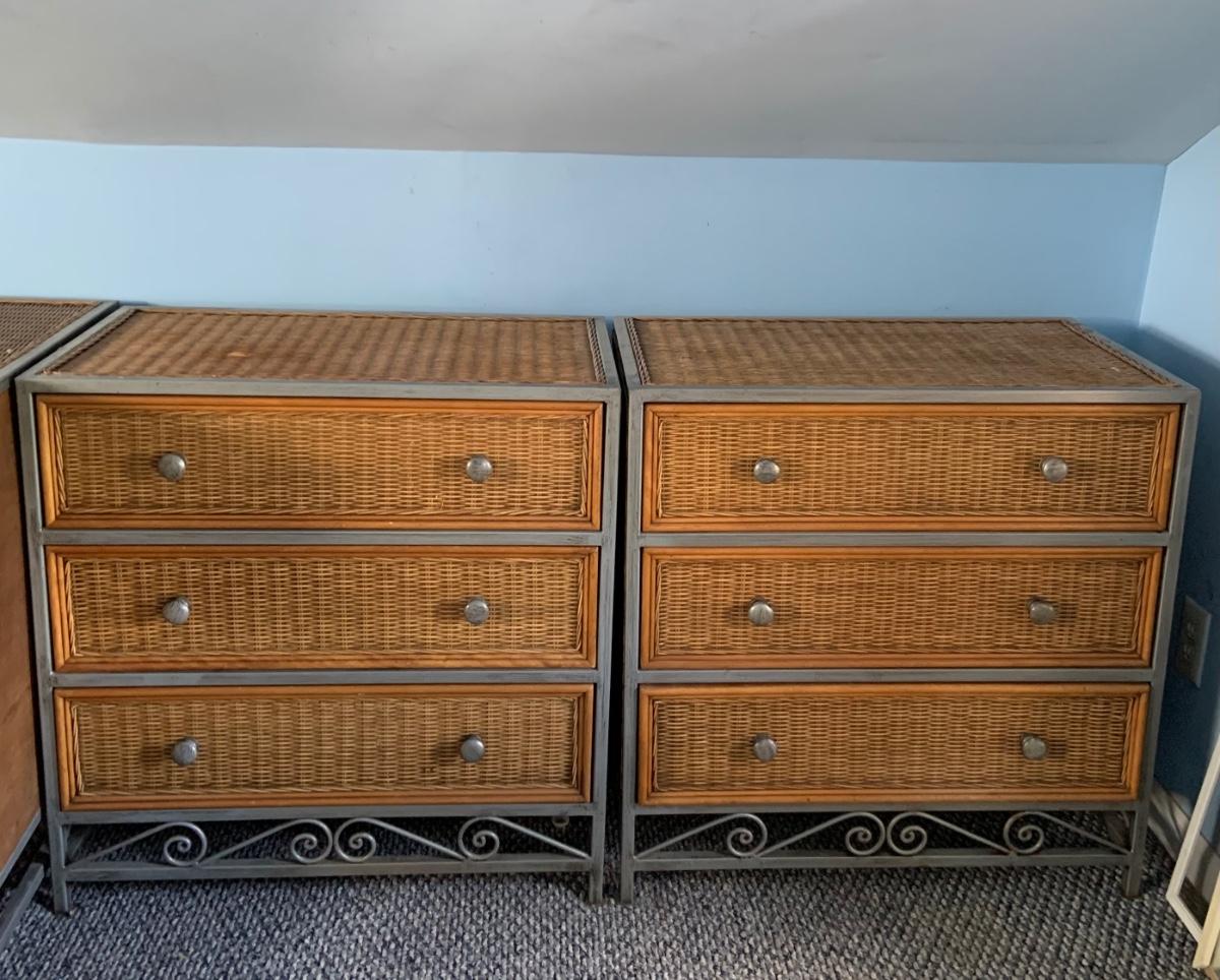 LOT:114G: Set of 2 Wicker/Ratan Three Drawer Dressers with Brushed Nickel Metal Frame and Knobes